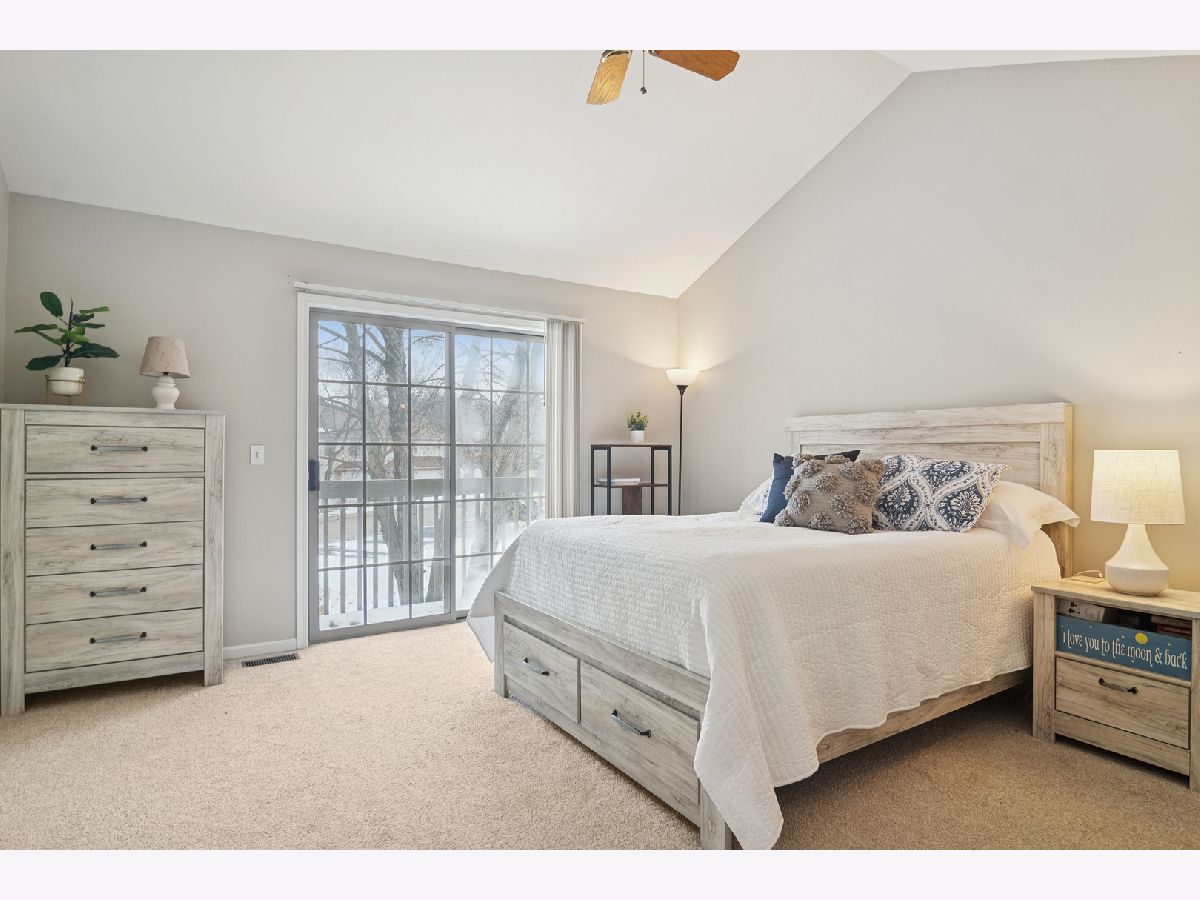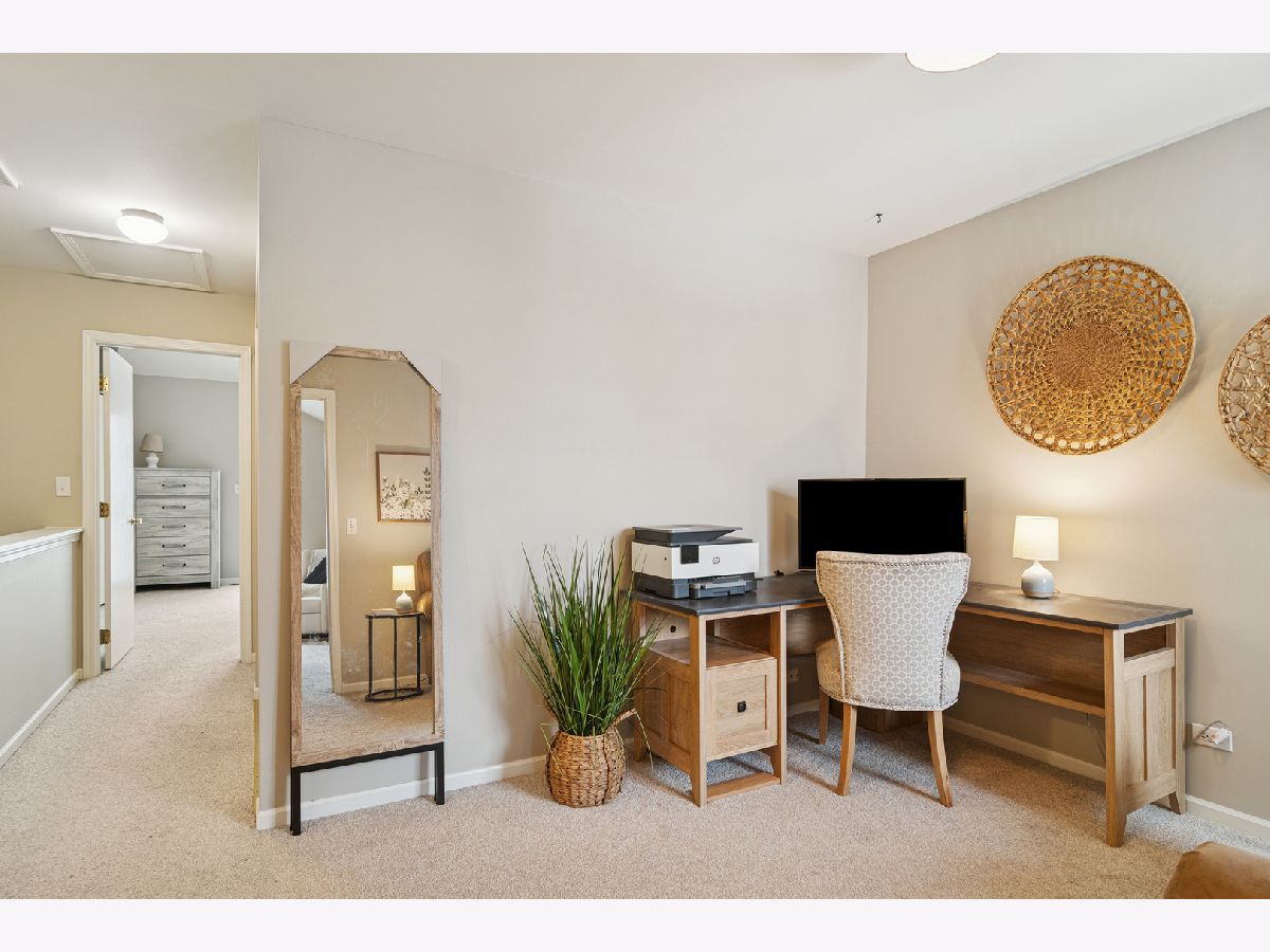 This lovely townhome in the desirable Wellington Park community offers all the space you need without the maintenance. The home has been updated with warm neutral finishes, rich vinyl plank flooring on the main level, and a beautifully remodeled primary bathroom. The kitchen features abundant cabinetry, stainless appliances, and an opening to the main living and dining areas, allowing you to interact with family and guests. A corner fireplace provides cozy vibes, and the large sliding doors allow you to enjoy outdoor views throughout the seasons. Easily access the balcony and relax with delightful tree top and pond views. Upstairs you'll find a generously sized primary suite with soaring ceilings, a wall of closets, remodeled en-suite bath with skylight and a private balcony-offering a place of serenity at the end of the day. On this level, you will also find a large second bedroom, laundry, and a loft-perfect for a home office, hobby, or sitting area. The finished basement adds another level of living with plenty of space for recreation and entertaining and enjoyable natural light. Imagine game days or movie nights with the convenience of the built-in wet bar. The location is steps from Palatine Hills Golf Course, walking trails, Deer Grove Forest Preserve, close to Deer Park shops and restaurants, easy access to downtown Palatine, METRA train, and area expressways. New furnace-2025, new washer, dryer, and dishwasher-2019. Other upgrades include recessed lighting and a smart thermostat.