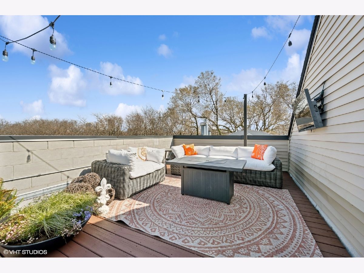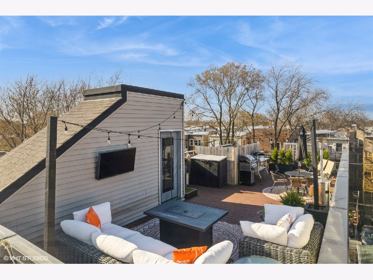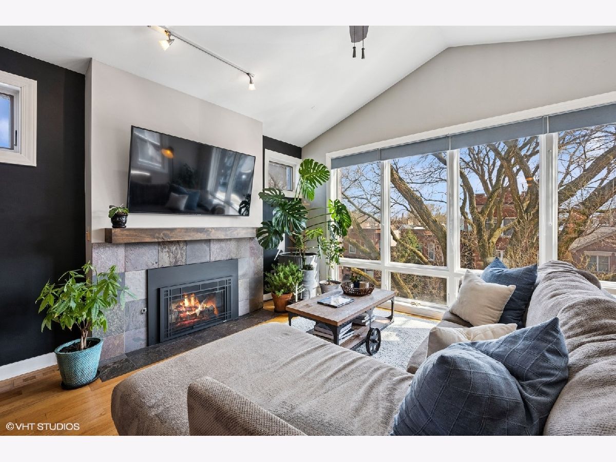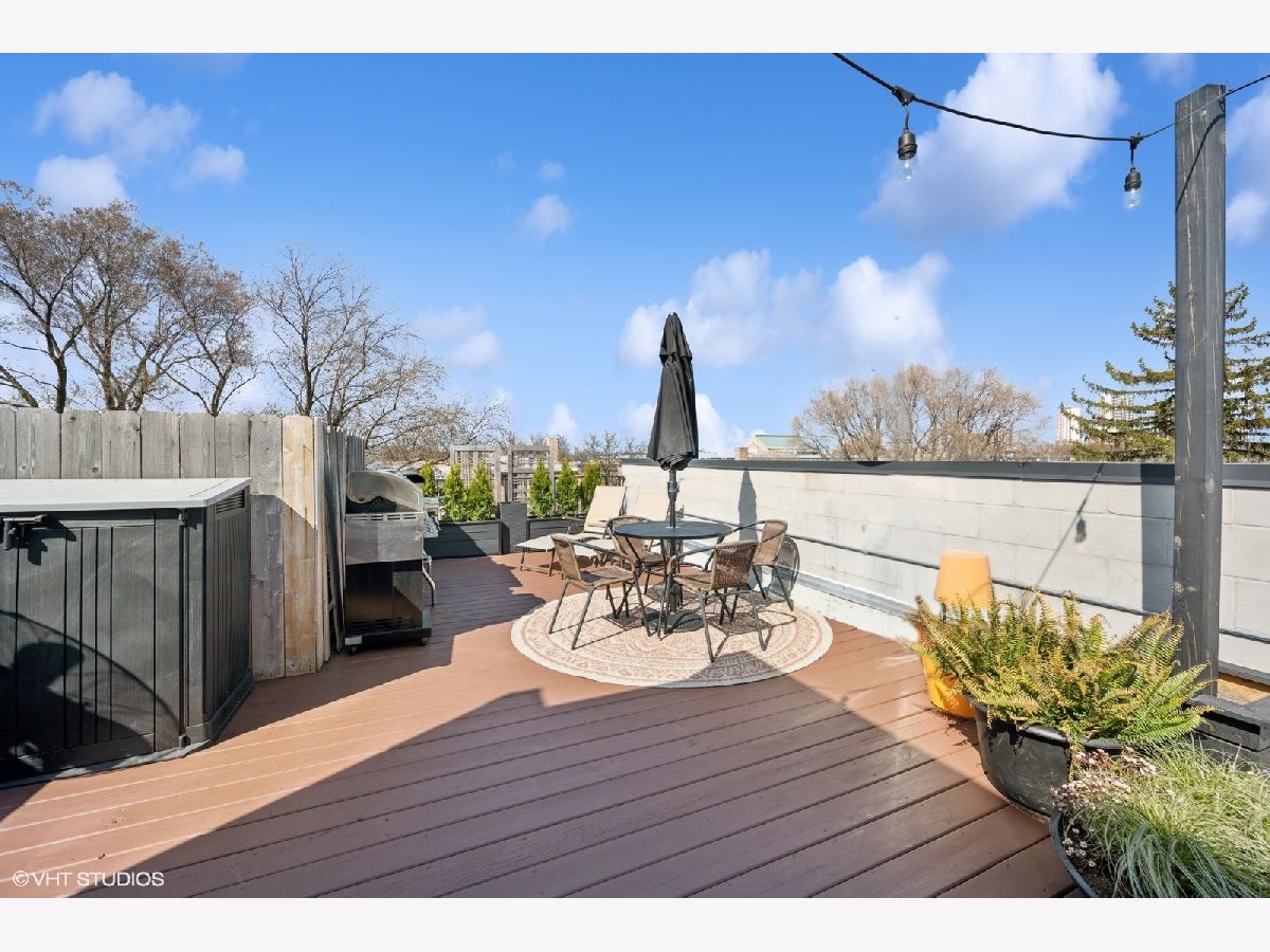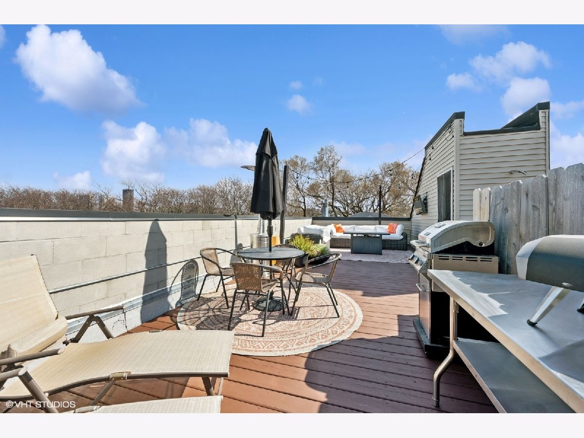 Welcome to Andersonville! This stunning, top-floor 2 bedroom/2 bathroom home has the highly sought after private roof deck you've been looking for. With cathedral ceilings, large south-facing windows, and exposure on all four sides, it has all the natural light you want on a quiet, tree lined street in one of the city's most desirable neighborhoods. The home features hardwood floors throughout, a gas fireplace, updated kitchen with 42" cabinets and island seating for entertaining. The split floor plan allows for privacy in both of the spacious bedrooms. Enjoy your large, private roof deck that has direct access from stairway in unit. Perfect for grilling, gardening, watching movies under the stars and entertaining this summer! In addition to the private roof- there is also a private back deck, and a common yard space with new artificial turf. Storage closet in basement. Garage parking included. New HVAC and smart thermostat in 2022. Enjoy all of what the neighborhood has to offer, with Gethsemane Garden Center on the corner, or stroll down Clark Street to enjoy countless restaurants and shops. Access the city with less than 15 minute walk to the new Peterson/Ridge Metra station or CTA Red line with soon to be completed modernization project. Enjoy the best of Chicago summers at the Kathy Osterman beach, also only a 15 minute walk away!