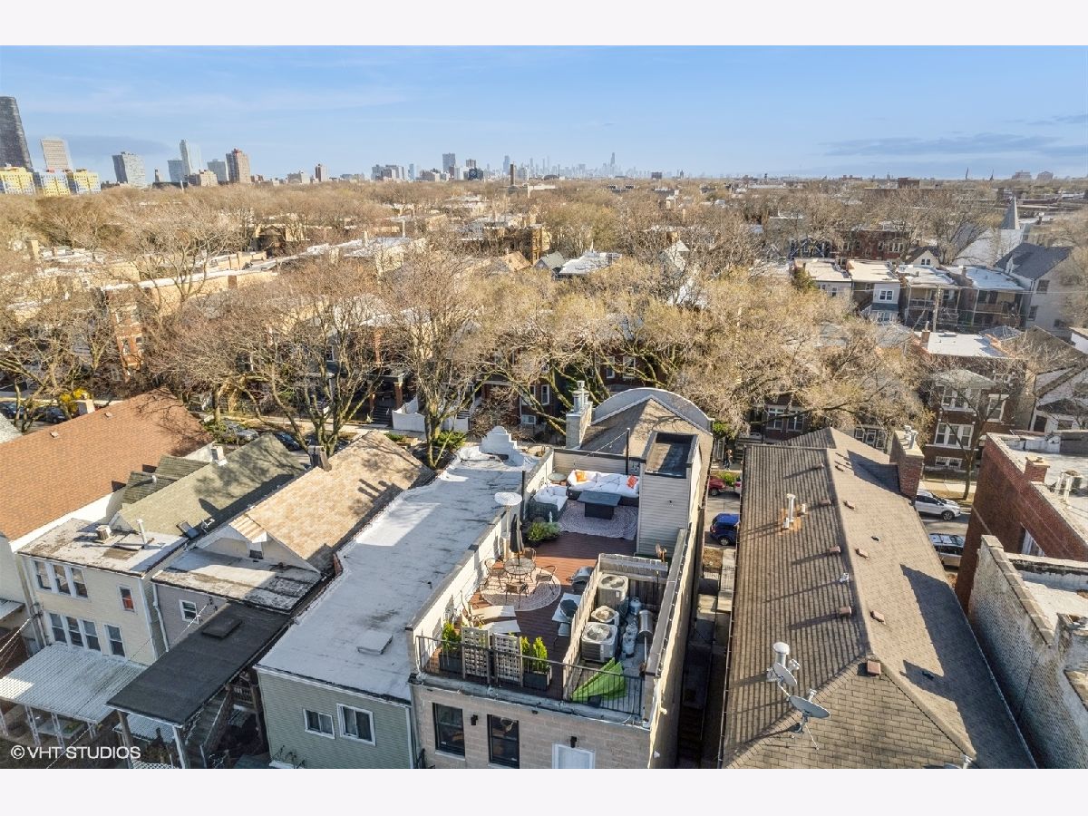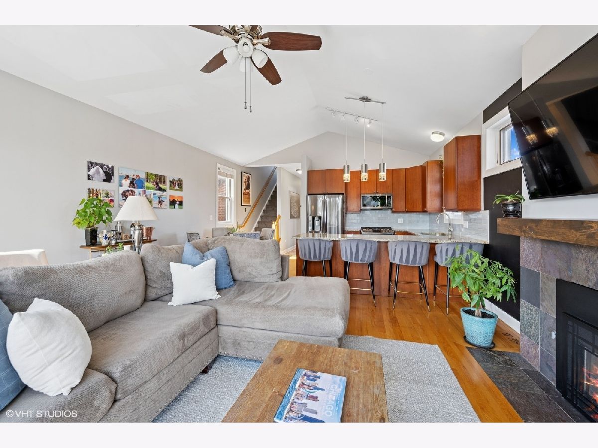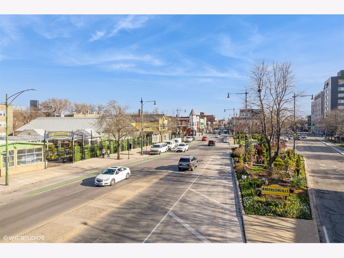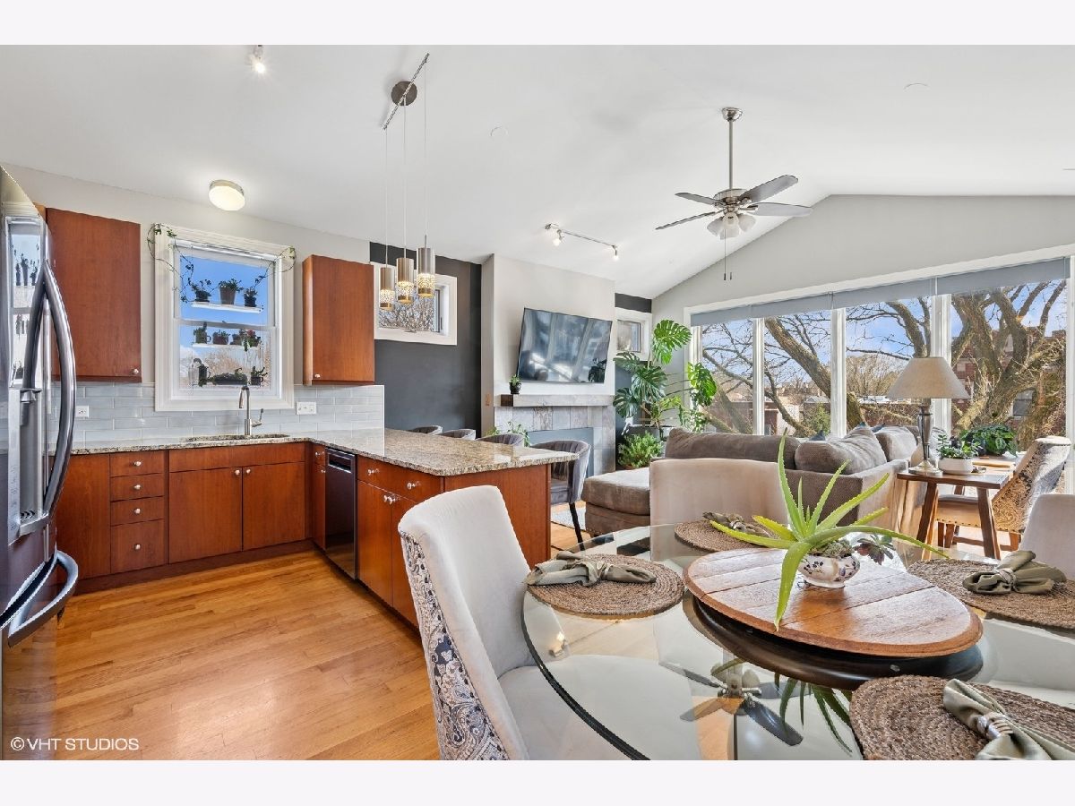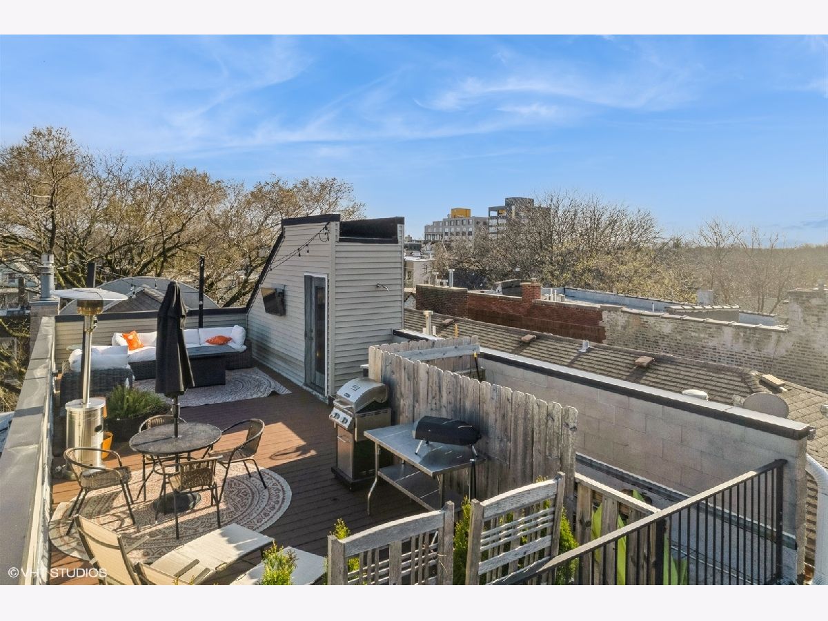 Welcome to Andersonville! This stunning, top-floor 2 bedroom/2 bathroom home has the highly sought after private roof deck you've been looking for. With cathedral ceilings, large south-facing windows, and exposure on all four sides, it has all the natural light you want on a quiet, tree lined street in one of the city's most desirable neighborhoods. The home features hardwood floors throughout, a gas fireplace, updated kitchen with 42" cabinets and island seating for entertaining. The split floor plan allows for privacy in both of the spacious bedrooms. Enjoy your large, private roof deck that has direct access from stairway in unit. Perfect for grilling, gardening, watching movies under the stars and entertaining this summer! In addition to the private roof- there is also a private back deck, and a common yard space with new artificial turf. Storage closet in basement. Garage parking included. New HVAC and smart thermostat in 2022. Enjoy all of what the neighborhood has to offer, with Gethsemane Garden Center on the corner, or stroll down Clark Street to enjoy countless restaurants and shops. Access the city with less than 15 minute walk to the new Peterson/Ridge Metra station or CTA Red line with soon to be completed modernization project. Enjoy the best of Chicago summers at the Kathy Osterman beach, also only a 15 minute walk away!