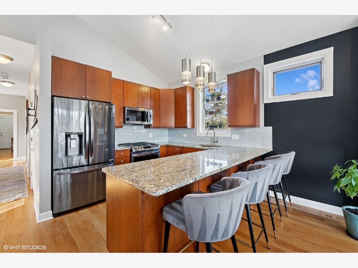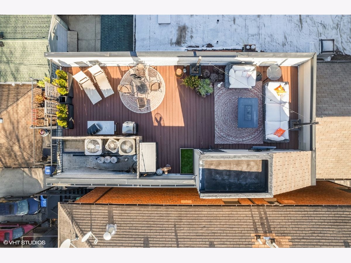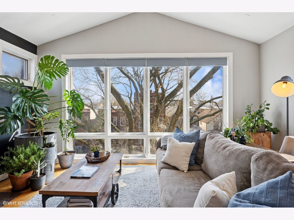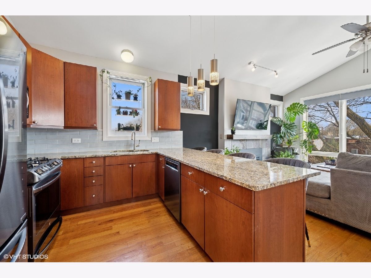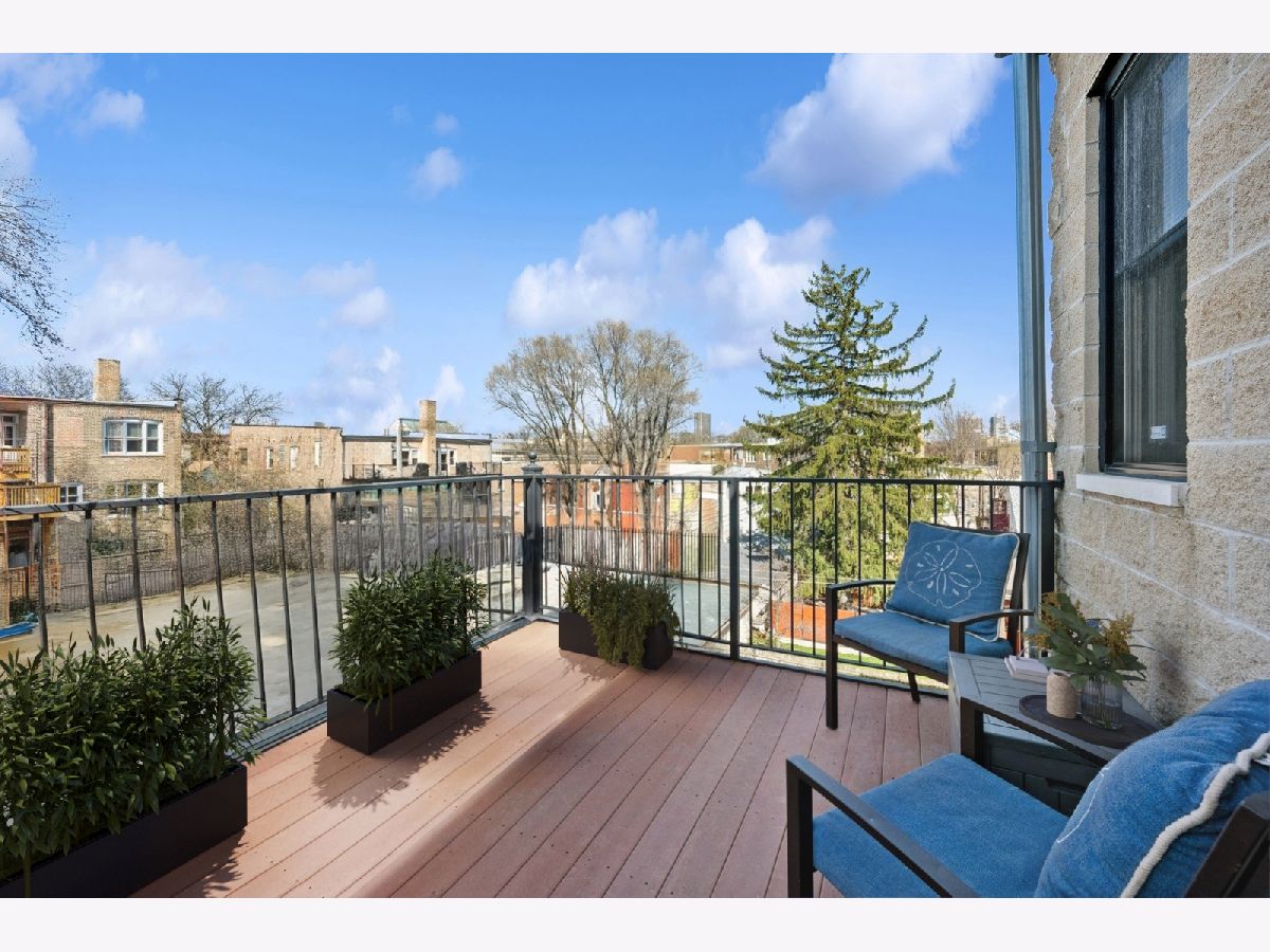 Welcome to Andersonville! This stunning, top-floor 2 bedroom/2 bathroom home has the highly sought after private roof deck you've been looking for. With cathedral ceilings, large south-facing windows, and exposure on all four sides, it has all the natural light you want on a quiet, tree lined street in one of the city's most desirable neighborhoods. The home features hardwood floors throughout, a gas fireplace, updated kitchen with 42" cabinets and island seating for entertaining. The split floor plan allows for privacy in both of the spacious bedrooms. Enjoy your large, private roof deck that has direct access from stairway in unit. Perfect for grilling, gardening, watching movies under the stars and entertaining this summer! In addition to the private roof- there is also a private back deck, and a common yard space with new artificial turf. Storage closet in basement. Garage parking included. New HVAC and smart thermostat in 2022. Enjoy all of what the neighborhood has to offer, with Gethsemane Garden Center on the corner, or stroll down Clark Street to enjoy countless restaurants and shops. Access the city with less than 15 minute walk to the new Peterson/Ridge Metra station or CTA Red line with soon to be completed modernization project. Enjoy the best of Chicago summers at the Kathy Osterman beach, also only a 15 minute walk away!