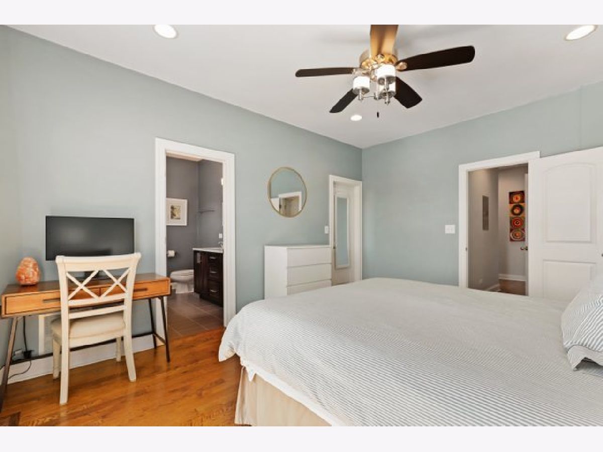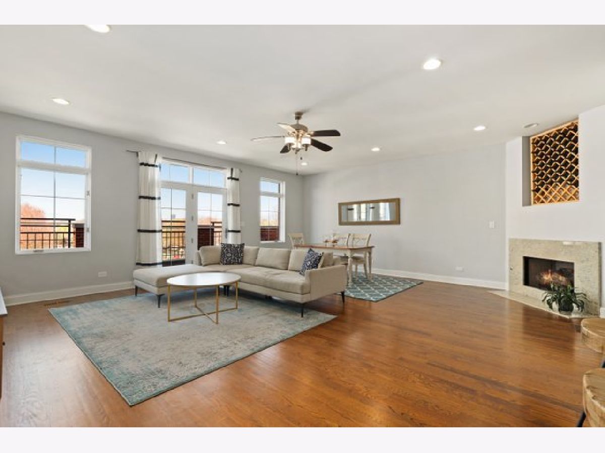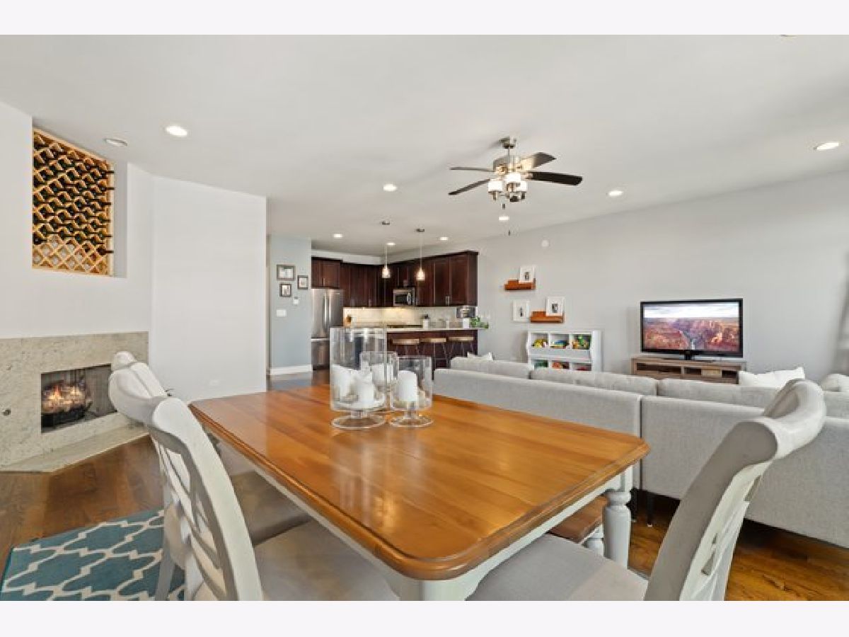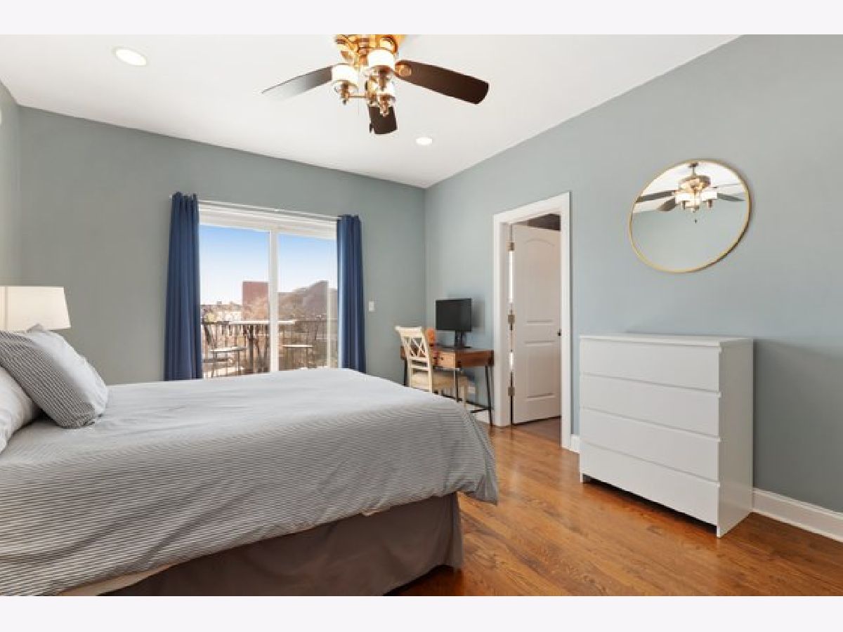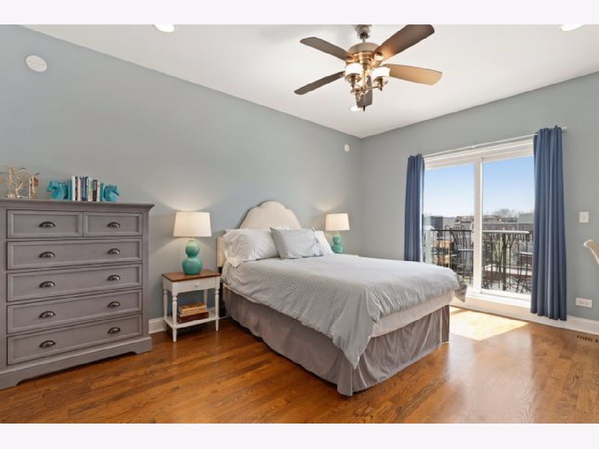 Top floor extra wide 3 bedroom, 2 bath condo with three private outdoor spaces sits in Blaine School District. This spacious unit features an open floor plan, hardwood floors throughout, gas lit fireplace and in unit washer/dryer. Three outdoor spaces include a front 22' x 6' terrace off living/dining room perfect for grilling, a south facing balcony off primary bedroom plus an expansive private top floor roof deck. Kitchen with custom 42" cabinets, granite counter tops including peninsula breakfast bar, herringbone backsplash and stainless steel appliances. Primary bedroom en suite with large organized walk in closet plus bath with double sinks and separate shower and soaking tub. Exterior parking spot is included. Across the street from new playlot. Blocks to Irving Park Brown Line, shopping and restaurants.