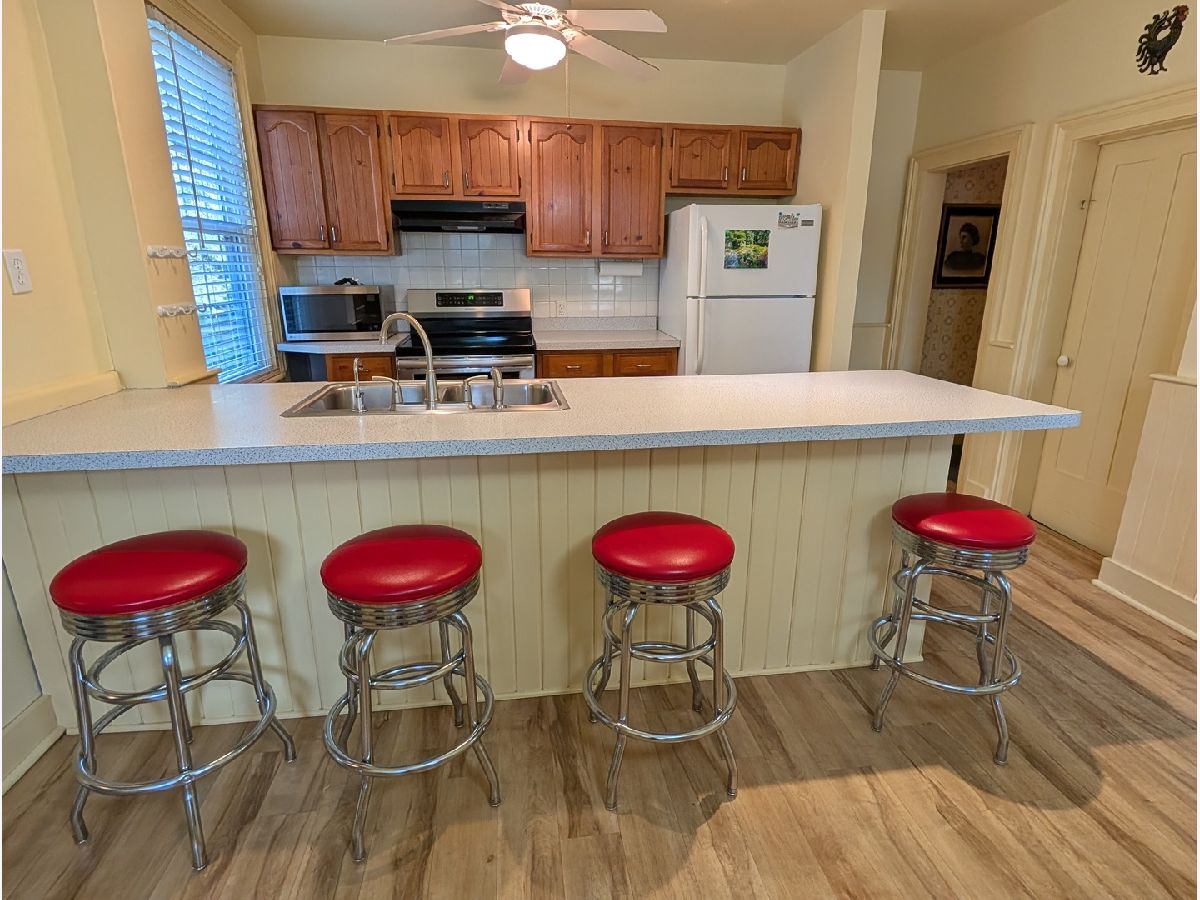 Charming historic home in Freeport, Illinois - full of character, comfort, and space! Built in 1857, this beautifully maintained property blends original craftsmanship with modern updates. The main level welcomes you with a cozy sitting room lined with built-in bookcases, perfect for a home library or reading nook. The kitchen offers granite-look counters, a breakfast bar, spacious dining area, and all appliances including an induction stove. A versatile bonus room off the kitchen makes a great playroom or flex space, while the enclosed back porch functions perfectly as a mudroom or entryway. You'll also find a comfortable family room with corner built-ins, a full bath, and a private office for remote work. Upstairs, three large bedrooms each feature walk-in closets, along with a spacious second full bath. Enjoy the outdoors in a beautifully landscaped, mostly fenced backyard with mature trees and inviting gathering areas. The current owners have preserved this home's history with photos and details tracing back to its origins as a cherry farm, adding to its timeless appeal. A unique opportunity to own a piece of Freeport's history with all the conveniences of modern living.