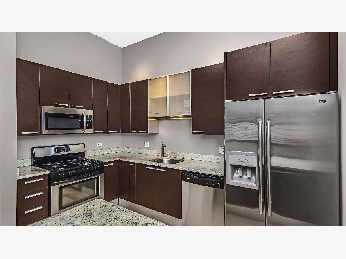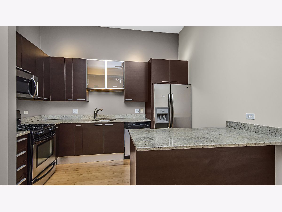 No neighbors in this unique soft loft space with 12' ceilings, exposed brick and ductwork. Open gourmet kitchen with breakfast bar, stainless steel appliances, italian cabinetry, 1.25" granite countertops. Huge marble bath with double vanity and granite countertops. Hardwood floors thru out, gas fireplace, large private balcony. Great location just steps from Blue Line station, restaurant and shops. Ultra convenient to all that Wicker Park, Ukrainian Village and Bucktown have to offer. 2 car tandem garage parking available for $20K. Pkg space #15.