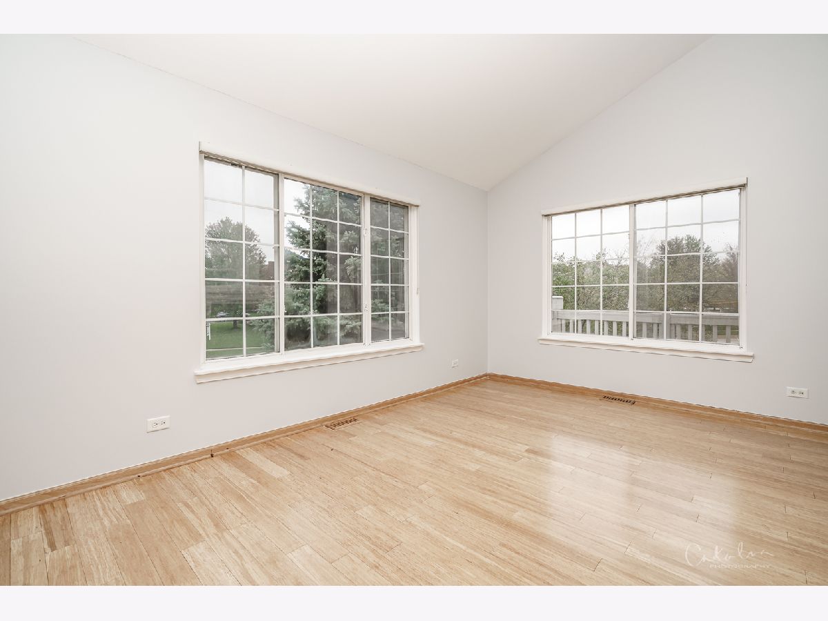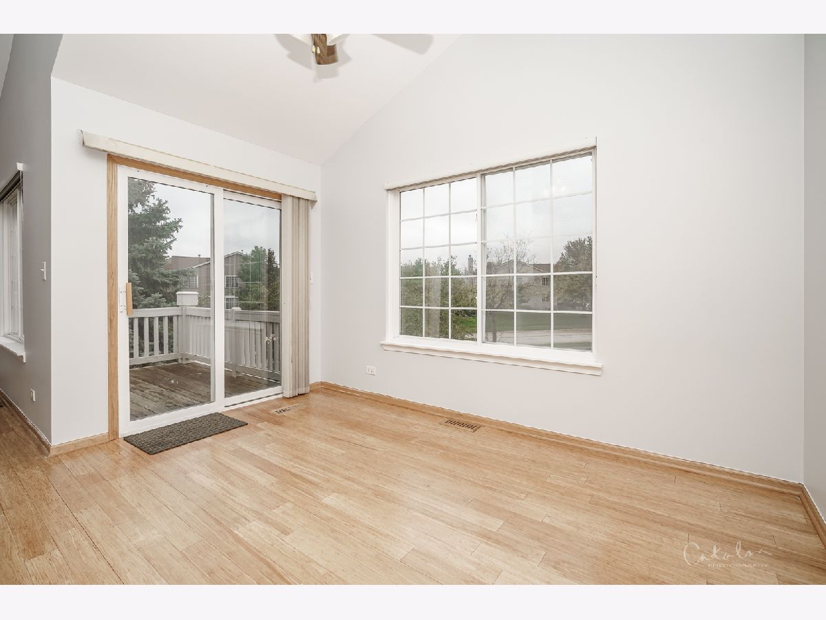 Amazing, Light and bright end unit in nice location with nice views and steps to the park! This open floor plan boasts vaulted ceilings & hardwood bamboo flooring! Big kitchen with table space features expanded breakfast bar! Dining room has sliding glass doors to large deck! Living room with fireplace! Spacious Loft makes a great office or 2nd living space. Master bedroom with walk-in closet & direct access to spacious bathroom! Ceiling fans in both bedrooms! Finished lower level offers spacious family room/rec room, with built-in bar. Easy build out a 3rd bedroom in lower level because it has a 2nd full bath & the space to do so. Full laundry room with washer & dryer included! Large 2 car attached garage. Upgraded light fixtures, new carpet and fresh paint throughout.