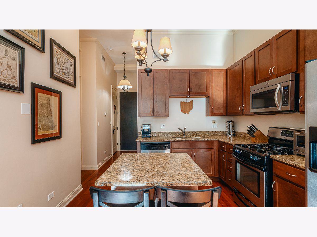 Welcome to one of the RAREST buildings in the West Loop where historic charm and character meet a tranquil city living experience with easy access to parks and green space. This gorgeous boutique greystone building features an elevator, two common outdoor spaces (a terrace steps from the unit's front door and a rooftop deck), bike room and indoor garage parking. Located steps away from Skinner Park (and Skinner Dog Park), Union Park and the CTA Ashland Green Line Station; this south-facing 2 bedroom, 1.5 bathroom unit features soaring 13FT ceilings and is bathed in natural sunlight at all hours of the day. The open living room / kitchen floor plan features granite countertops + island, stainless steel appliances and plenty of cabinets and countertop space. A built-in entertainment center in the living room gives way to HUGE floor-to-ceiling bay windows. Sunlight pours into the south-facing master bedroom through glass french doors that open to the Juliette balcony. The ensuite master bathroom includes dual vanity sinks, soaking tub and walk-in shower. The spacious 12 x 11 second bedroom is also perfect for a home office or exercise room. The in-unit washer + dryer combo and half bathroom make this home the perfect fit for the best of West Loop living at an affordable price. The common outdoor terrace is on the same level as this unit and is steps away from your front door for extremely easy access to outdoor space for grilling, entertaining and relaxing on a summer day. Take the elevator up to the common rooftop deck for additional outdoor space and panoramic views. Garage parking an additional $20k.