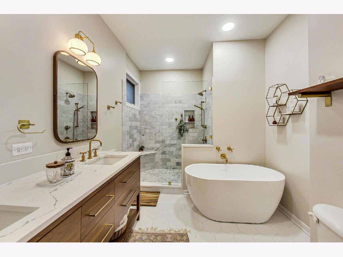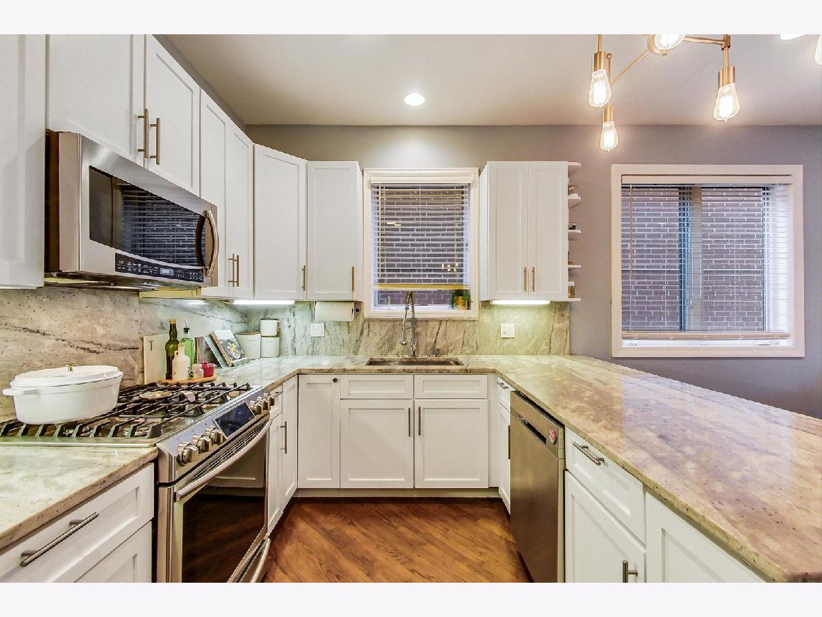 Beautiful 2500 sq foot duplex down with soaring ceilings and tons of natural light. The main level features hardwood floors, open concept living room with gas fireplace, formal dining room, chic lighting, sexy new powder room, and renovated kitchen. Chefs kitchen feature custom white cabinets, ss appliances, granite counters, backsplash, over-sized peninsula, and pantry closet. An expansive primary suite with organized walk in closet and stunning remodeled bathroom. Primary bath features double vanity, accent mirrors, gorgeous lighting, stand alone shower, and soaking tub. The lower level offers a large family room perfect for entertaining, two additional ample size bedrooms, and full bathroom. Additional features include in unit washer/dryer, extra storage, and garage parking. There are two lovely outdoor patios for all your entertaining needs. Walk to all Bucktown/Wicker and Logan hot spots. Near 606 and transport.