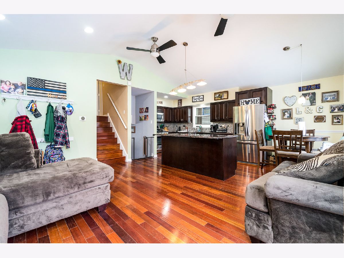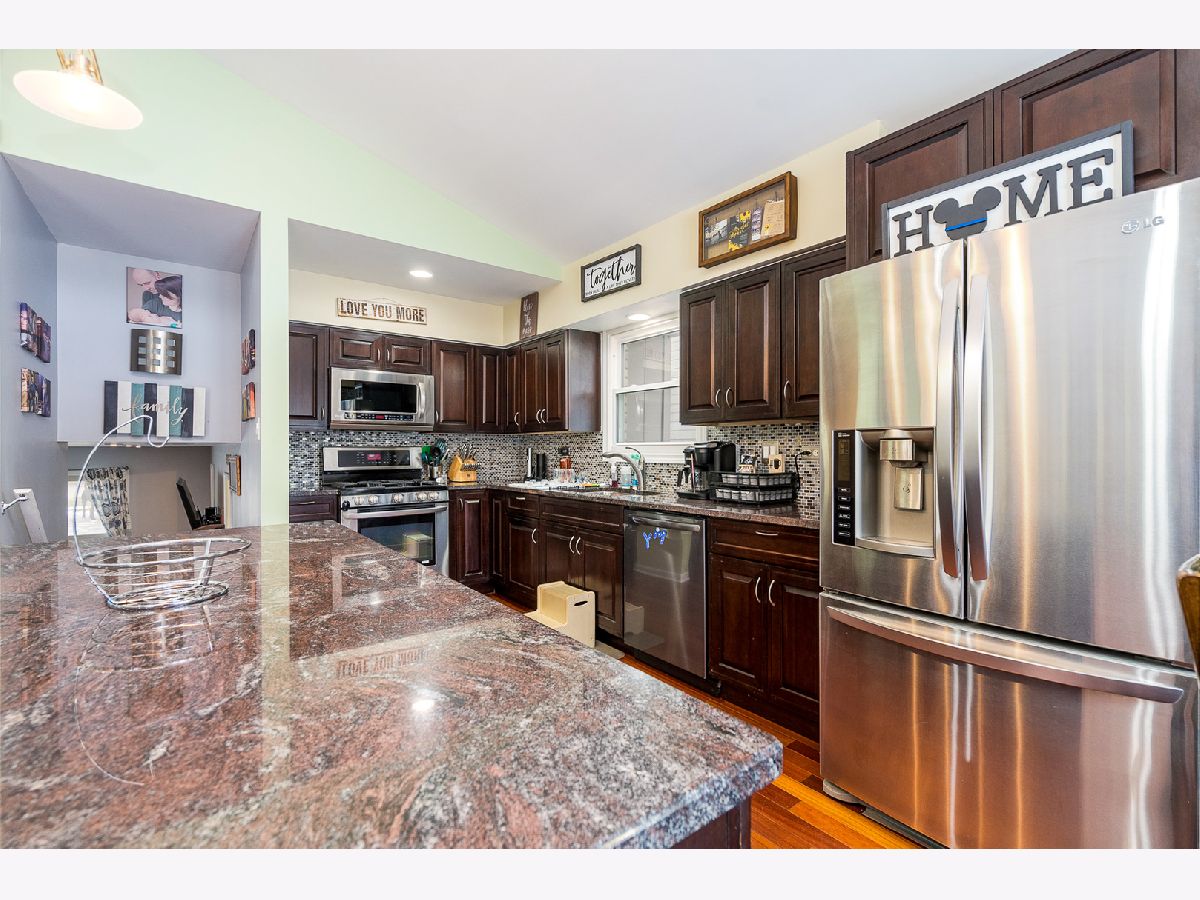 This amazing, professionally remodeled split level is nestled on a HUGE tree-lined lot across from a scenic park! Features of this lovely home include: A gorgeous vaulted kitchen that boasts dark cabinets, large island with seating, granite counters & stainless steel appliances; Spacious dining area; Sun-filled, vaulted living room; 3 bedrooms upstairs with hardwood flooring; Remodeled main bath that offers a double vanity & custom tile; Spacious family room with heated floors & 2nd full, remodeled bath; Walk out to the backyard patio area with new fire pit. HUGE, heated 2.5 car garage with 220 & shed with barn door in the 300 foot deep fenced backyard! Newer concrete side drive with parking for a variety of "toys" (cars, rv, boat, etc)! Other details: Newer HVAC, roof & windows. Enjoy the privacy and amenities of "country living" with such a large lot (1/3 acre) and surrounded by homes with equally large lots. Close to all conveniences such as shopping, dining & expressways plus train for commuters.