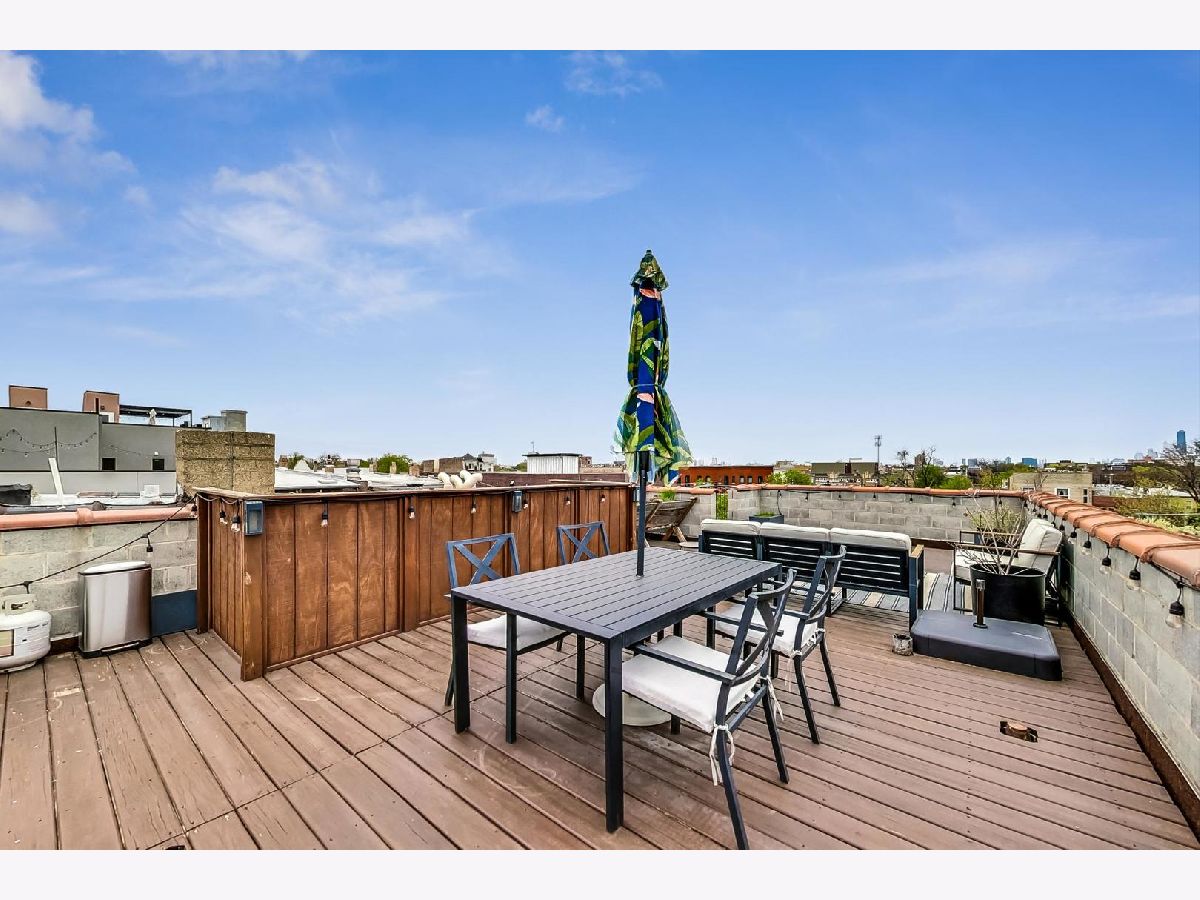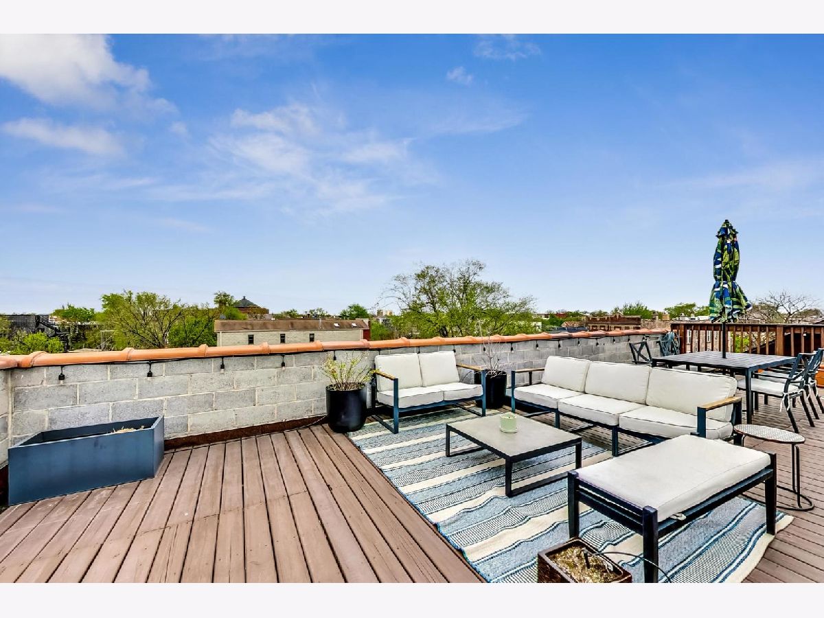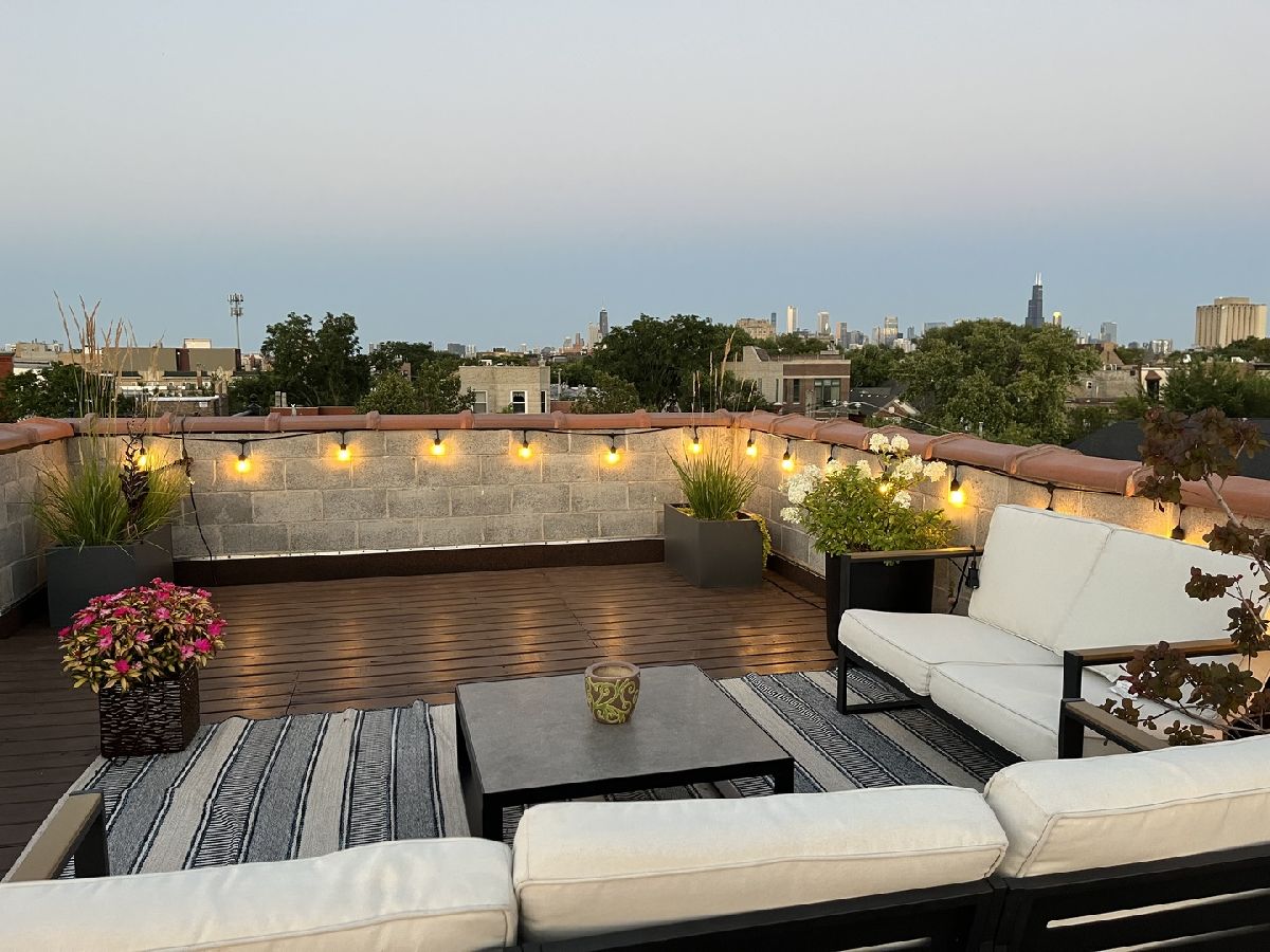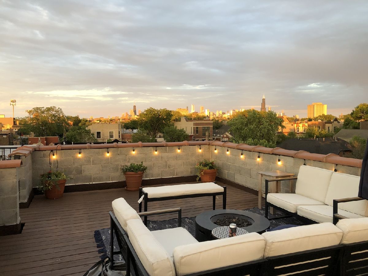 This penthouse 2bd/2bth outdoor oasis boasts a true WOW factor. Soak in loads of natural light filtered through skylights as you ascend the interior front stairs that opens to a living space with soaring vaulted ceilings. Imagine relaxing by the fireplace in your airy living room or cooking up a feast in the sun-drenched kitchen. This home is perfect for entertaining, with two private outdoor escapes: a deck off the main level and a massive rooftop patio with breathtaking skyline views...a total of 700+ sq feet of outdoor space! Enjoy the convenience of in-unit laundry, an assigned parking space, and additional storage space outside the unit. New AC and furnace in 2022. Don't miss out on your chance to live the high-life in this treetop penthouse in fabulous West Town.....with Logan Square, Wicker Park, Bucktown, and the beautiful Humboldt Park all just steps away.