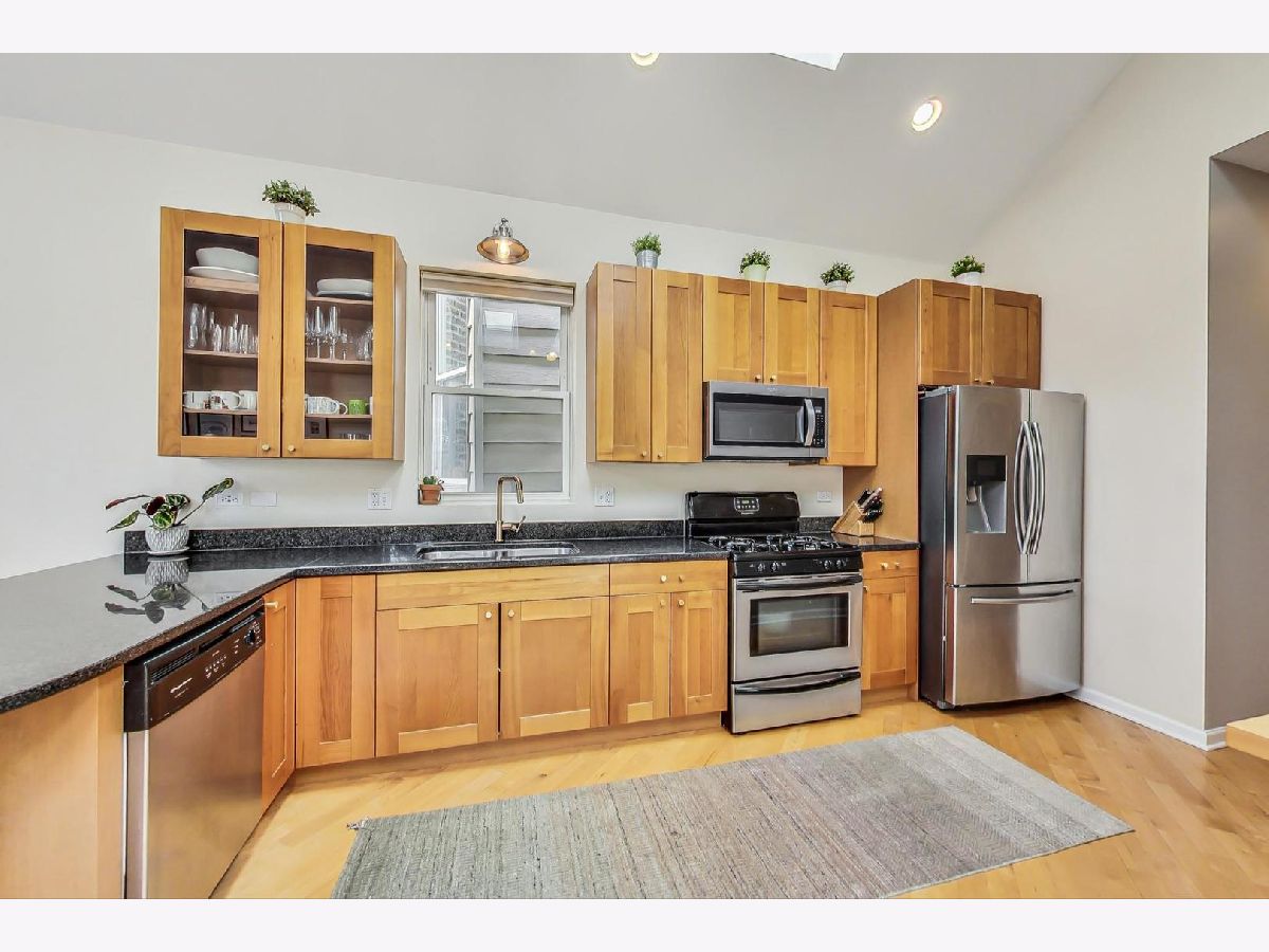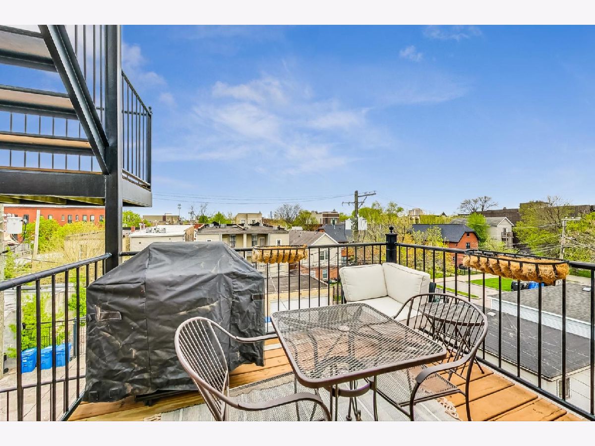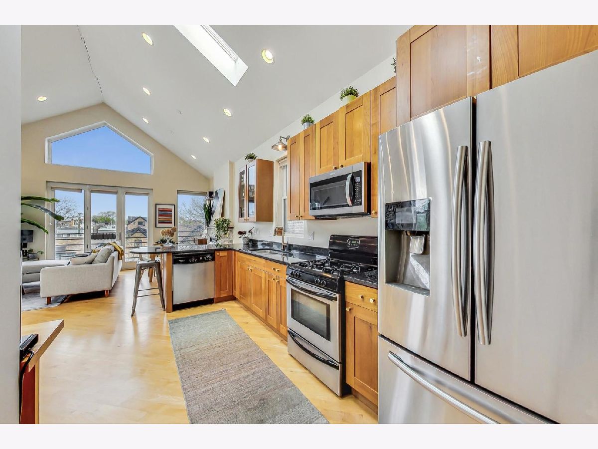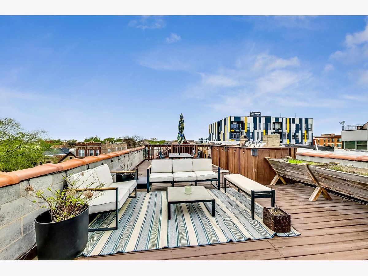This penthouse 2bd/2bth outdoor oasis boasts a true WOW factor. Soak in loads of natural light filtered through skylights as you ascend the interior front stairs that opens to a living space with soaring vaulted ceilings. Imagine relaxing by the fireplace in your airy living room or cooking up a feast in the sun-drenched kitchen. This home is perfect for entertaining, with two private outdoor escapes: a deck off the main level and a massive rooftop patio with breathtaking skyline views...a total of 700+ sq feet of outdoor space! Enjoy the convenience of in-unit laundry, an assigned parking space, and additional storage space outside the unit. New AC and furnace in 2022. Don't miss out on your chance to live the high-life in this treetop penthouse in fabulous West Town.....with Logan Square, Wicker Park, Bucktown, and the beautiful Humboldt Park all just steps away.