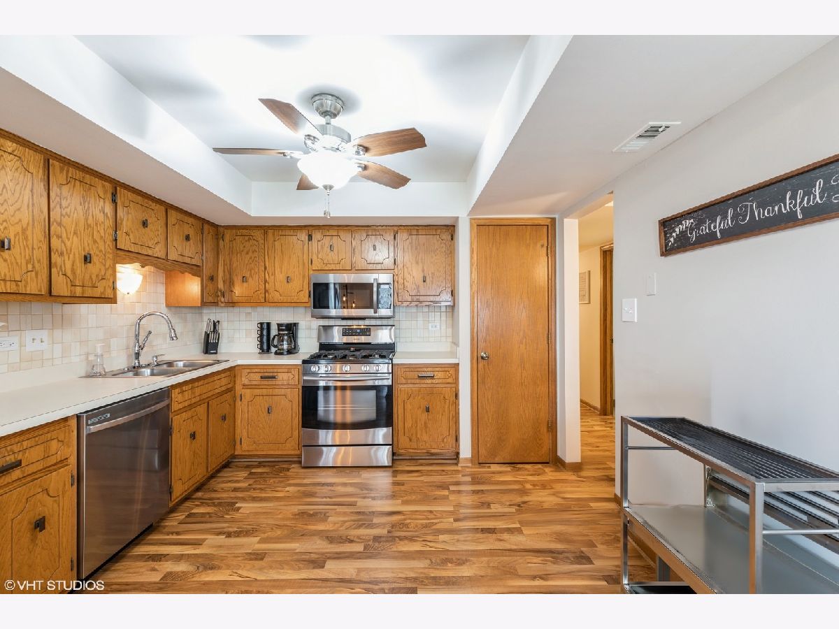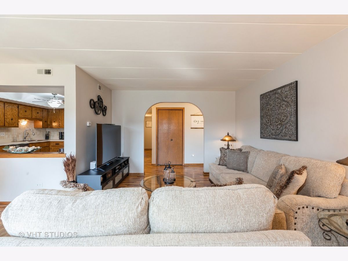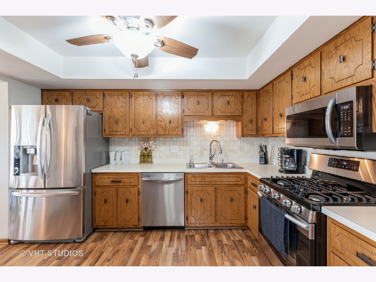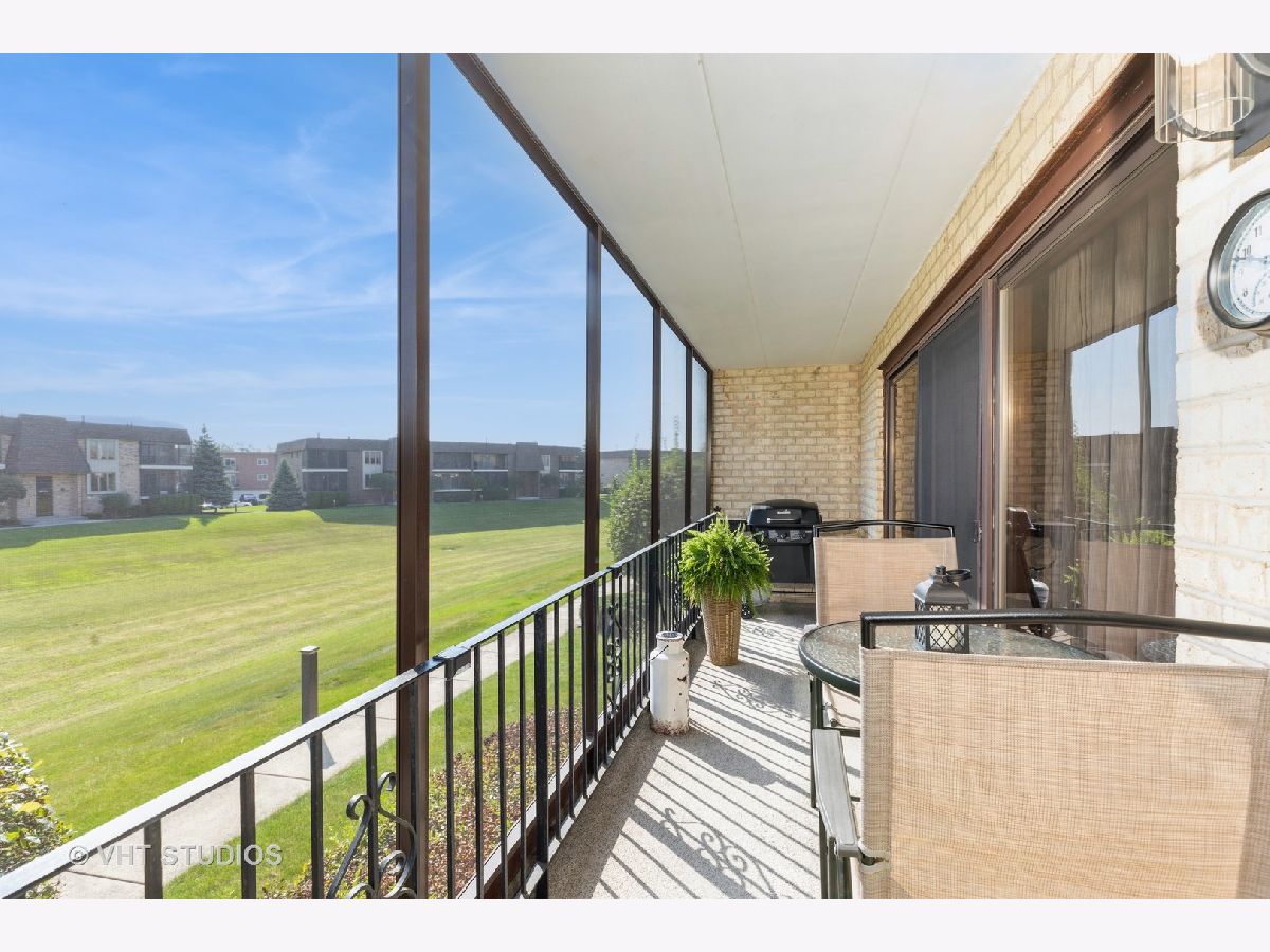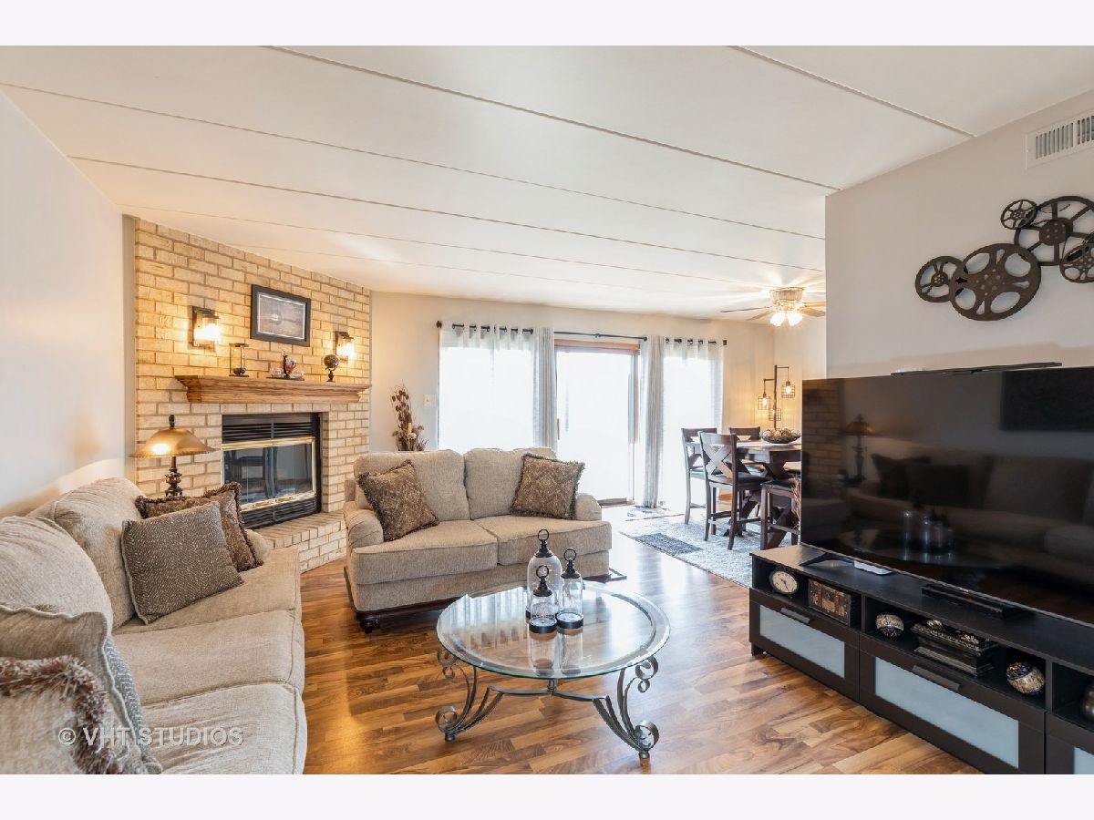 Welcome to this beautiful, meticulously maintained condo that offers the perfect blend of comfort and convenience. This spacious condo features 2 large bedrooms and 2 full-size baths, ideal for those seeking a move-in ready space with modern amenities. Step inside to find an inviting eat-in kitchen, complete with newer stainless steel appliances that include a dishwasher, cooking range, and microwave, as well as a convenient pantry closet. The open-concept family room and dining area boast a masonry fireplace, providing a cozy ambiance, while oversized patio doors lead to a beautiful screened-in patio overlooking serene outdoor space-perfect for relaxing or entertaining. Wood laminate flooring flows throughout the main living areas, adding warmth and elegance to the space. The entire main living area has been freshly painted, offering a bright and welcoming atmosphere. A rare find, this condo includes a 2.5 car heated garage with direct access to the building and extra storage space, ensuring all your needs are met. Located in a highly desirable area with excellent schools, you'll enjoy easy access to shopping, dining, and the Metra, making this the perfect place to call home.