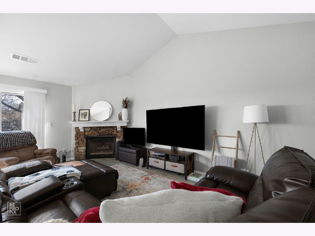 ATTENTION INVESTORS. Beautiful 2nd floor, 2 bedroom, 2 full bath condo in Woodside of Wheaton! Recently installed gray vinyl floors throughout with light dove gray paint and all white trim. Vaulted ceiling in open style family room with fireplace.White kitchen cabinetry with walk in pantry. Separate eating area with balcony access overlooking well manicured grounds. Ceiling fans in both bedrooms and custom closet built ins. Two full bath showers with private bath in master. Washer & dryer in unit. Garage attached to building plus outside visitor parking. Great location near schools, shopping, and highway. Professionally managed and management fee paid in full until end of lease.