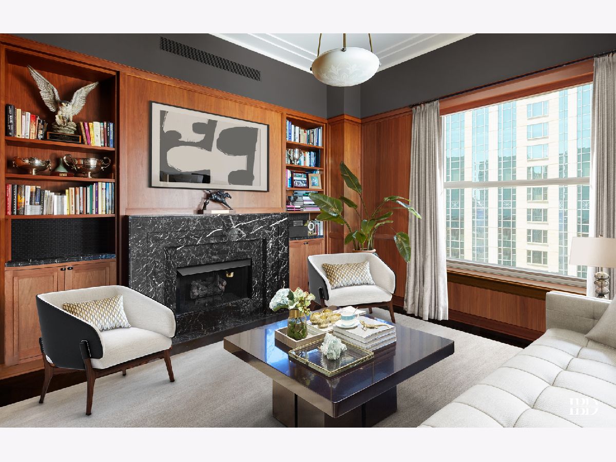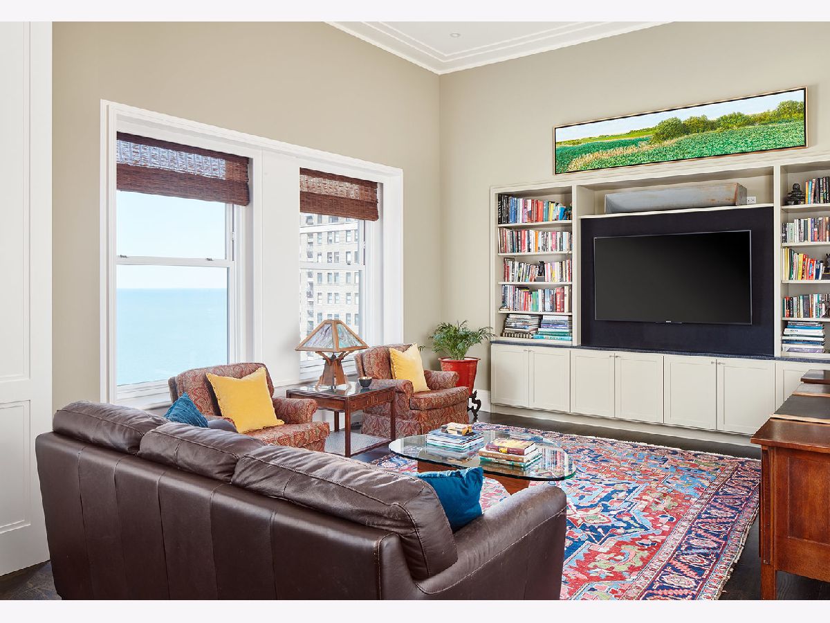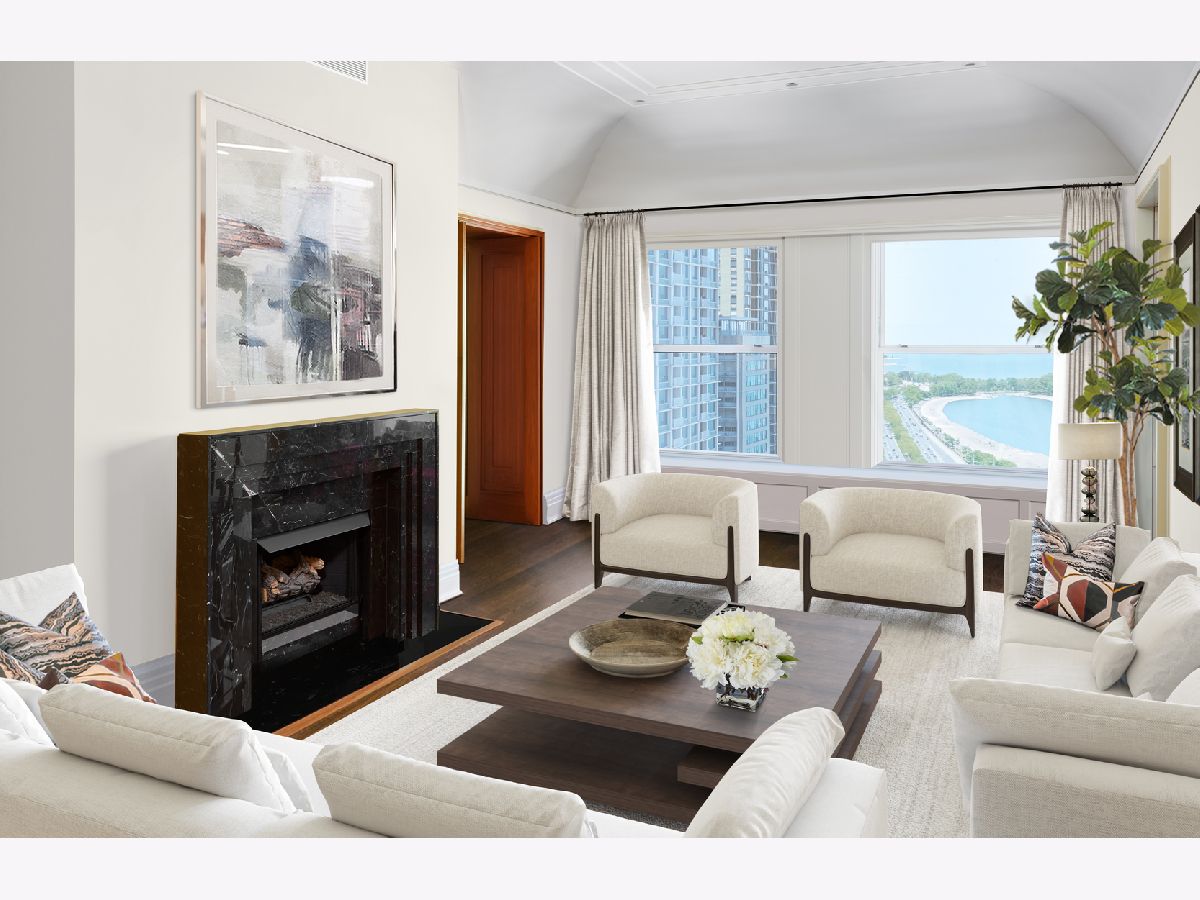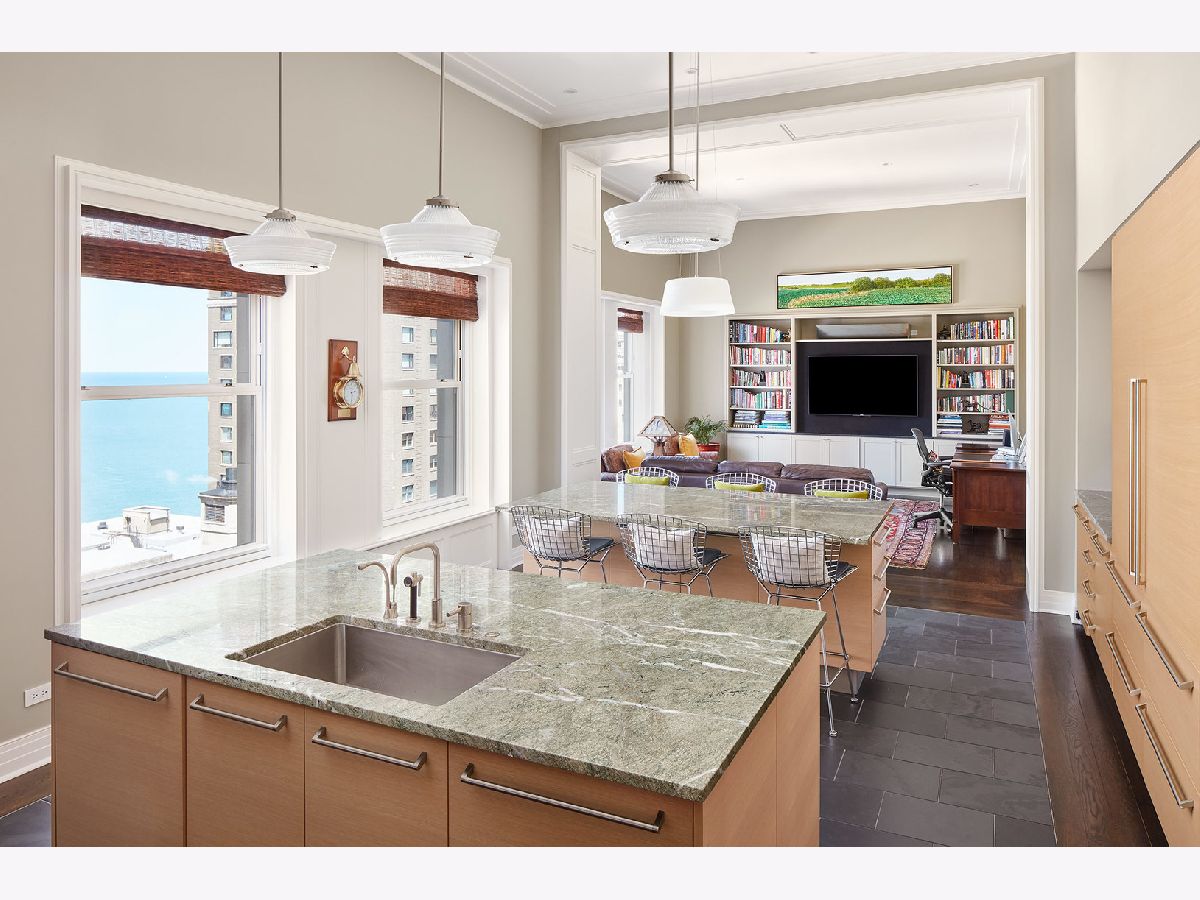 Major price reduction! Exquisitely detailed 6300 SQFT residence at the Palmolive featuring 13 1/2 ft ceilings with incredible lake & city views. Highlights include: coved gallery & living room ceilings, a formal dining room w/lake views, wood paneled library w/fireplace. The custom, upgraded kitchen overlooks the lake includes double refrigerator & freezers, prep & dining islands, walk-in pantry, & opens to the family room. A wood paneled master suite features a sitting room, a luxurious bath, & spacious walk-in his/her closets. This home also offers three additional ensuite bedrooms + a study & abundant closet and storage space throughout. Two garage spaces included in the price. The Palmolive Building offers exceptional services: 24 hour doorman, valet parking, onsite manager, gym, and Beacon Club party room.