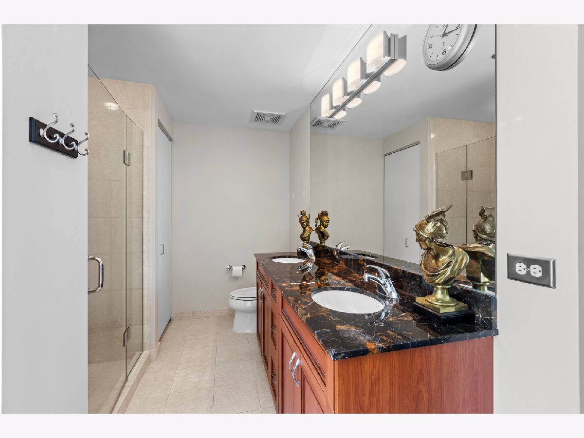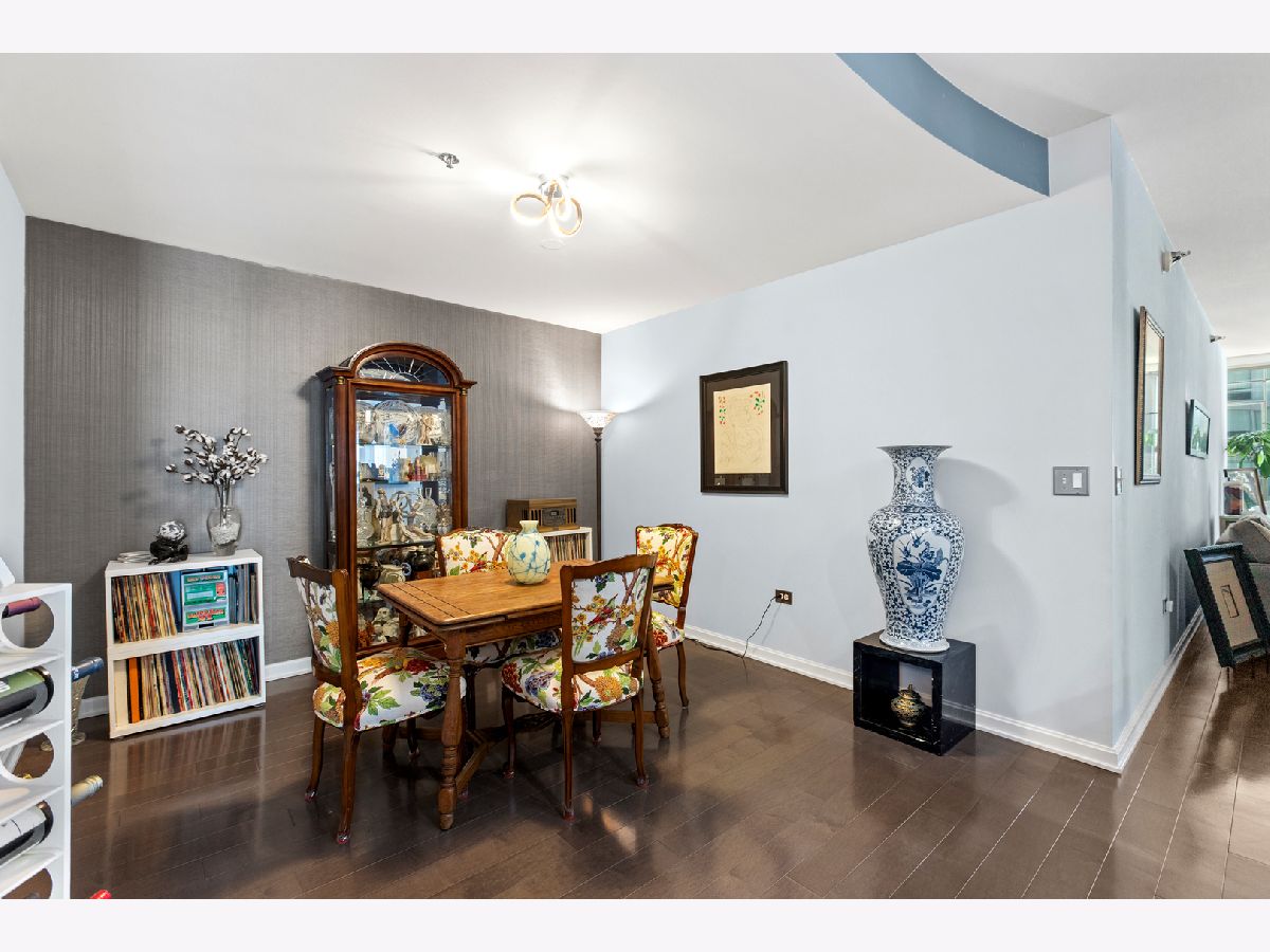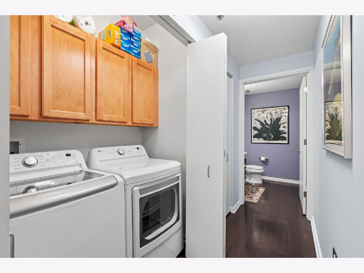 *THIS PROPERTY HAS A VA LOAN OF 536k THAT IS ASSUMABLE AT 2.875%, BUYER DOES NOT NEED TO BE A VETERAN TO ASSUME THIS LOAN! Highly desired South and East corner unit in Streeterville with great city and lake views! This 2 bedroom + den and 2.1 bath condo also has a formal dining room, private balcony and premier garage parking included! The floorplan is open and very versatile with distinct rooms for living, dining and a den/office which can be used interchangeably to accommodate your lifestyle! The generous foyer gives plenty space for artwork and has a large coat closet. The kitchen is the center of the floorplan and is open to the living room, dining room and the den! The kitchen has a new tile backsplash, new Samsung Bespoke fridge with frosted glass, granite counters, stainless appliances, and a large breakfast bar. The dining room has plenty of space to seat ~8! The living room has floor to ceiling windows, plenty of room for large seating area, a gas fireplace with new surround, and a door to the private balcony that faces South & East and soaks in the sunshine and city and lake views! The open den is currently used as an office and fits a very large desk and bookshelf. The primary bedroom sits on the corner and has floor to ceiling South & East windows, a large walk-in closet, and an en-suite bathroom with a separate soaking tub and shower, linen closet, and a double vanity. The 2nd bedroom also faces South and has a generous closet and is also en-suite with it's own full bathroom! New in 2023, the side by side washer/dryer is in a large laundry closet with built-in cabinets for great storage. 3 new Ecobee thermostats. Extra storage and prime garage parking included in the price. This full amenity building has a cozy boutique feel with an active social committee and incredible management and staff. Amenities include a terrific roof terrace, perfect for watching fireworks or enjoying the city lights; large work out room; gorgeous oversized party common/room; 24 hour doorstaff and on-site property management. Truly terrific downtown location, steps to Michigan Avenue and countless shopping and grocery store options (Whole Foods on this block), nightlife and restaurants (Egg Harbor Cafe outside your door)!