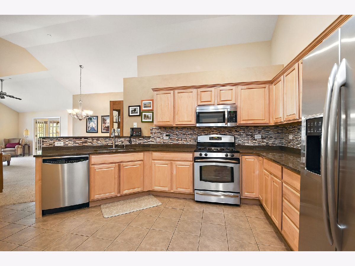 Stone construction on this 3 BEDROOM, END-UNIT, RANCH. Awesome opportunity to downsize without giving up the amenities you deserve. Open floor plan with vaulted ceilings. Warm and inviting sunroom. Living room with corner, gas fireplace. Adjacent dining area. Well-appointed kitchen with granite counters, tile backsplash, stainless appliances and pantry closets. Large in-unit laundry area and mudroom. Bright primary bedroom with walk-in shower, double sink, vanity and walk-in closet with organizers. 2 other spacious bedrooms and bath. 2 car attached garage with workbench and attic access for additional storage. Private patio. Great subdivision includes pond w/fountain, clubhouse and exercise room.