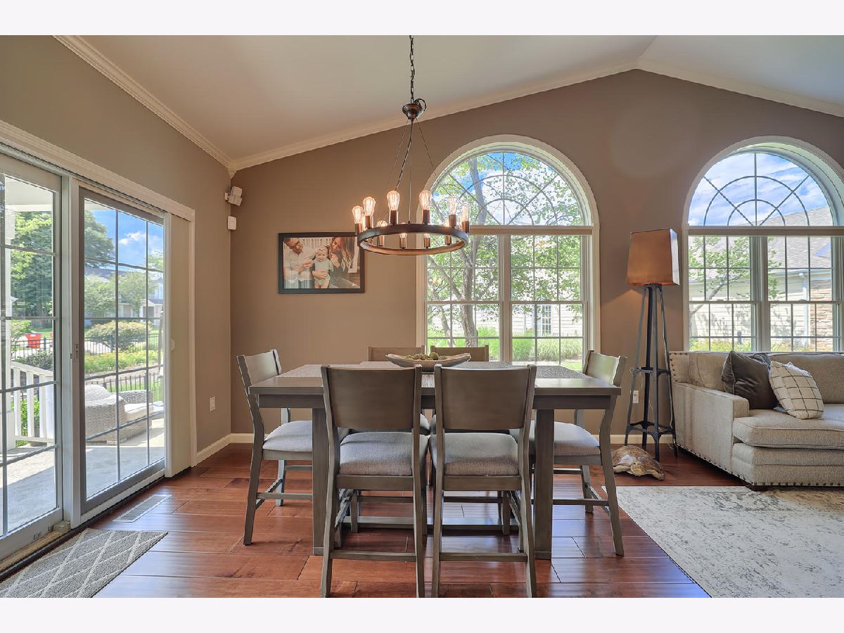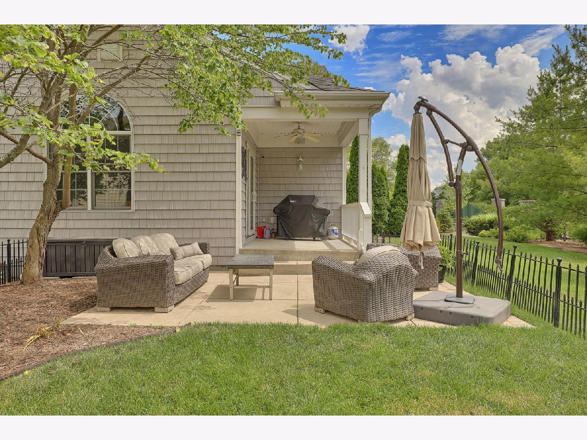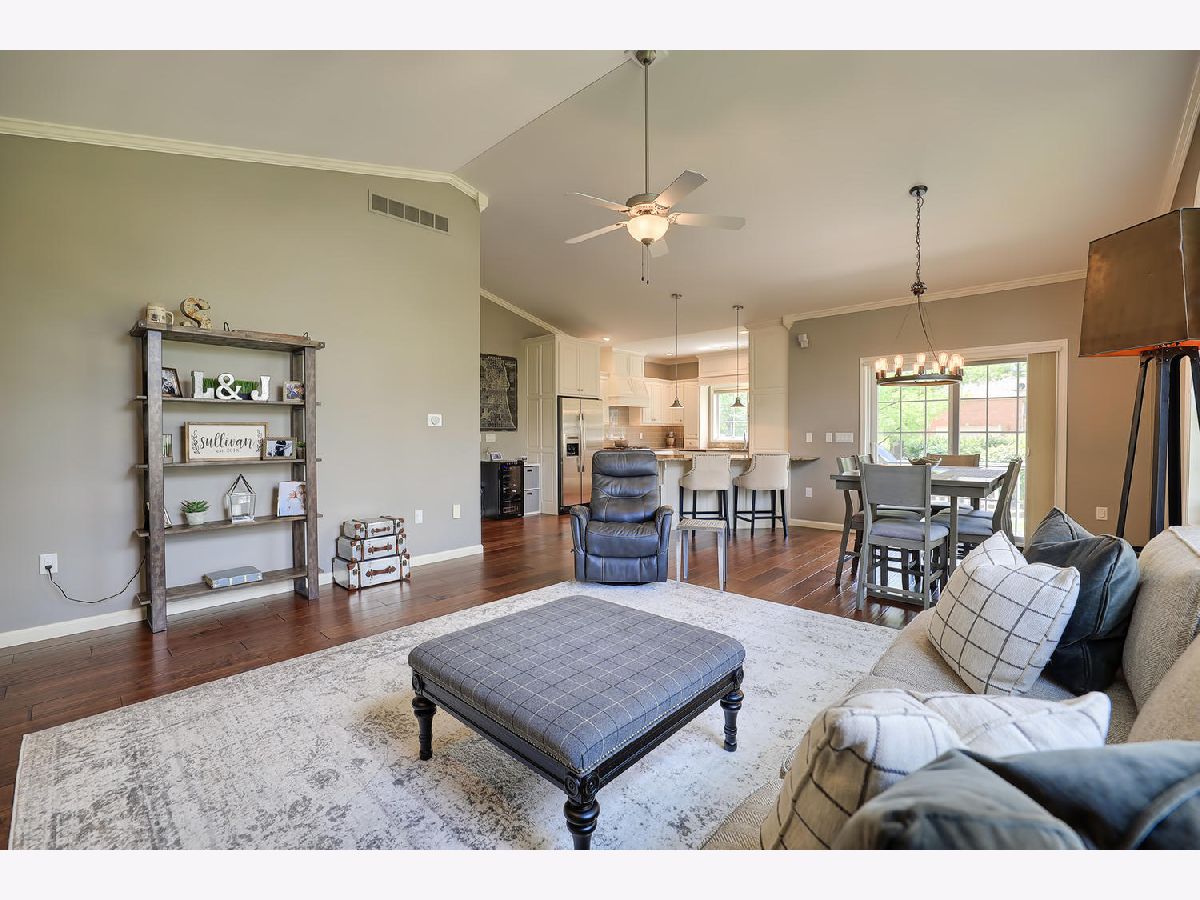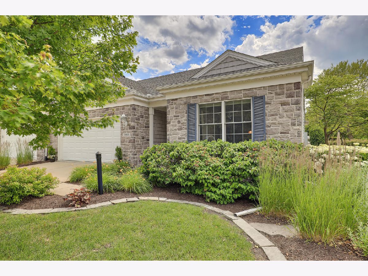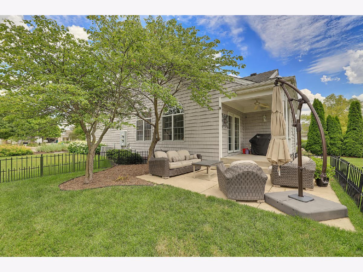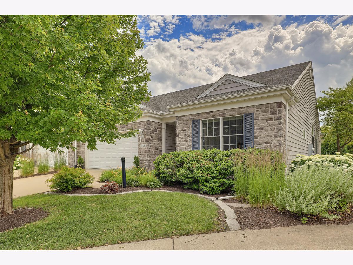 This beautiful condo at The Greens at Lincolnshire Fields will leave you breathless with it's amazing floor plan, tall ceilings, and gorgeous interior features! The first floor opens to a spacious foyer enriched with beautiful dark hardwood floors and high-end crown molding throughout. The sunny and open living room is adorned with large picturesque windows, dramatic vaulted ceilings, and a stunning gas log fireplace with brick surround and built in bookcases. Adjacent is the expertly designed kitchen which offers granite countertops, white cabinets, under-the-cabinet lighting, well-chosen light fixtures, and a stunning glass tile backsplash which creates the perfect blend of style and functionality with its high-end stainless-steel appliances, double oven, vented range hood that is vented to the outside, and a breakfast bar with a roomy dining area. Off the dining area is a sliding glass door entrance to the comfortable covered porch leading to the back private patio and fenced-in backyard, all perfectly situated on the end unit lot creating ample amounts of yard space to enjoy. The main floor also includes a very organized and functional laundry room with tons of cabinet space and a convenient sink, two bedrooms; one being the impressive master which includes two full master baths and an oversized master closet that connects the two bathrooms. One master bath includes a jetted tub and the other offers a walk-in shower increasing the overall functionality of the home and creating a sense of ease. The finished basement provides a gracious 3rd bedroom with double closets, full bath, large family room and two additional rooms for storage. Not without mention, this home has wonderful curb appeal with its timeless stone exterior, professional landscaping, and a nicely sized two-car garage. Peace of mind maintenance includes a pre-inspection for buyers convenience, updated light fixtures throughout, newer washer and dryer that stays with the home and newer paint throughout. HOA fee covers exterior maintenance, snow removal, lawn care, exterior insurance, and trash removal. The commons area features putting greens and a fire pit for added enjoyment. Come view this immaculate condo today!