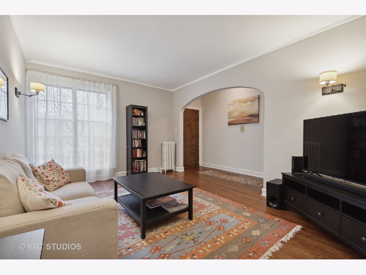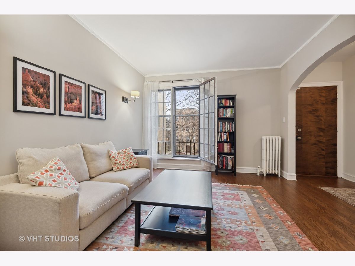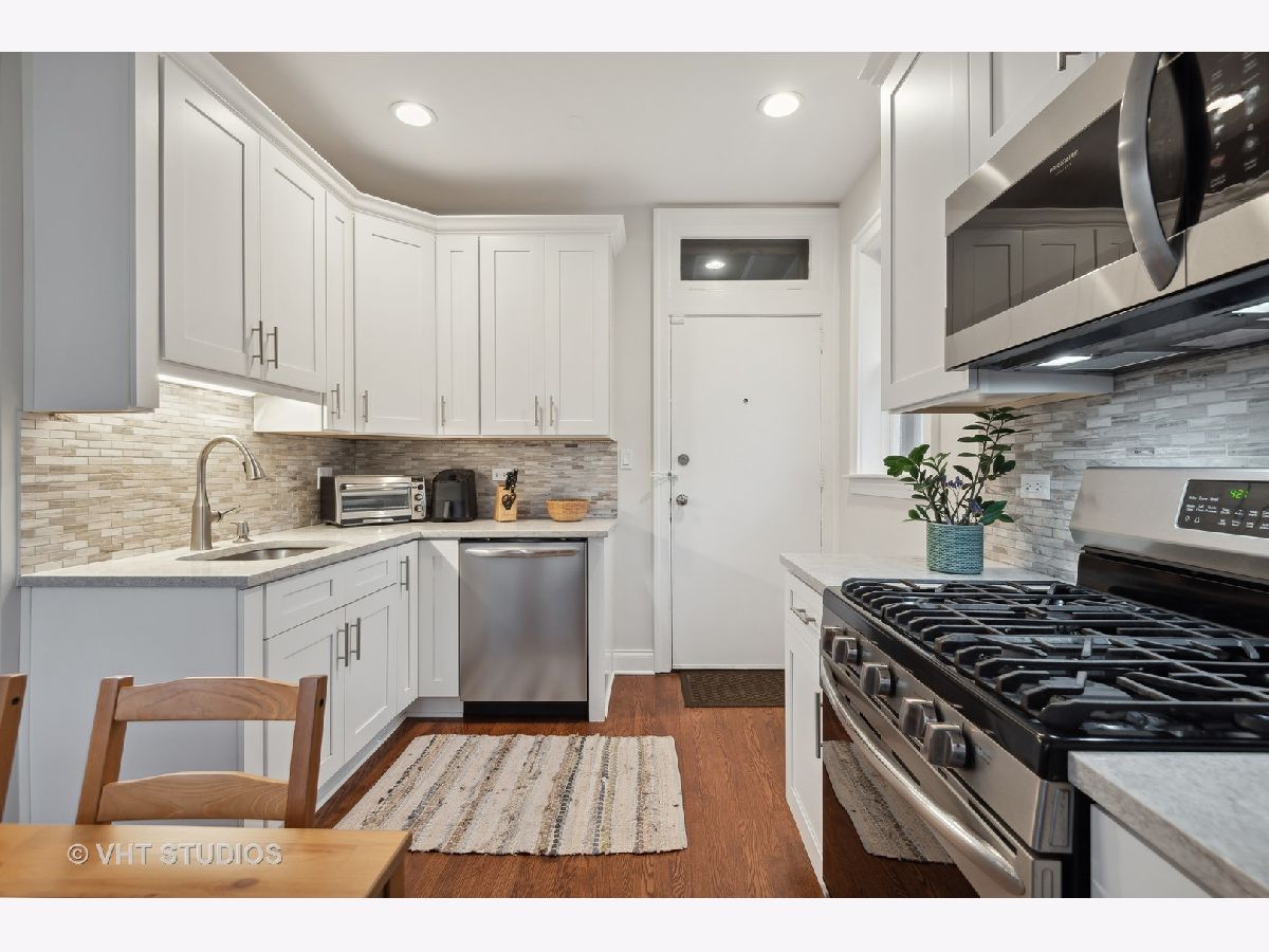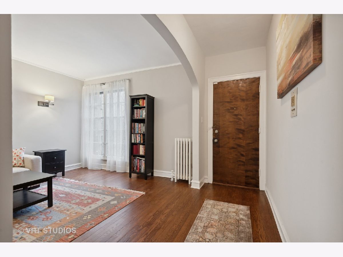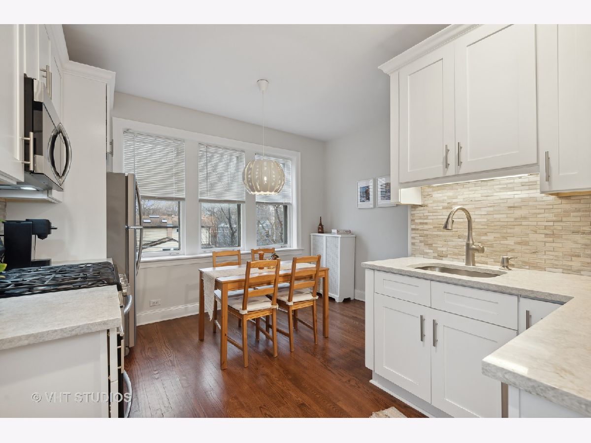 Welcome to this idyllic setting, blocks from the New 2020 built Robert Crown Community Center, which features an Evanston public library branch and a multi-sports/ice arena. Located on a wide, one-way (East) treelined street, comes the perfect oasis of classically restored vintage coziness. Meticulously renovated for the homeowners' own use, with renovation and expansion of former studio sized kitchen. Permit pulled for kitchen remodeling bringing the kitchen electrical and plumbing systems up to code, including adding additional circuits for the appliances and replacing an electrical box. The kitchen renovation includes addition of dishwasher, new white cabinets, stainless appliances, lighting, countertops, and backsplash. Very tastefully done. The bathroom has been renovated as well. Dark walnut stained flooring and entire place repainted and walls repaired where needed with plaster. Drywall used to accommodate the kitchen build out. Charming features to enjoy in this home are a spacious living room accented with sconces. Beautiful floor to ceiling vintage casement window in living room, allows courtyard breezes and unrivaled views. Revised eat-in dining area seamlessly flows into your new open kitchen layout. Vintage details include hardwood floors, crown molding, and two arched doorways, detailed wood trim and wall sconces. New door lever hardware, original windows revised to function accordingly. Truly nothing to do but pack up and move in! LOW taxes. Assessments cover heat and water. Laundry and extra storage on site. Intimate 10-unit building. Pet friendly building with 100% occupancy. Amazing location -Metra and "el" trains, parks, and vibrant Main St. shopping/ dining area.