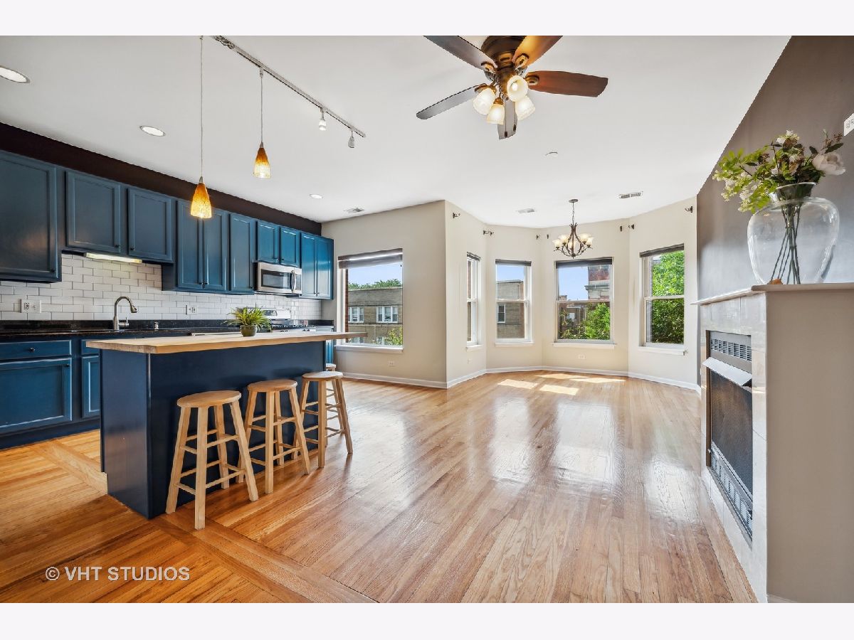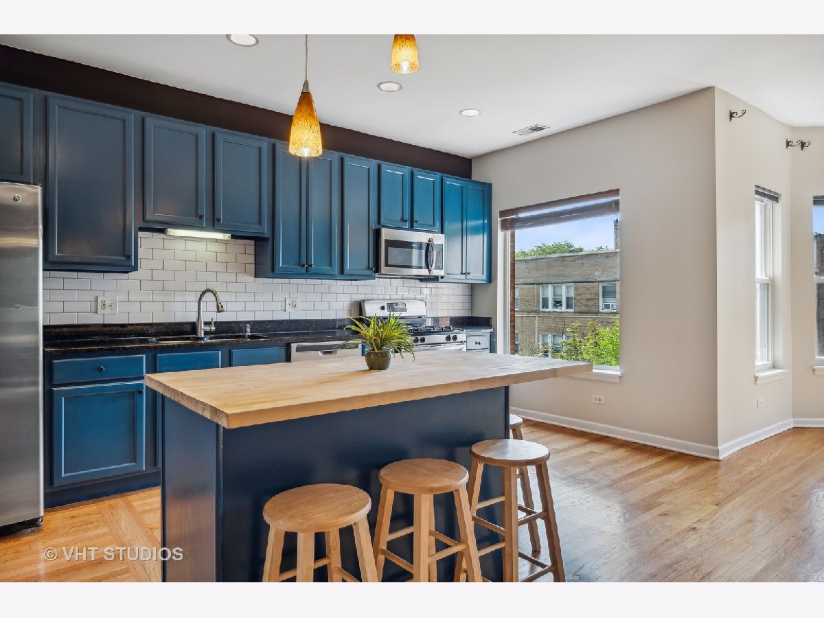 Live large in this bright 2 bedroom 1.5 bathroom + Den condo. Over 1200 sq ft. Open concept kitchen with new butcher block island and subway tile backslash. Large kitchen with a lot of counter space and SS appliances. Refinished hardwood floors throughout. In-unit full size washer and dryer. Den is the extra room that makes the perfect home office. Large deck to enjoy the outdoors, to have planters and to grill. Plenty of closet space as well as a storage unit in the lower level. One assigned parking space. Walking distance to lakefront, Red and Purple Line and conveniently close to shops and restaurants.
