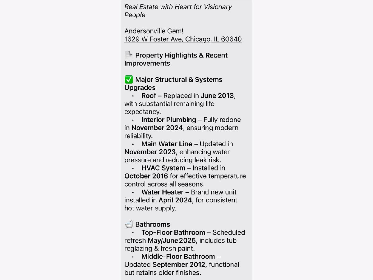 Incredible Investment Opportunity in Prime Location! This solid three-unit building offers exceptional potential with three legal units - a rare find in the heart of Chicago's vibrant Andersonville neighborhood. The first-floor and second-floor units each feature 2 spacious bedrooms and 1 full bathroom, offering comfortable layouts ideal for tenants or owner-occupants. Both units boast large windows for natural light, hardwood floors, and generous living spaces. The garden-level unit (Unit G) is currently unfinished (all city permits are ready to transfer to new owner), presenting a perfect opportunity for rehab - all plumbing has been completed including a new water main all the way to the city line, so you can customize and add value with ease, all work done to code and with city permits. Whether you're an investor looking to generate rental income or a homeowner interested in duplexing or house-hacking, this building has incredible upside. Zoned as a legal three-flat, it offers flexibility and long-term value. Don't miss this chance to invest in one of Chicago's most dynamic and appreciating neighborhoods! Property sold as is.