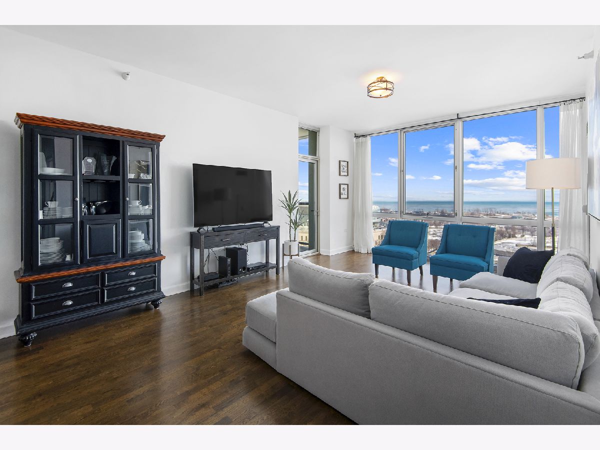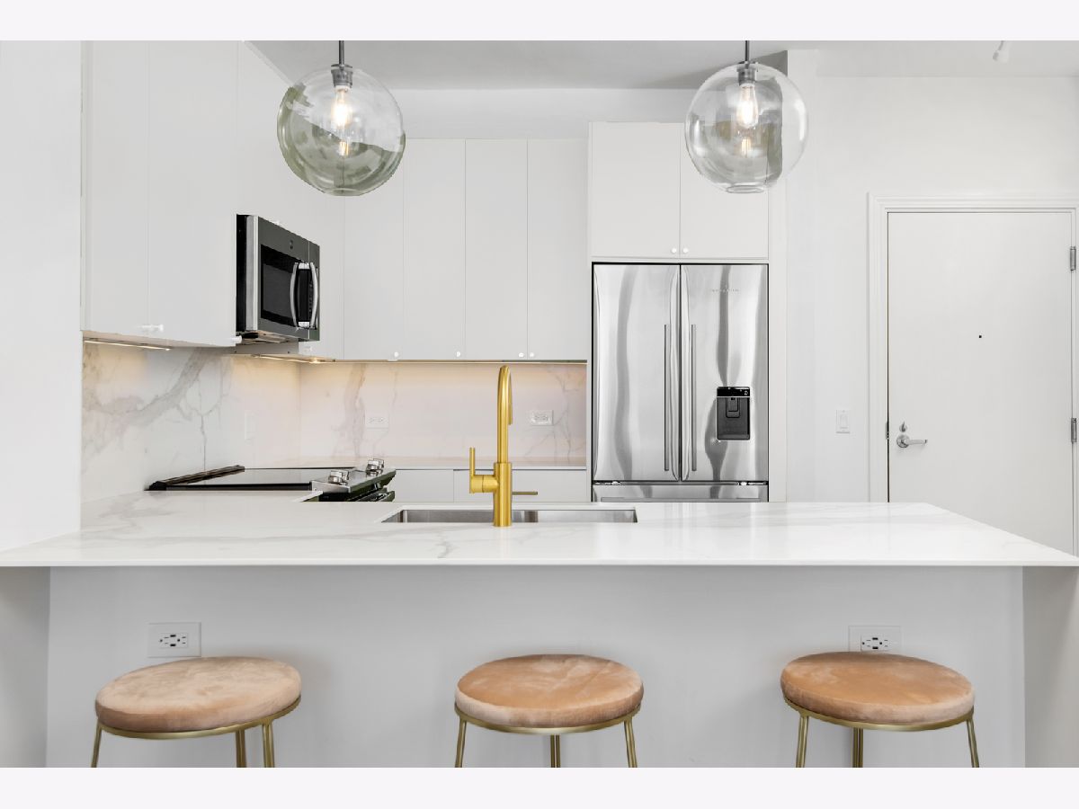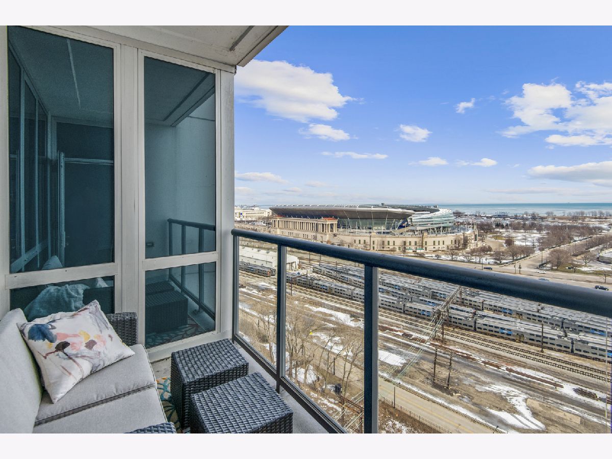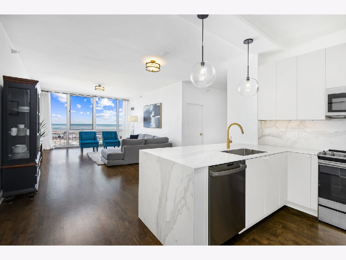 East-facing, brand new and thoughtfully renovated extra large 2 bed + den/ 2 bath condo with incredible lake views located in the heart of South Loop's historic Prairie District! The Calacatta Gold porcelain marble kitchen countertops with satin brass accents blend beautifully the new Brunswick cabinetry and stainless steel appliances. Bright and open floor plan including 9' ceilings, a balcony, 2 full walk in closets and ample storage throughout. Full remodeled guest and primary bathroom include an authentic concrete floor tile which compliments a simple black-and-white theme with chrome accents, throughout both bathrooms. All new, full sized in-unit washer and dryer. All this in a professionally-managed high-rise building including 24/7 door person & gym, common rooftop lounge & pool! 1 garage space for an additional $30k. Monthly assessments include internet, heat, water & 1 private storage cage. Dog park just north of the building, tons of nearby restaurants and easy/ direct access to the lake and Soldier field from nearby passage below LSD!