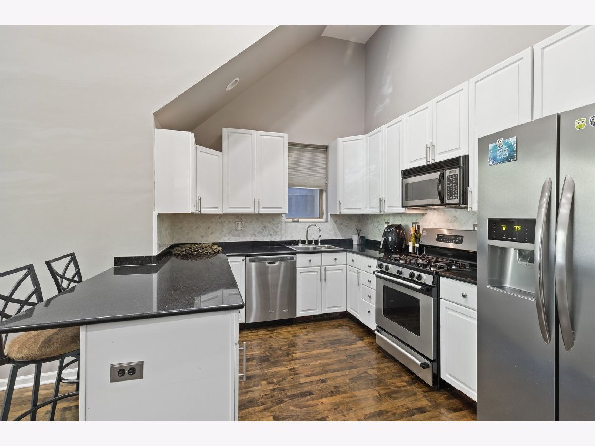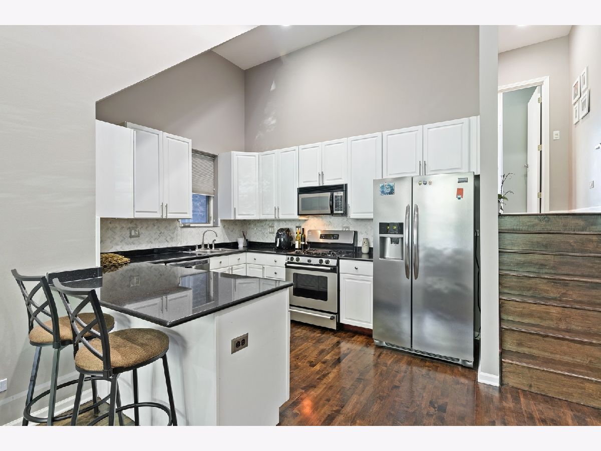 West Town! Great 3 bedroom, 2.5 bath triplex down condo on one of East Village's nicest tree-lined street. Updated kitchen with white 42" cabinets, granite counters, tasteful back splash, breakfast bar & stainless steel appliances. Large master suite features an organized walk-in closet, private balcony & European granite bath with double vanity, separate shower & whirlpool tub. The lower level offers tall ceilings, two additional bedrooms, laundry room and family room with a dramatic 15 ft. ceiling and open atrium that opens out to the perfect front patio. Additional features include newly dark stained hardwood floors, wired for sound, fireplace with custom tile surround & in-unit storage. Attached garage parking included!