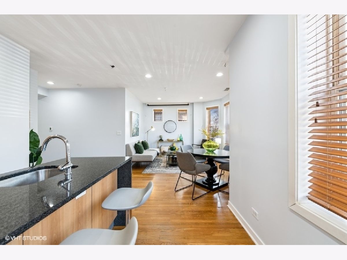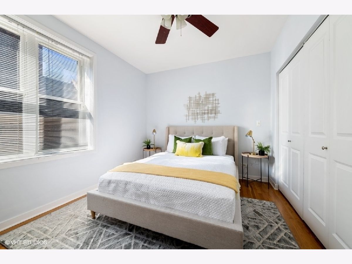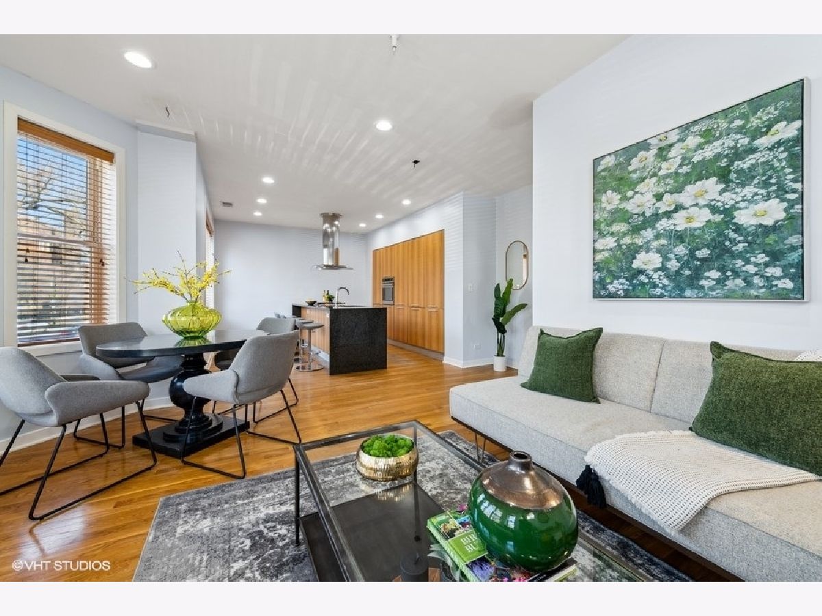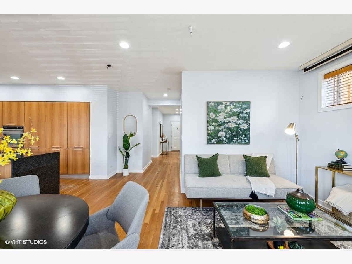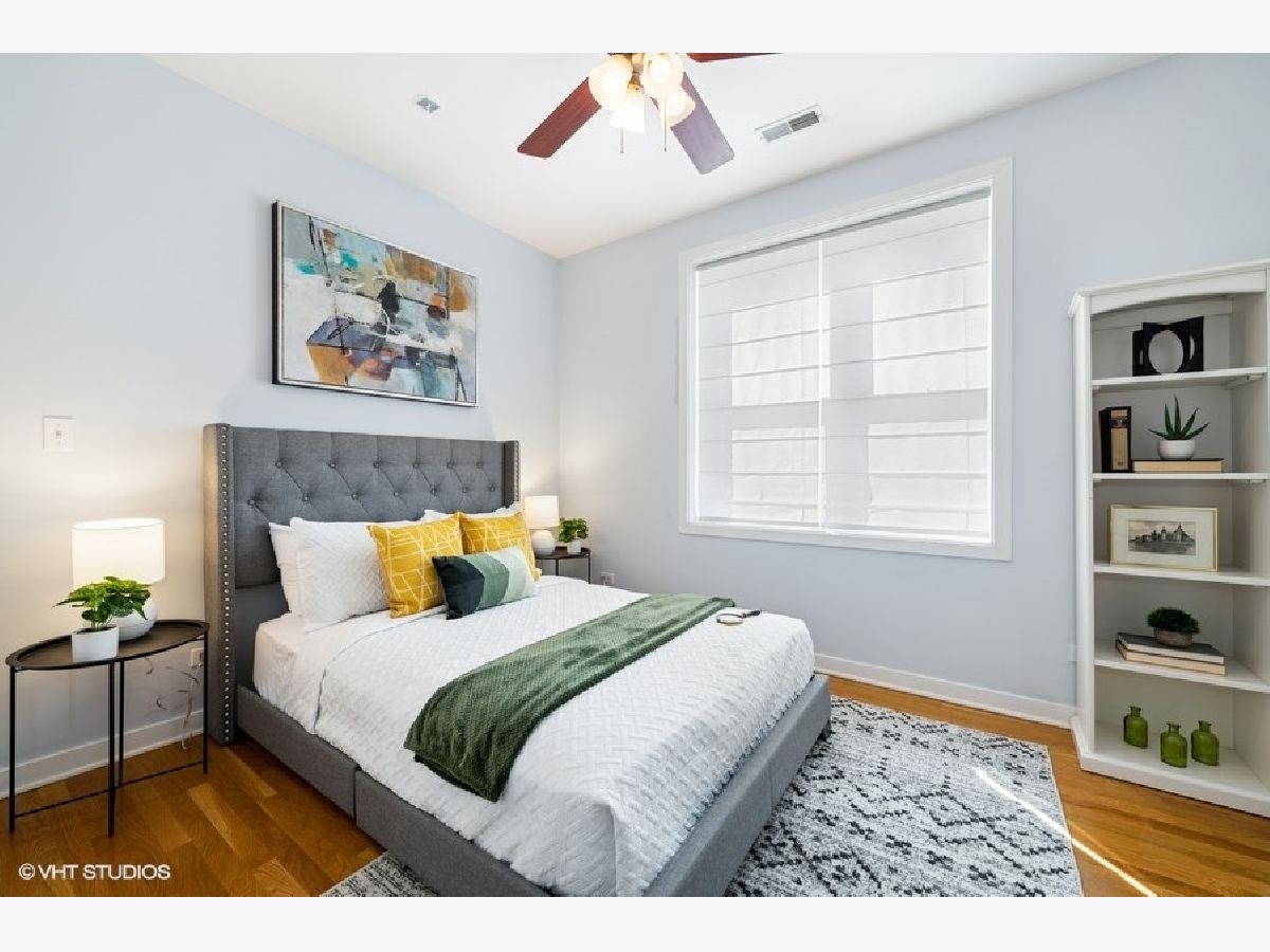 New to market sunny and light 2 bedroom/2 bathroom condo 1 block from The 606. Open concept main living area with a bay window allows natural light to flood into the space. European style kitchen with German appliances including built in refrigerator/freezer and dishwasher. Large granite island with waterfall edges. Recessed LED lights in the foyer and main living area. Nice sized bedrooms with large closets. Bathrooms boast modern look with custom tile in each. A jacuzzi tub in the first bathroom along with a floating vanity and stand-up shower in second bath. Natural hardwood floors throughout, In-unit washer/dryer, pre-wired for surround sound. Additional storage in rear common space 3x7. Easy permit street parking. Pet friendly. Countless neighborhood amenities abound and include a local grocery store, restaurants, and shops. Solid professionally managed HOA, Monthly HOA $295. New roof and tuckpointing completed in 2021