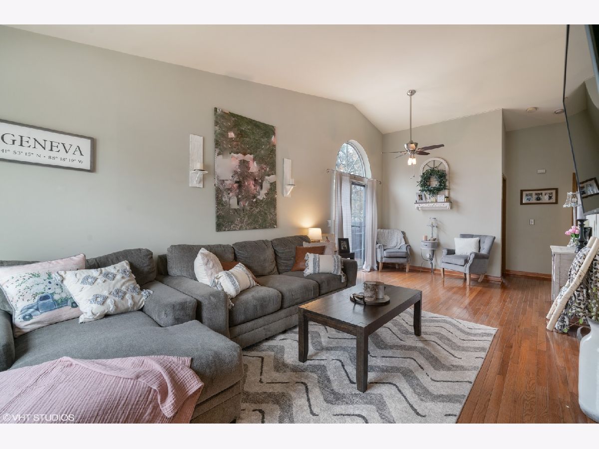 Absolutely perfect, cute, and updated end unit ranch townhome on a very quiet Geneva block! Nothing to do but move in. Bright, clean and neutral throughout - offering ship lap, hardwood floors on main level, newer stainless appliances, kitchen backsplash and all new windows. Much more spacious inside that it looks from the outside. Vaulted ceilings offered in the sun-drenched dining/living room - ideal for a perfect entertaining space. Master bedroom has a walk-in closet. Plenty of storage in kitchen with taller cabinets and quartz countertops. Finished basement adds large entertaining space, 3rd bedroom, a full bathroom with a whirlpool tub and utility room with extra laundry and storage. Sip coffee on your oversized private deck with very large grassy view perfect for outdoor games. Please Don't forget to see the garage parking. Great community with many amenities including pool, Geneva splash park, and clubhouse. Sunrise Park and Prairie Path are also just steps away. Highly ranked Geneva School District. Convenient to downtown Geneva, Metra access, and shopping.