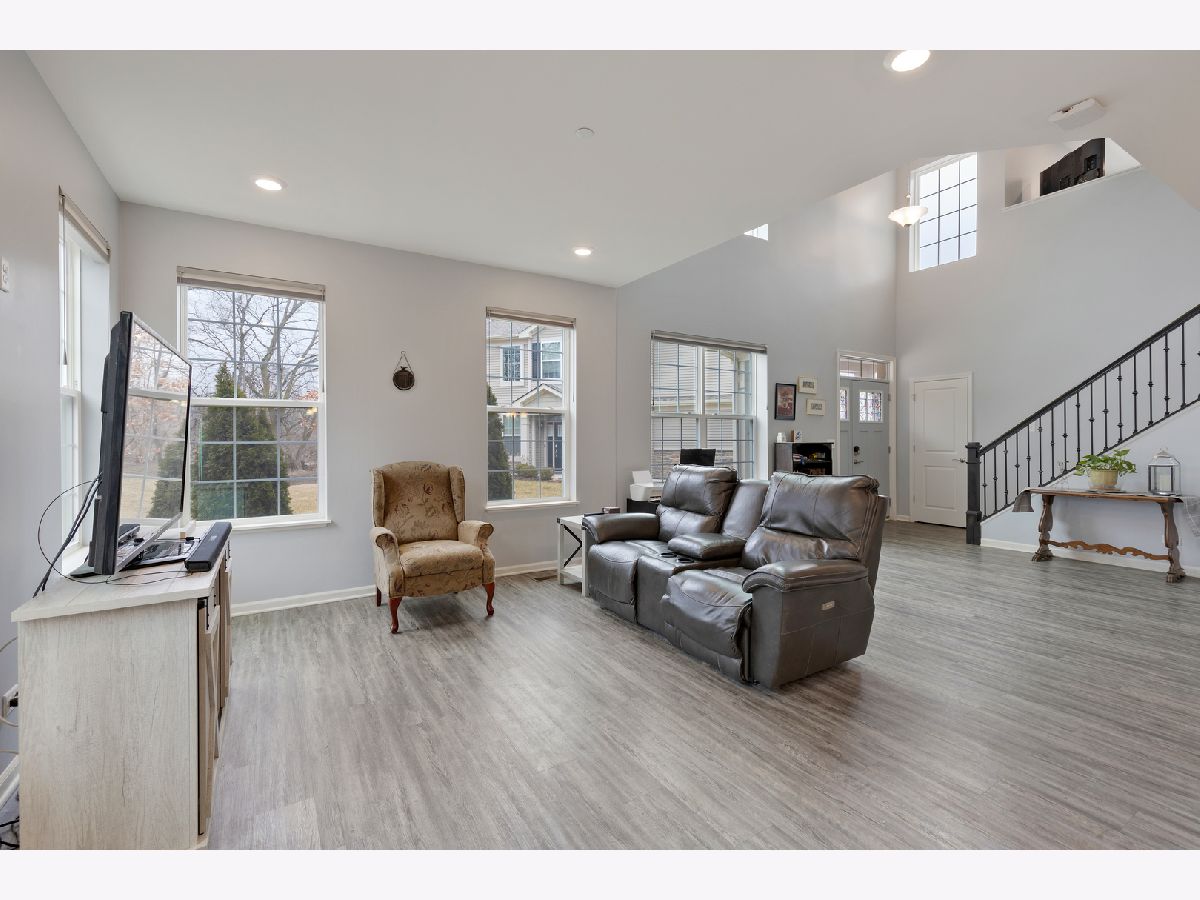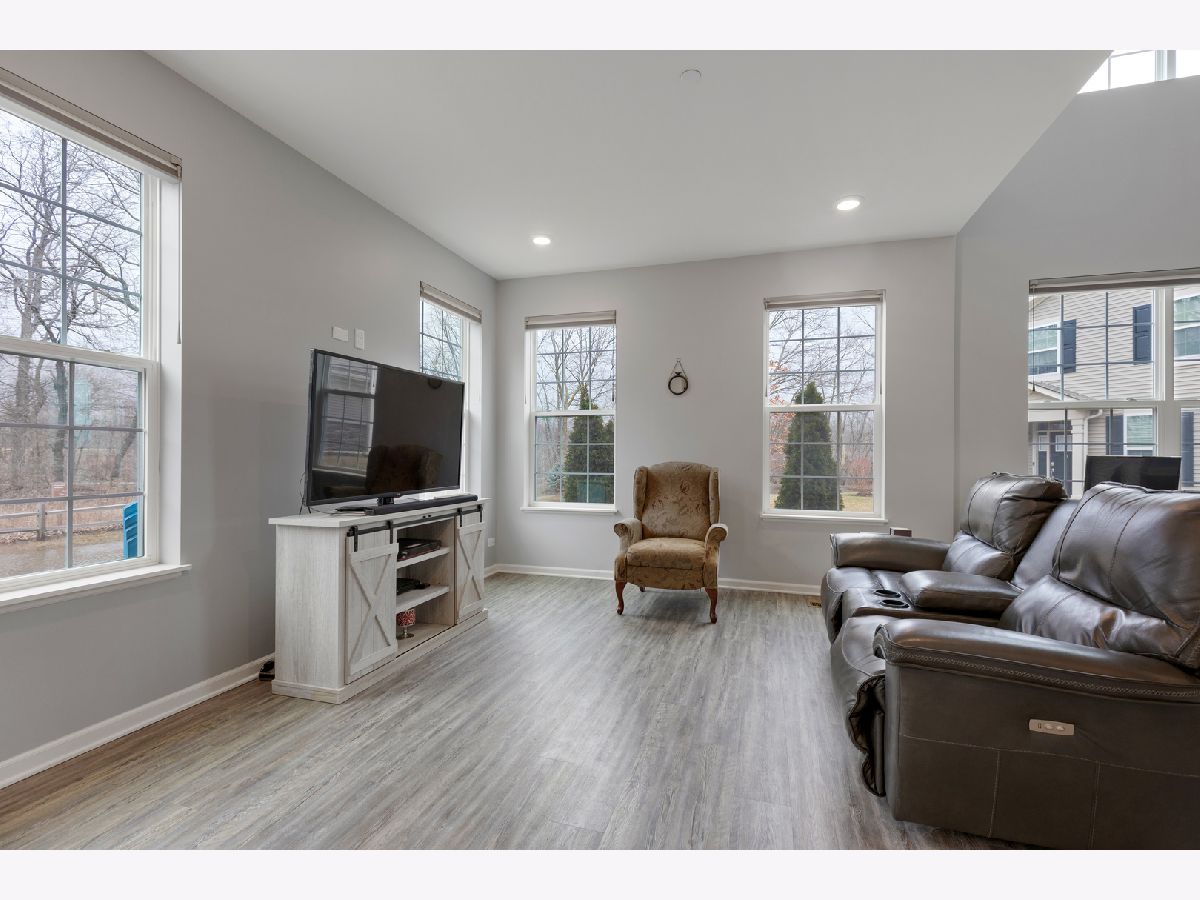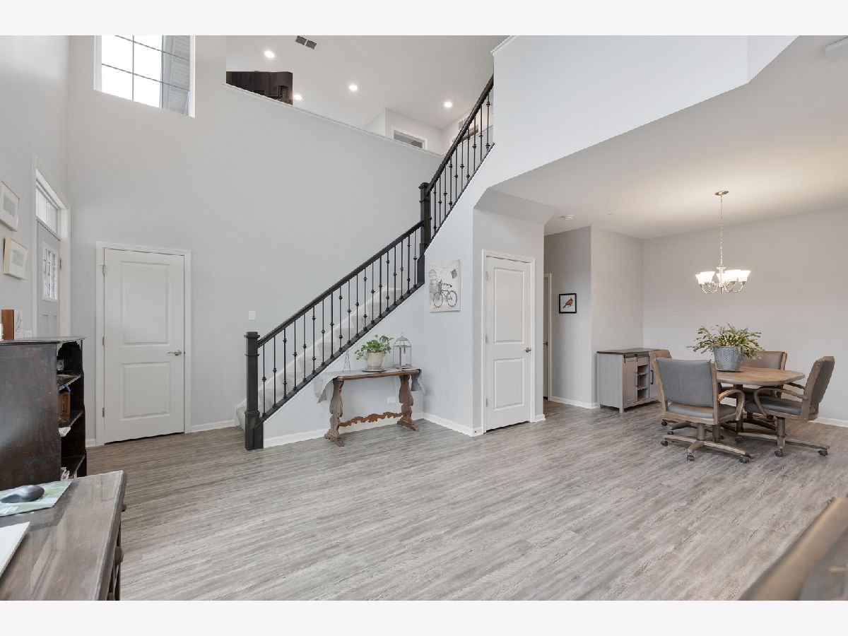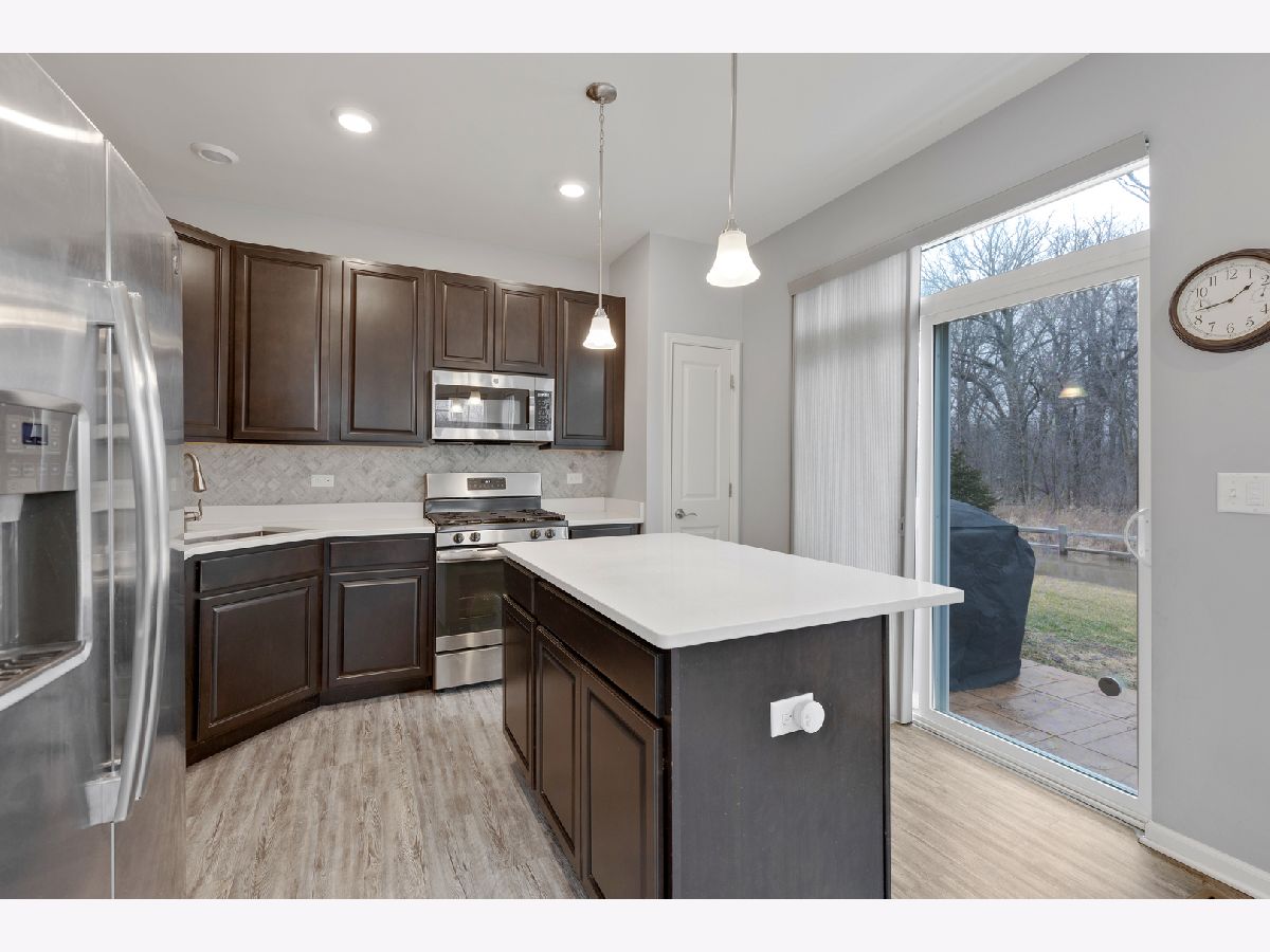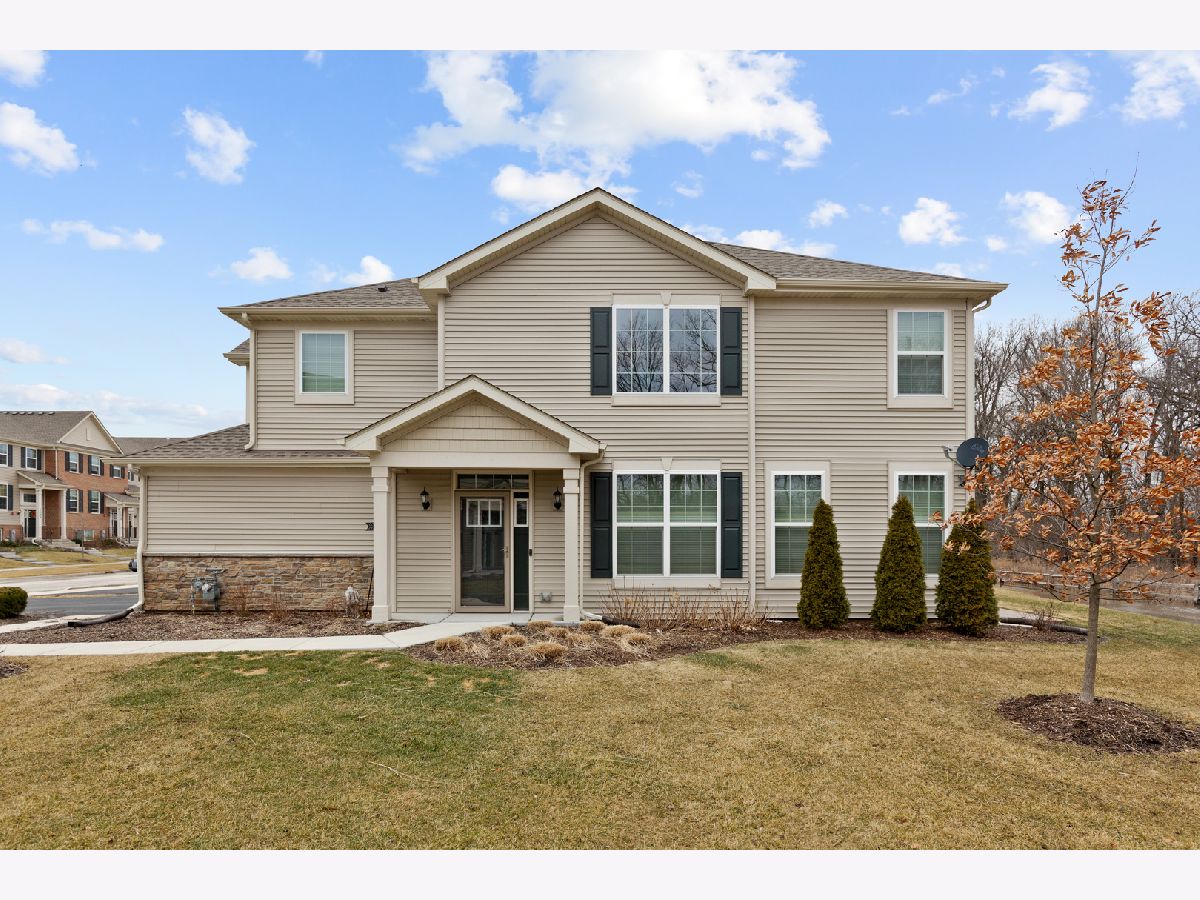 END UNIT on one of the best lots in the community! Enjoy the expanded stamped concrete patio looking out to a pretty wooded area. The big side yard is a bonus when you're entertaining or need space for the kids to play. So many sought after upgrades... luxury vinyl plank on entire main floor, 9 foot ceilings, 42" maple cabinets and white frost quartz in the kitchen, convenient breakfast bar that is open to the family room, GE stainless steel appliances, decorative wrought iron stair railings, white two panel doors throughout, video doorbell & Honeywell smart thermostat. The master bedroom is generously sized with an impressive walk in closet and en suite with a brand new tiled walk in shower & glass door. The loft works well for a home office, exercise room or play room and it has a lovely pond view. Prairie Common is minutes from shopping and very convenient to I-88.