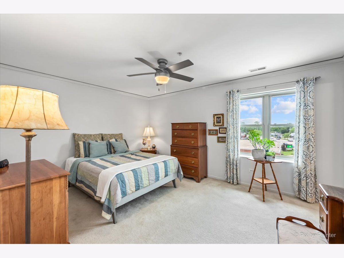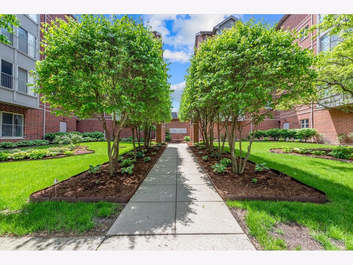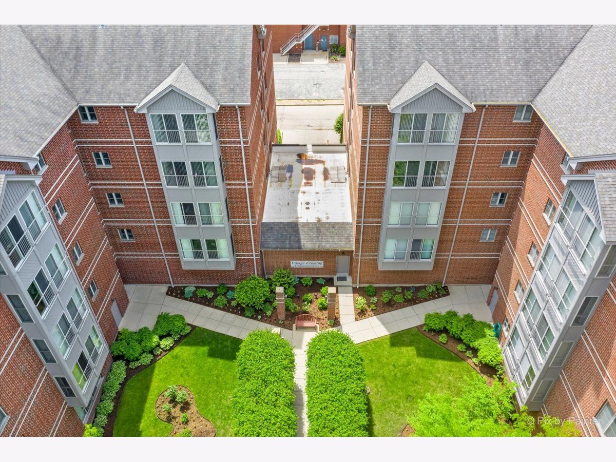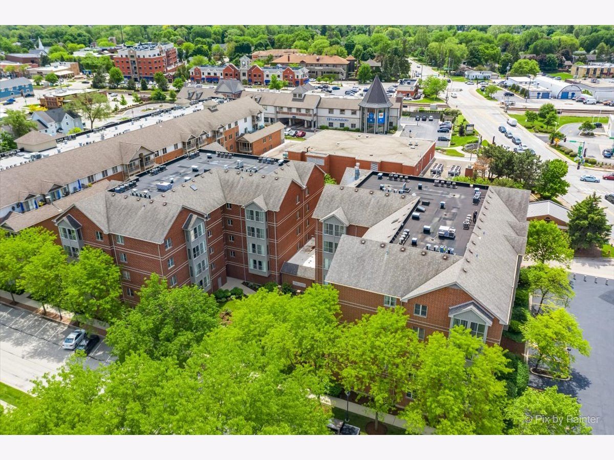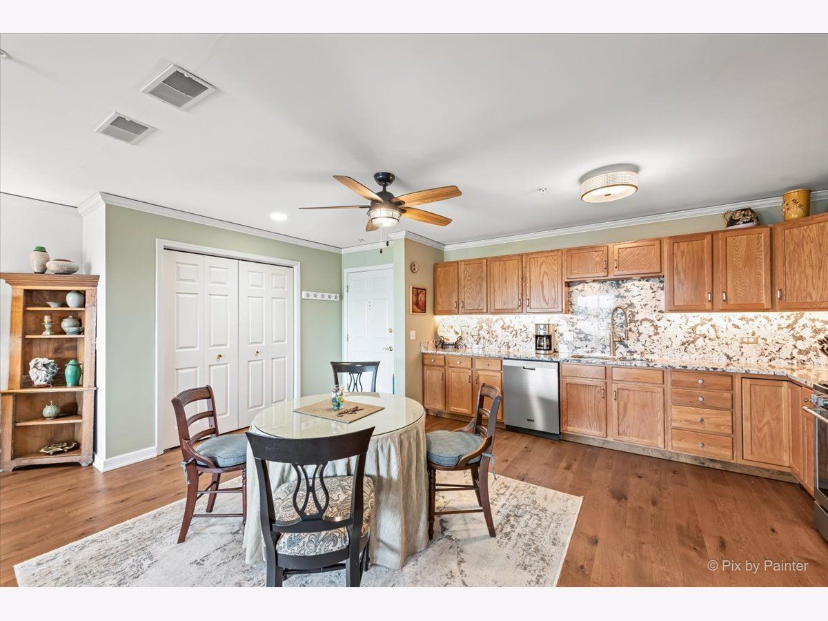 Elegant and sunlit top-floor corner unit, basking in the warmth of southern exposure, features an inviting outdoor balcony for relaxation. Enjoy the convenience of two parking spaces, situated back to back, along with a spacious storage unit on the easily accessible first floor of the heated garage, conveniently located near the elevator. The master bedroom boasts a generously sized walk-in closet and a luxurious ensuite bath with double sinks and a heated floor. The kitchen includes high-end stainless steel appliances, complemented by sleek granite countertops, creating a modern and stylish culinary space. The residence is designed with an open concept, highlighting hardwood floors that flow seamlessly through the kitchen, dining, and living room areas. Impeccable details enhance the interior, including newly installed crown molding throughout, as well as contemporary fans and light fixtures. A dedicated in-unit laundry room adds to the practicality, featuring a sink and ample cabinets for storage. Perfectly situated, this residence is in close proximity to a variety of amenities, including renowned restaurants, picturesque parks, a winery, and a convenient Metra train station, ensuring a lifestyle that blends luxury and accessibility.