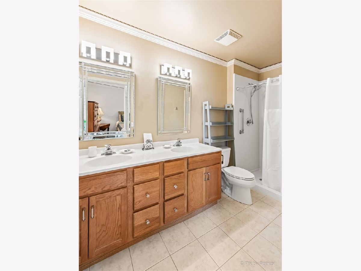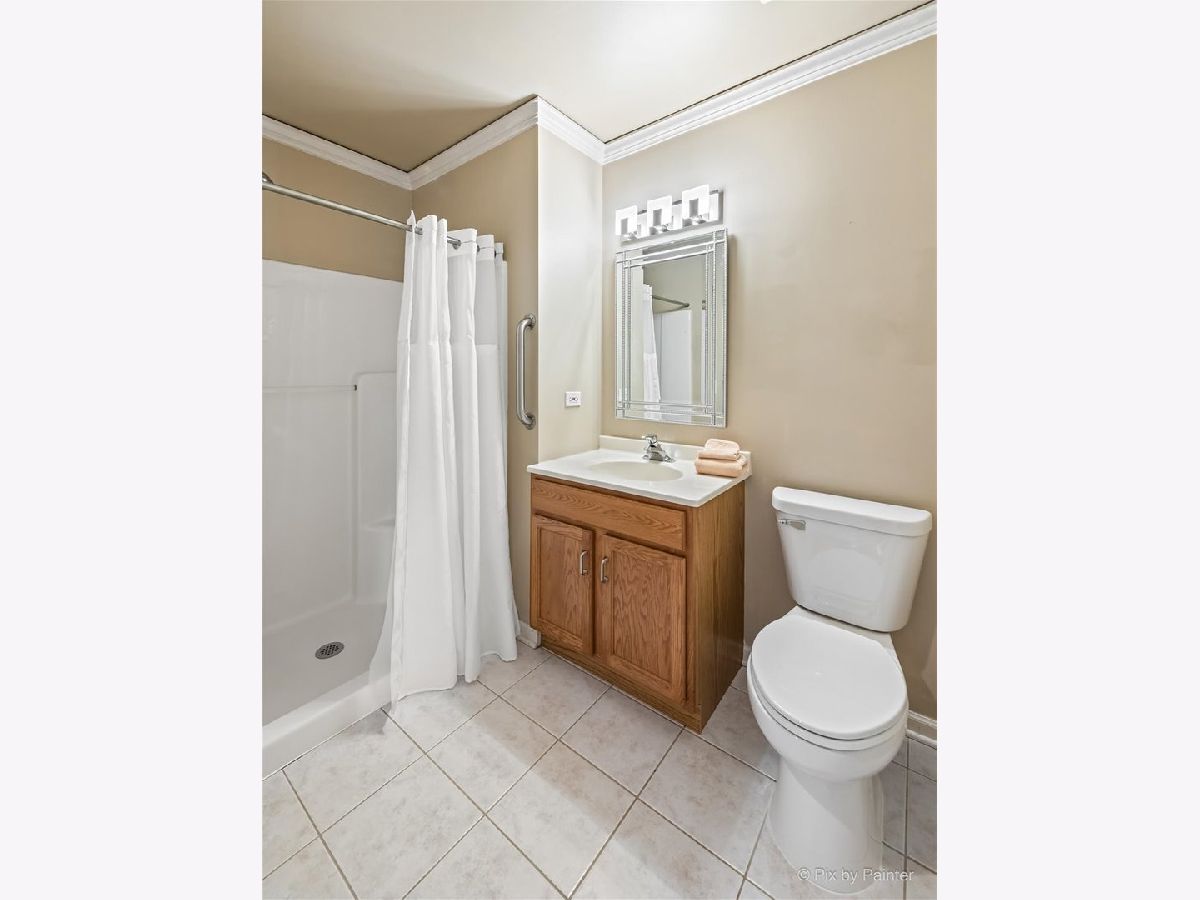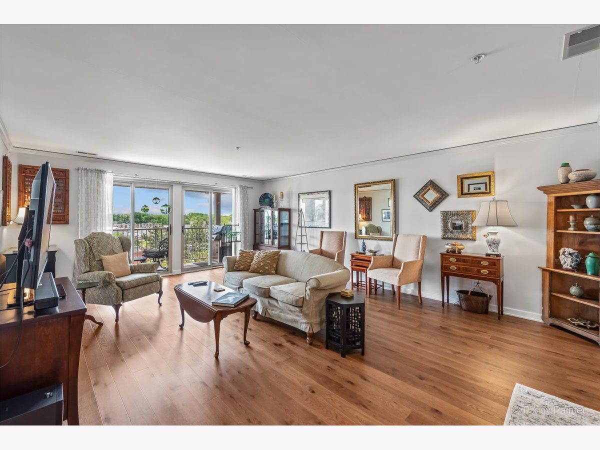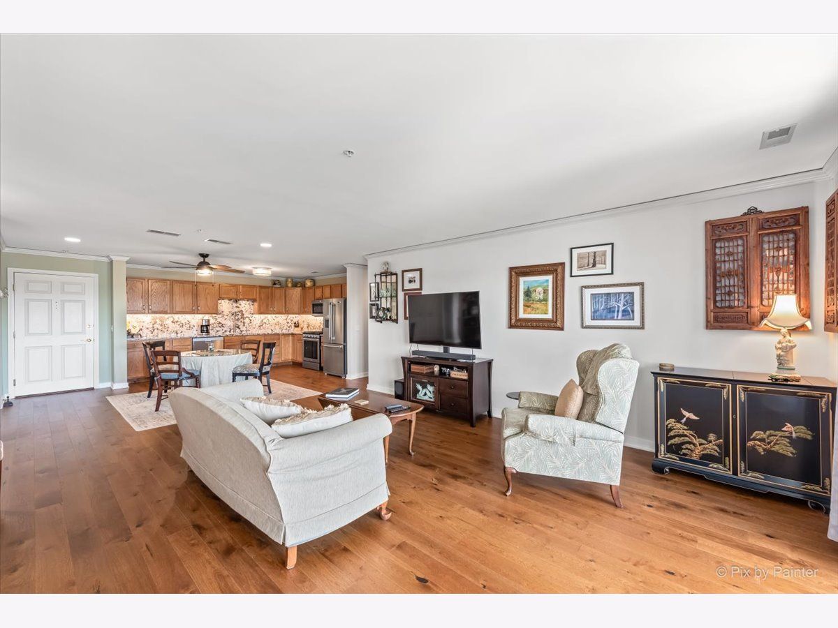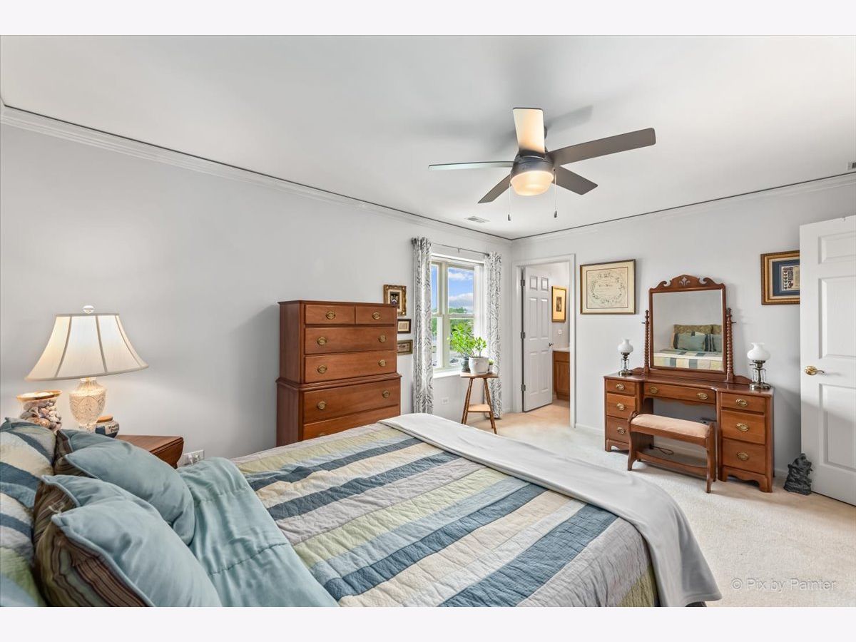 Elegant and sunlit top-floor corner unit, basking in the warmth of southern exposure, features an inviting outdoor balcony for relaxation. Enjoy the convenience of two parking spaces, situated back to back, along with a spacious storage unit on the easily accessible first floor of the heated garage, conveniently located near the elevator. The master bedroom boasts a generously sized walk-in closet and a luxurious ensuite bath with double sinks and a heated floor. The kitchen includes high-end stainless steel appliances, complemented by sleek granite countertops, creating a modern and stylish culinary space. The residence is designed with an open concept, highlighting hardwood floors that flow seamlessly through the kitchen, dining, and living room areas. Impeccable details enhance the interior, including newly installed crown molding throughout, as well as contemporary fans and light fixtures. A dedicated in-unit laundry room adds to the practicality, featuring a sink and ample cabinets for storage. Perfectly situated, this residence is in close proximity to a variety of amenities, including renowned restaurants, picturesque parks, a winery, and a convenient Metra train station, ensuring a lifestyle that blends luxury and accessibility.