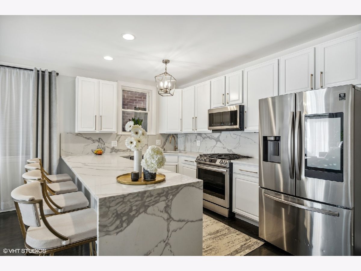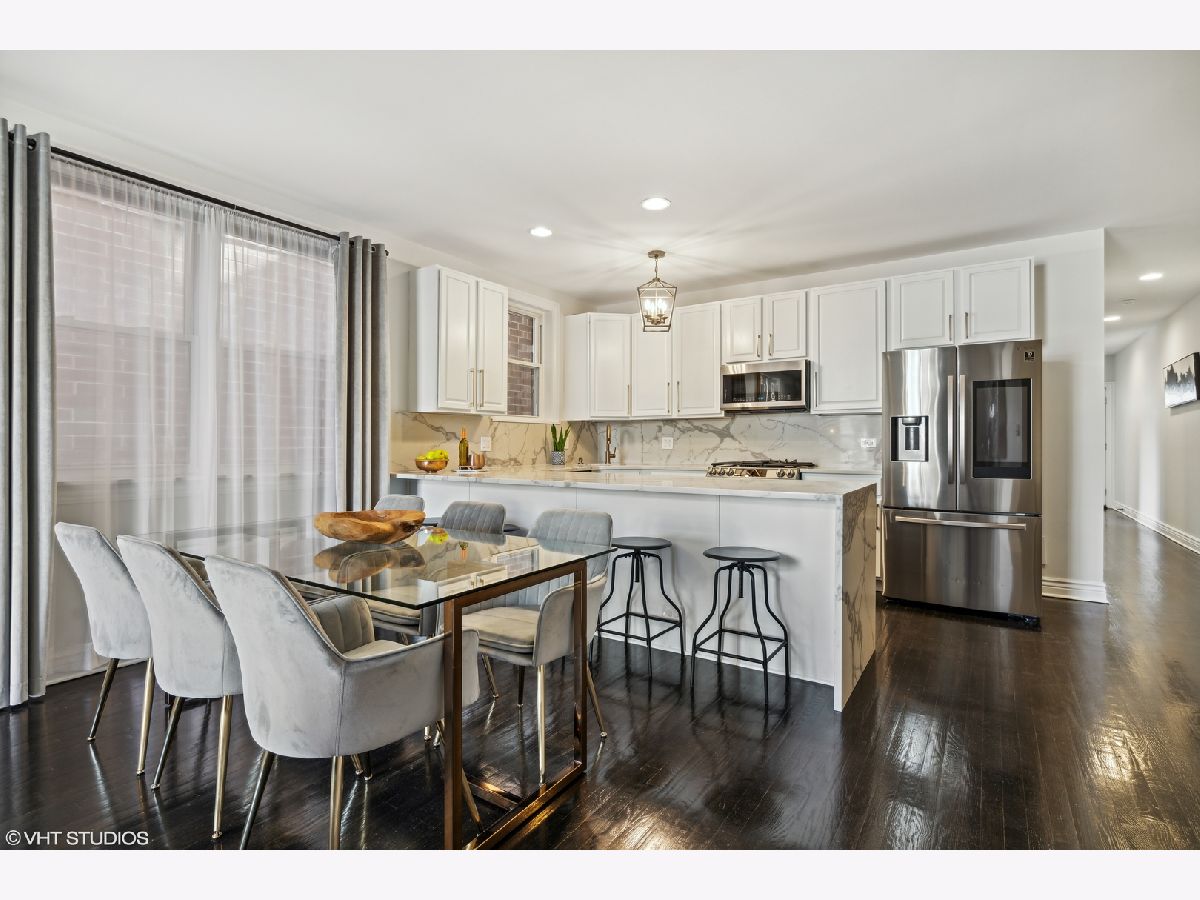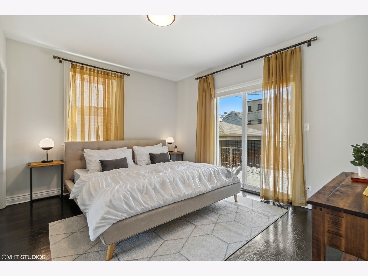 Beautifully updated 3 bed, 3 bath duplex down in Logan Square! This home has a fully renovated kitchen with oversized quartz peninsula, all new appliances in 2021 including built-in wine fridge, professionally refinished cabinetry with new hardware. Refinished dark white Oak hardwood flooring and new "wood look" tile throughout lower level. Front balconies off living space up and down. New light fixtures throughout. Fully renovated primary and second bath on main level. 3rd bath on lower level partially updated with new vanity, mirror and lighting. 3rd outdoor space off the primary bedroom with additional access through the back hallway. 2 wood burning fireplaces with gas starters, one on each level. New water heater in 2022. Extra storage room in lower lever + exterior gated parking included. Entrance to the 606 Trail at Whipple/Albany-Julia de Burgos Park. Surrounded by new construction situated on a quiet, tree-lined street.