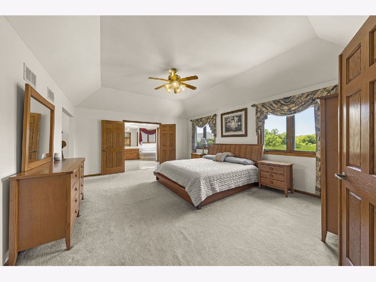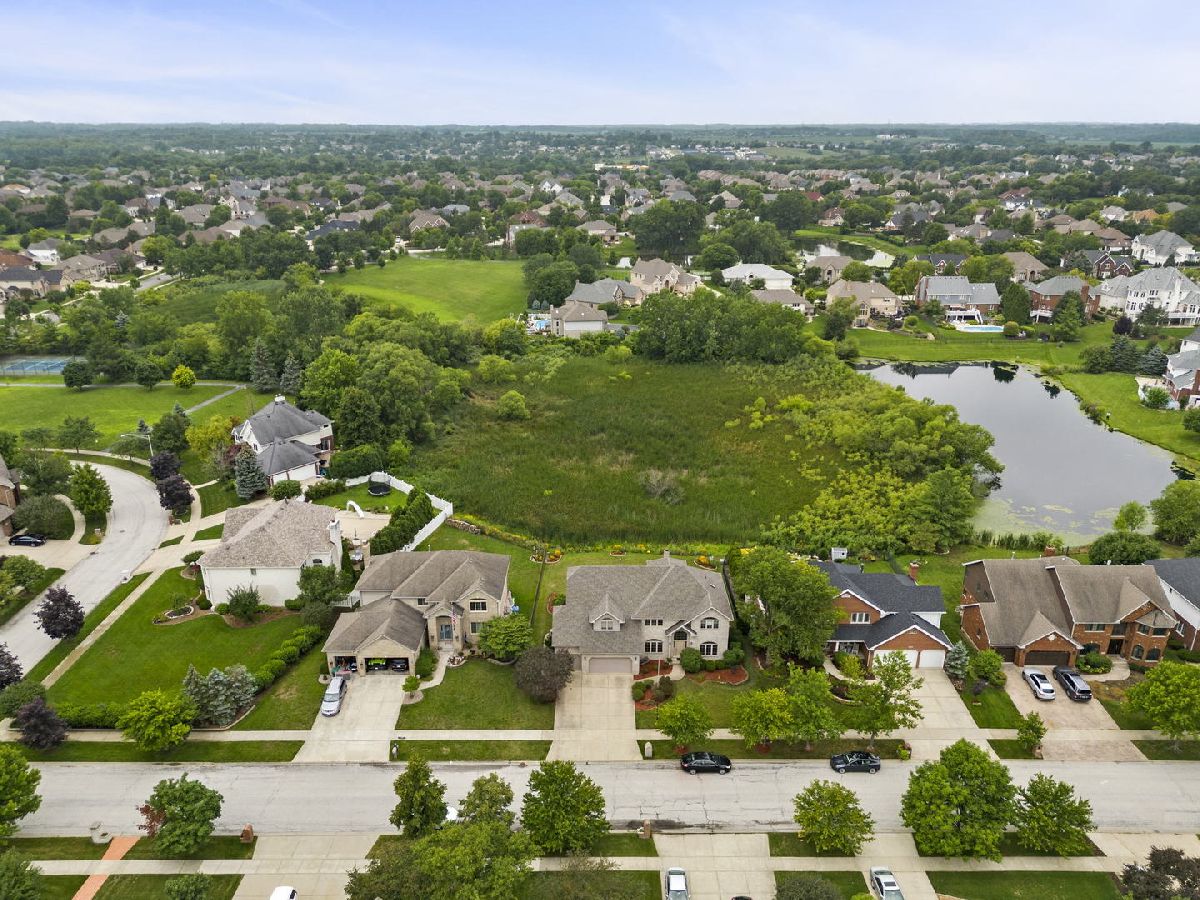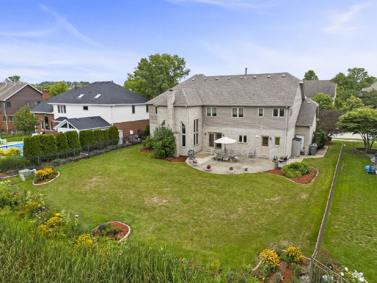 Welcome to the desirable Emerald Estates Community in Orland Park. This custom built home with new roof (2022) and A/C (2021) has superb curb appeal and does not disappoint! Premium lot offers oversized patio with full privacy overlooking natural wetlands and mature perineal flowering beds. The 2-story main entry provides a glimpse of the home's beauty, from the majestic staircase and beautiful hardwood floors to a formal dining room with crown molding detail and french doors leading into the library with custom built-in's. The great room with cathedral ceiling and impressive brick fireplace provides tremendous natural light and captures the tranquil beauty of the backyard with its floor to ceiling windows. Large gourmet kitchen with new SS Samsung range and microwave hood (2022) includes a wet bar and eat-in dining space with sliding doors to patio also providing additional views of the private backyard oasis. Enter through the double doors into the second floor over-sized master ensuite with adjacent flex space large enough for home office, nursery or private exercise area. Enjoy the first floor view from the catwalk while you make your way to the remaining three spacious bedrooms all with ample closet space. Entertaining is a must with the impressive full finished basement which features a theater room, custom built wet-bar with beverage cooler and game room separated by full-glass french doors. Lower level also includes a large home office with more custom built-in's. Fresh paint, custom landscaping and full irrigation system completes this pride of ownership. Don't miss this opportunity!!
