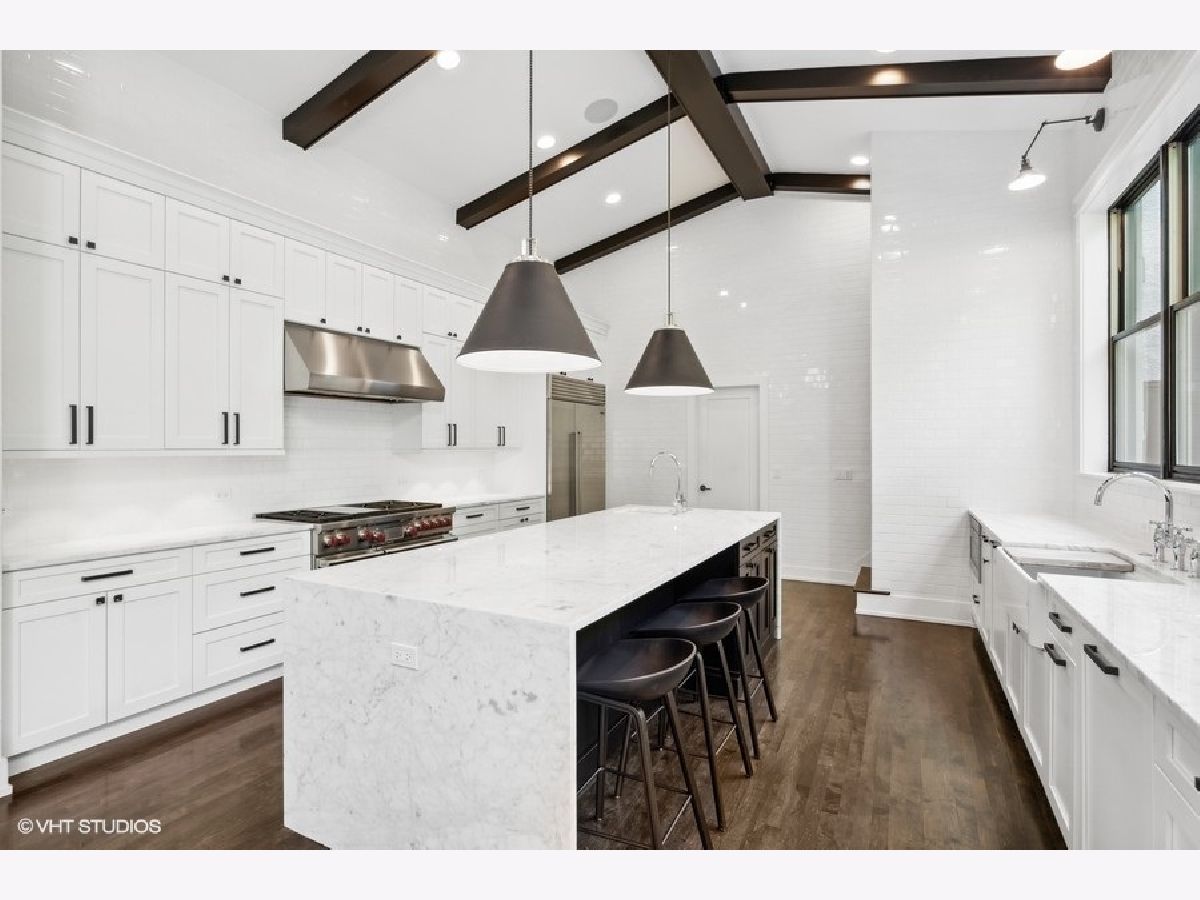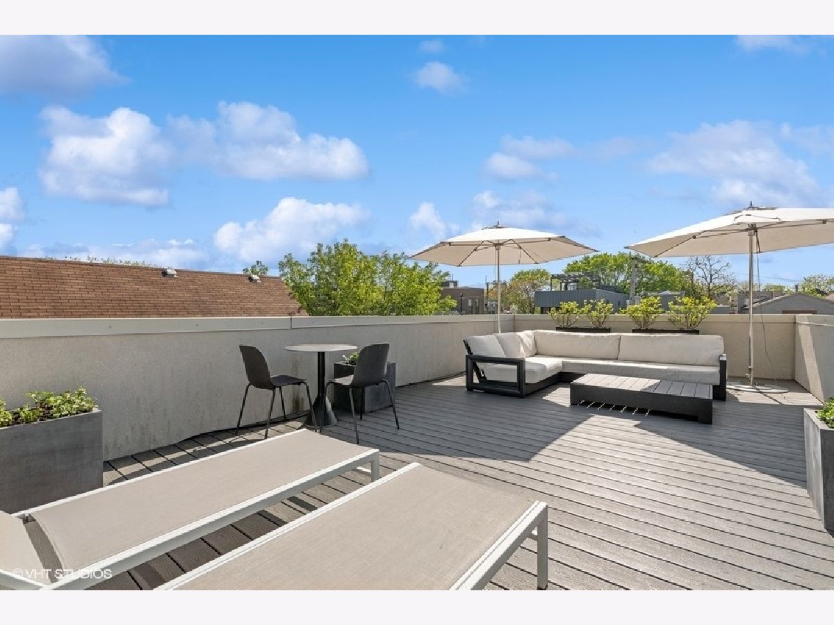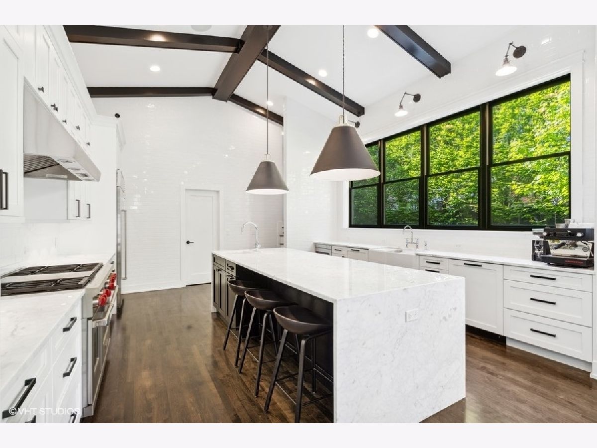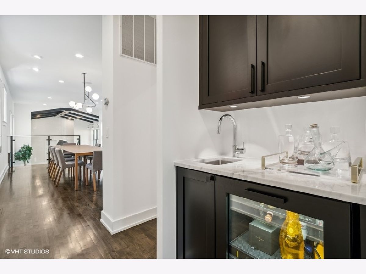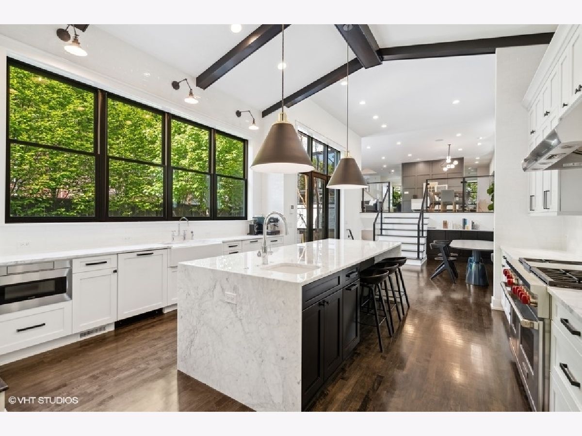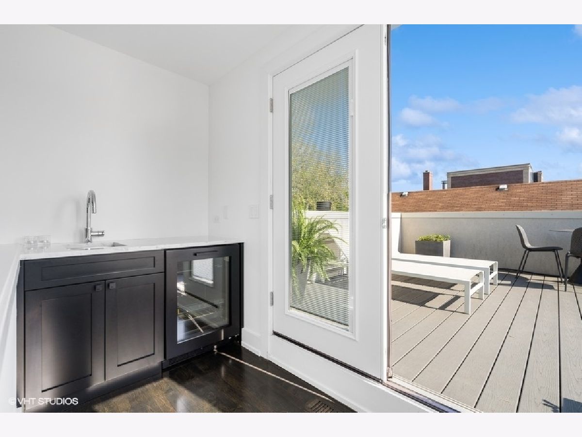 This is Bucktown at its very best, with five bedrooms, three full and one-half baths, and more than 5,000 square feet of contemporary living space on extra-wide lot. Meticulously thought-out and fully remodeled to pristine quality with custom designer extras throughout, this home boasts the ideal configuration for entertaining while perfectly fulfilling the needs of daily life. Impeccably rare, one-of-a-kind attached 3 car heated garage with electric charging station. The kind of kitchen that would make you stop and stare in a showroom centers the home. The sleek and sophisticated space features an expansive 11-foot, eat-in island with double waterfall edge, floor-to-ceiling subway tile, marble countertops, and top-tier appliances including a 48-inch Wolf range, Sub-Zero refrigerator, and dual Miele dishwashers. The 13-foot ceilings are dressed with rich beams, a bank of windows over the farm sink brings in tons of natural light, and an immense walk-in pantry and built-in buffet provide abundant storage. Adjacent is an informal eating area that looks out and provides immediate access to the landscaped designer yard, where an outdoor kitchen and fireplace await. Open to the kitchen is the sunny, formal living room with floor-to-ceiling fireplace and urban loft-style family room and dining room. On the bedroom level, the primary suite's private terrace and luxurious marble bath with dual sinks, separate vanity area, freestanding soaking tub, and oversized walk-in shower are matched only by the incredible, massive walk-in closet. Two additional bedrooms, a full bath, and the second of two laundry rooms round out this floor. Ascend to the penthouse level to enjoy the open air of the southwest-facing rooftop terrace with a beverage from the wet bar with refrigerator. Or head down to the fully finished lower level with a large recreation/media room and custom 700-bottle wine cellar. Steps from the 606 and Bucktown and Wicker Park's famed restaurants and shopping. What more could you want?!