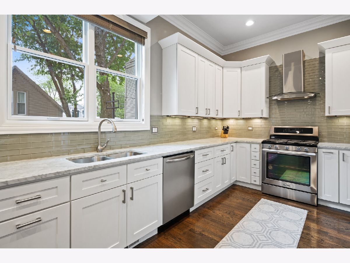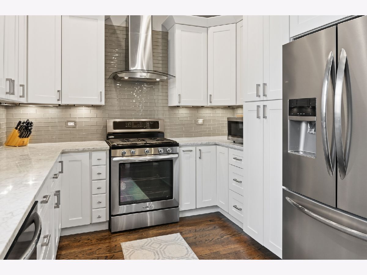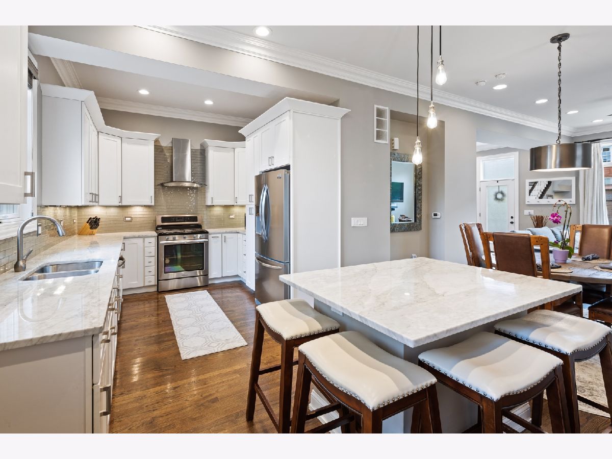 Very rare find in West Bucktown: low taxes, like-new construction single family home, and a bonus well maintained coach house! Beautifully redone West Bucktown single family home. Built brand new in 2015, this home features hardwood floors, crown molding, wood double hung Pella windows, a main level open concept that's perfect for entertaining, and loads and loads of storage. The kitchen features 42 inch white Shaker style cabinets, Carrera marble countertops, stainless steel appliances, plenty of kitchen storage, and a marble island with beverage fridge. Upstairs you'll find two generously sized bedrooms, a hallway bath, and a primary suite featuring vaulted ceilings, a walk-in closet, and bathroom with a large double vanity and walk-in shower. The lower level has high-ceilings, a full bath marble bath, and versatile rec room that could also convert to a 4th bedroom perfect as an in-law suite. The lower level rec room leads to additional storage, a laundry room, and right outside to the maintenance free brick paved backyard. Outback is a massive outdoor space centered around a built-in fire-pit and an elevated patio off the kitchen. Nestled on a quiet one-way street with easy permit parking, and steps to the 606, Western Blue Line stop, and all the bars, restaurants, and shops that Bucktown and Logan Square have to offer!