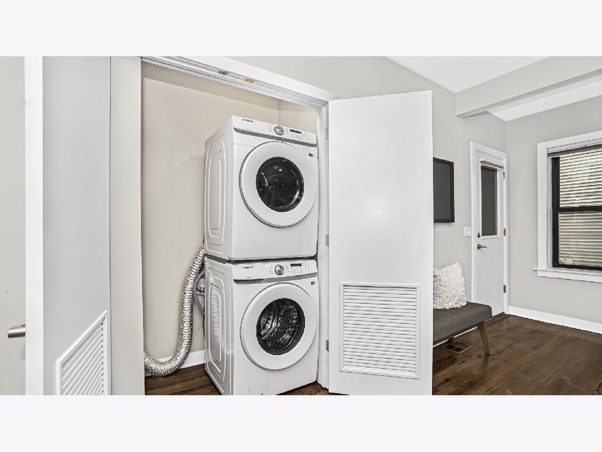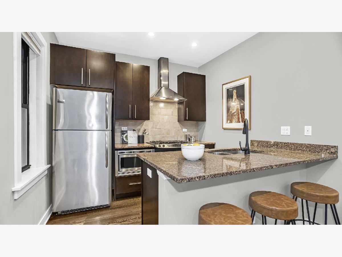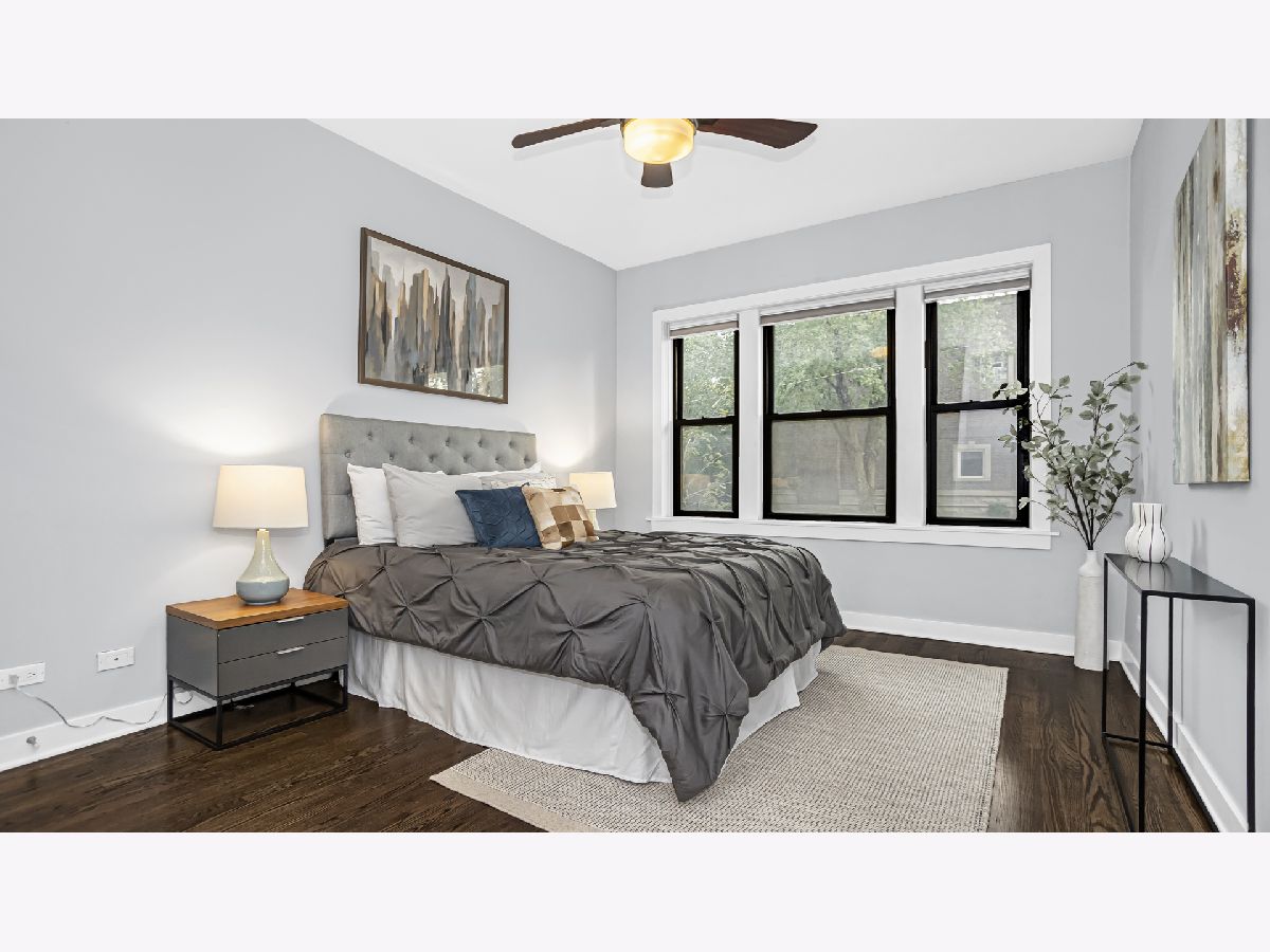 Cozy and well planned 2 bedrooms, 1 bath unit with convenient location close to restaurants, bars, coffee shops and the Brown "L". Walk in and be greeted by an open layout perfect for entertaining and living. Beautiful dark stained hardwood floors and high ceilings thoughout. The kitchen features chocolate-colored cabinets, stainless steel appliances and granite countertops with a practical breakfast bar. Large primary bedroom with space for a king-sized bed. Both bedrooms have ample storage with an organized closet. The bathroom offers jacuzzi tub and quartz countertops. Outside area perfect for all your barbecue needs or morning coffee. Enjoy in unit washer and dryer, private approx. 10x10 storage unit and custom window treatment. This location is unbeatable with walking distance to Southport Corridor, Roscoe Village, North Center, Trader joe's and Brown "L". Easy street parking. Welcome Home!