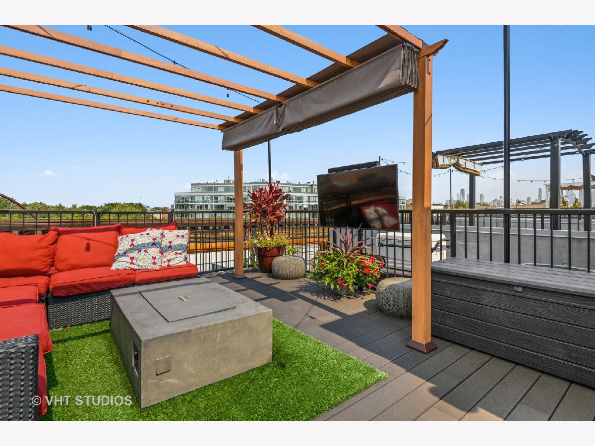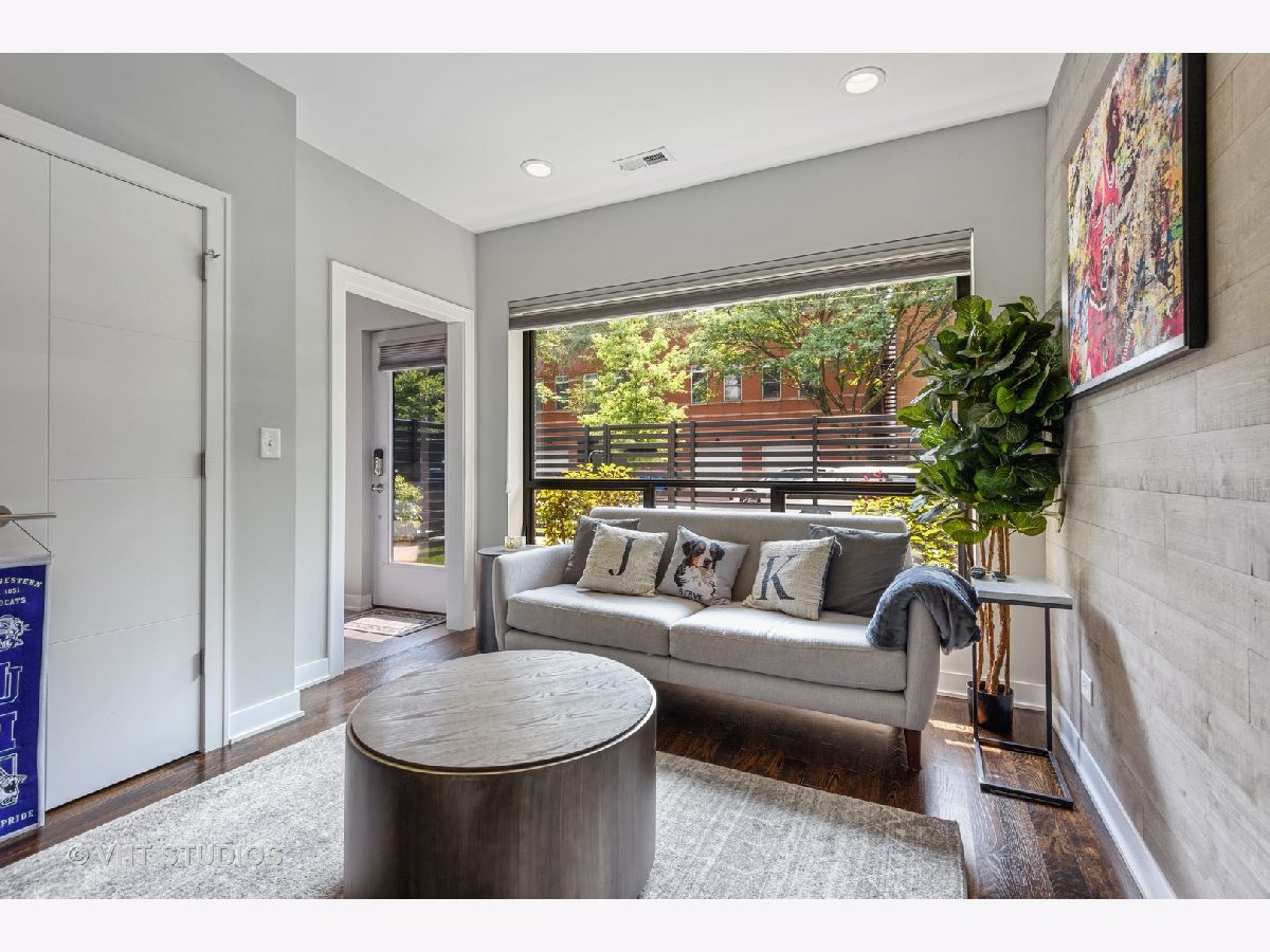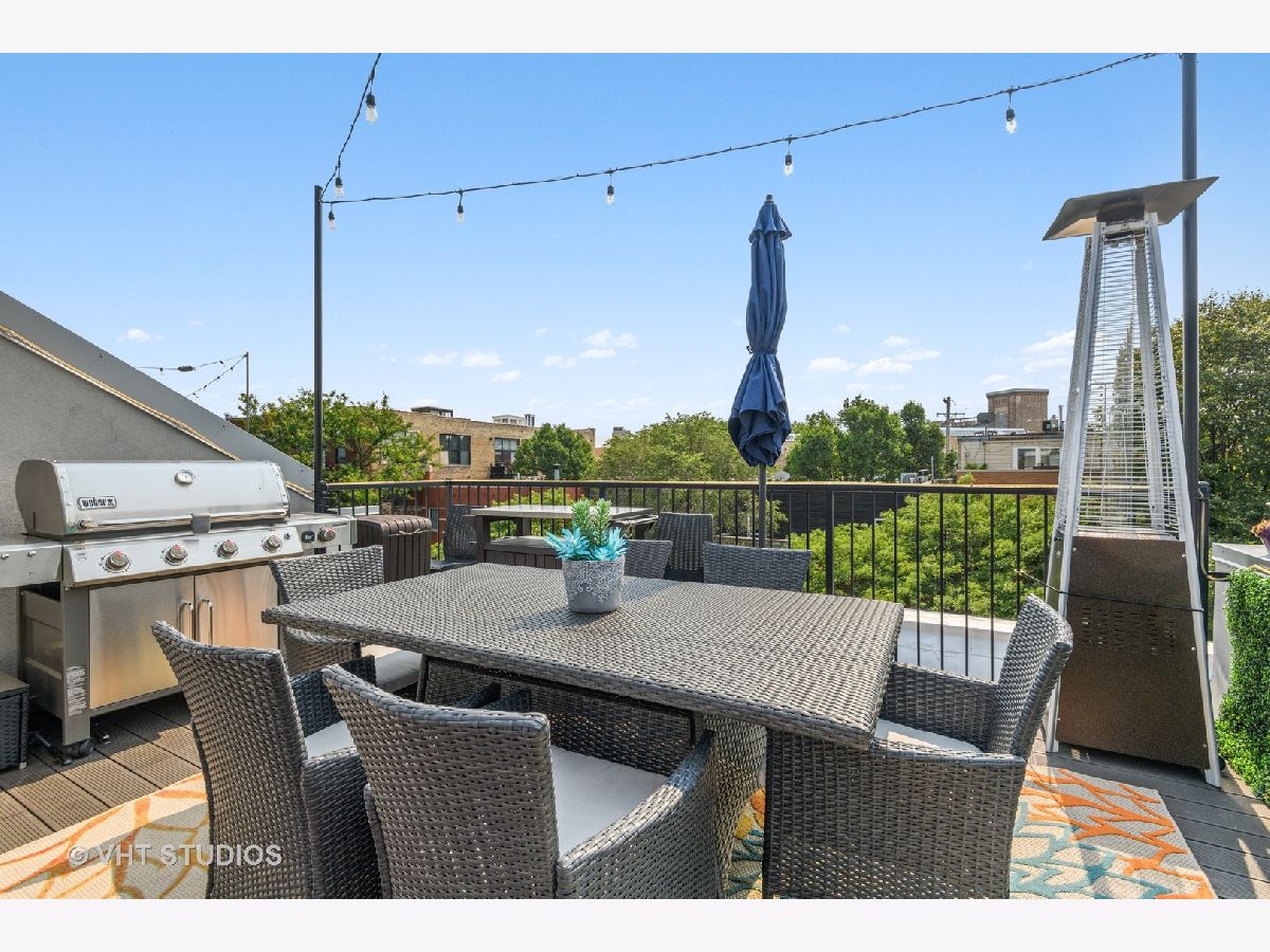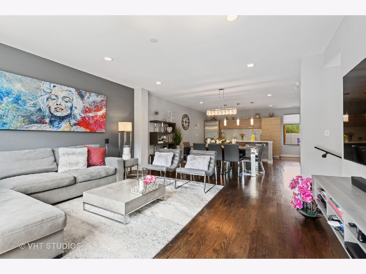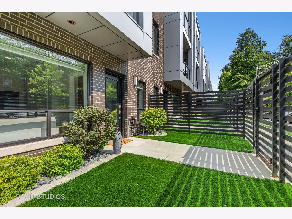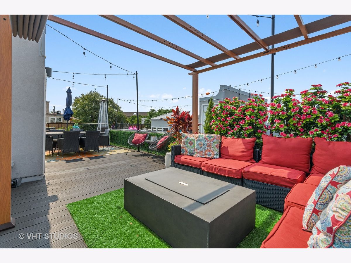 Welcome to The Row Bucktown, built in 2016. This home features four bedrooms, three full baths and a half bathroom on the main/ living room floor. With gleaming, real hardwood floors throughout every level. Your first floor consists of a full bedroom and bathroom along with plenty of closets for extra storage and an oversized two car garage with "Epoxy" floor coating and high ceilings, accessed via a private driveway. The front is inclusive of a 20x15 gated and turfed front yard. The second floor has your living room, dining, and kitchen that is open front to back. Appreciate wonderful amounts of natural light from your floor to ceiling windows that lead out to a 2nd floor balcony. The kitchen has loads of cabinets, ten-foot island, Sub-Zero refrigerator, 36" Wolf range, and a commercial grade hood. The third level has your Primary Bedroom Suite with even more floor to ceiling windows, a spa-like bathroom, with heated floors, and two sizable closets. The second and third bedrooms have custom closets and share a generously sized third bathroom. The roof is made of Trex decking and has sweeping unobstructed city views and a custom Pergola. Gas, water, electric, hook ups for grilling and entertaining. Low assessments and a healthy association.