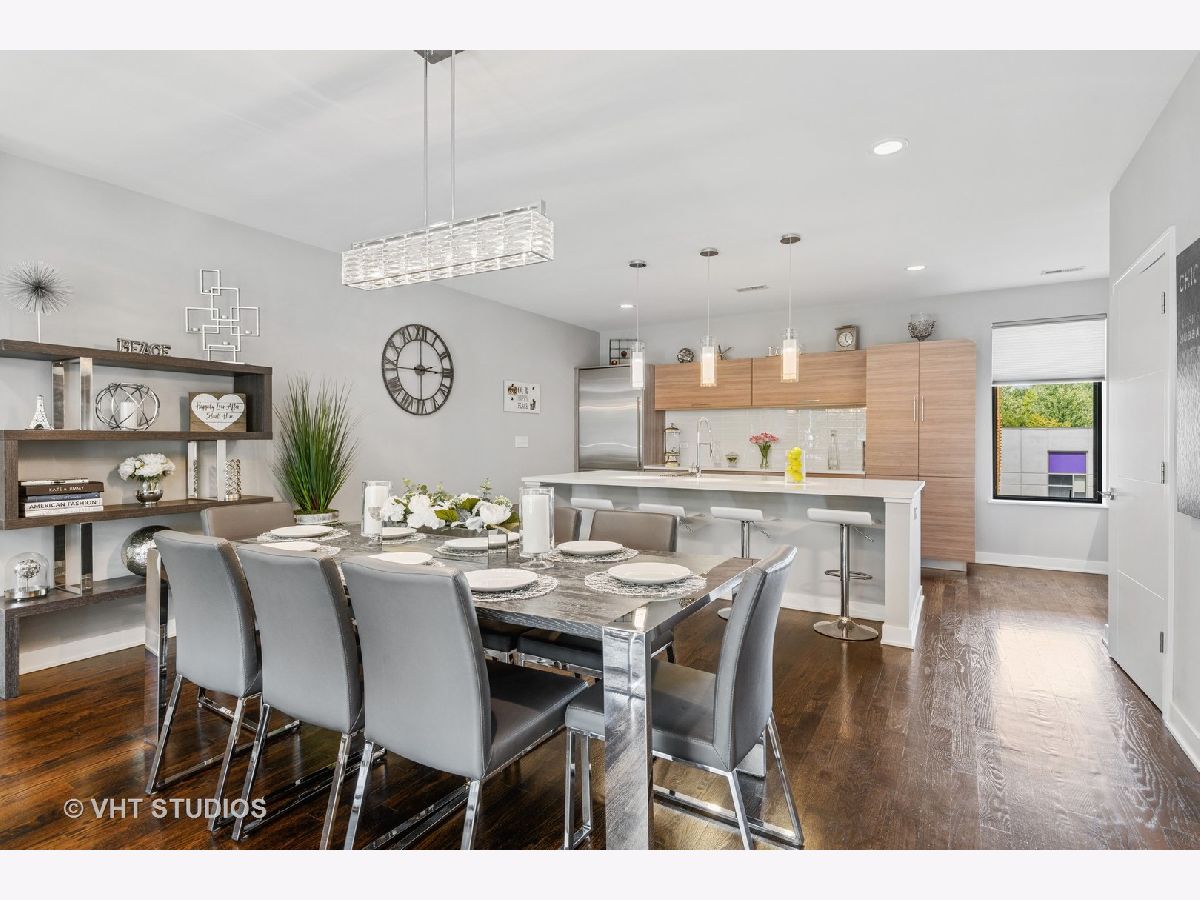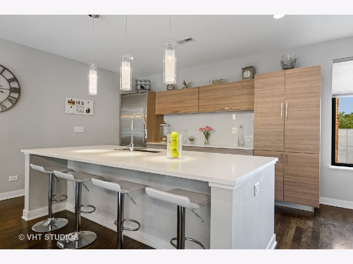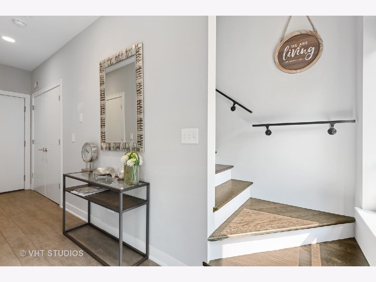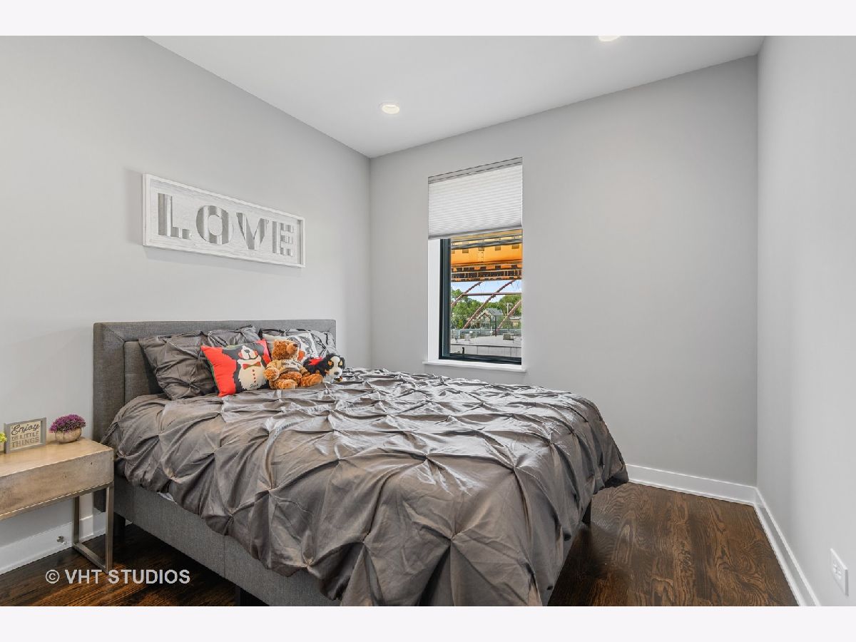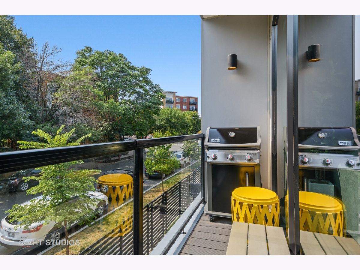 Welcome to The Row Bucktown, built in 2016. This home features four bedrooms, three full baths and a half bathroom on the main/ living room floor. With gleaming, real hardwood floors throughout every level. Your first floor consists of a full bedroom and bathroom along with plenty of closets for extra storage and an oversized two car garage with "Epoxy" floor coating and high ceilings, accessed via a private driveway. The front is inclusive of a 20x15 gated and turfed front yard. The second floor has your living room, dining, and kitchen that is open front to back. Appreciate wonderful amounts of natural light from your floor to ceiling windows that lead out to a 2nd floor balcony. The kitchen has loads of cabinets, ten-foot island, Sub-Zero refrigerator, 36" Wolf range, and a commercial grade hood. The third level has your Primary Bedroom Suite with even more floor to ceiling windows, a spa-like bathroom, with heated floors, and two sizable closets. The second and third bedrooms have custom closets and share a generously sized third bathroom. The roof is made of Trex decking and has sweeping unobstructed city views and a custom Pergola. Gas, water, electric, hook ups for grilling and entertaining. Low assessments and a healthy association.
