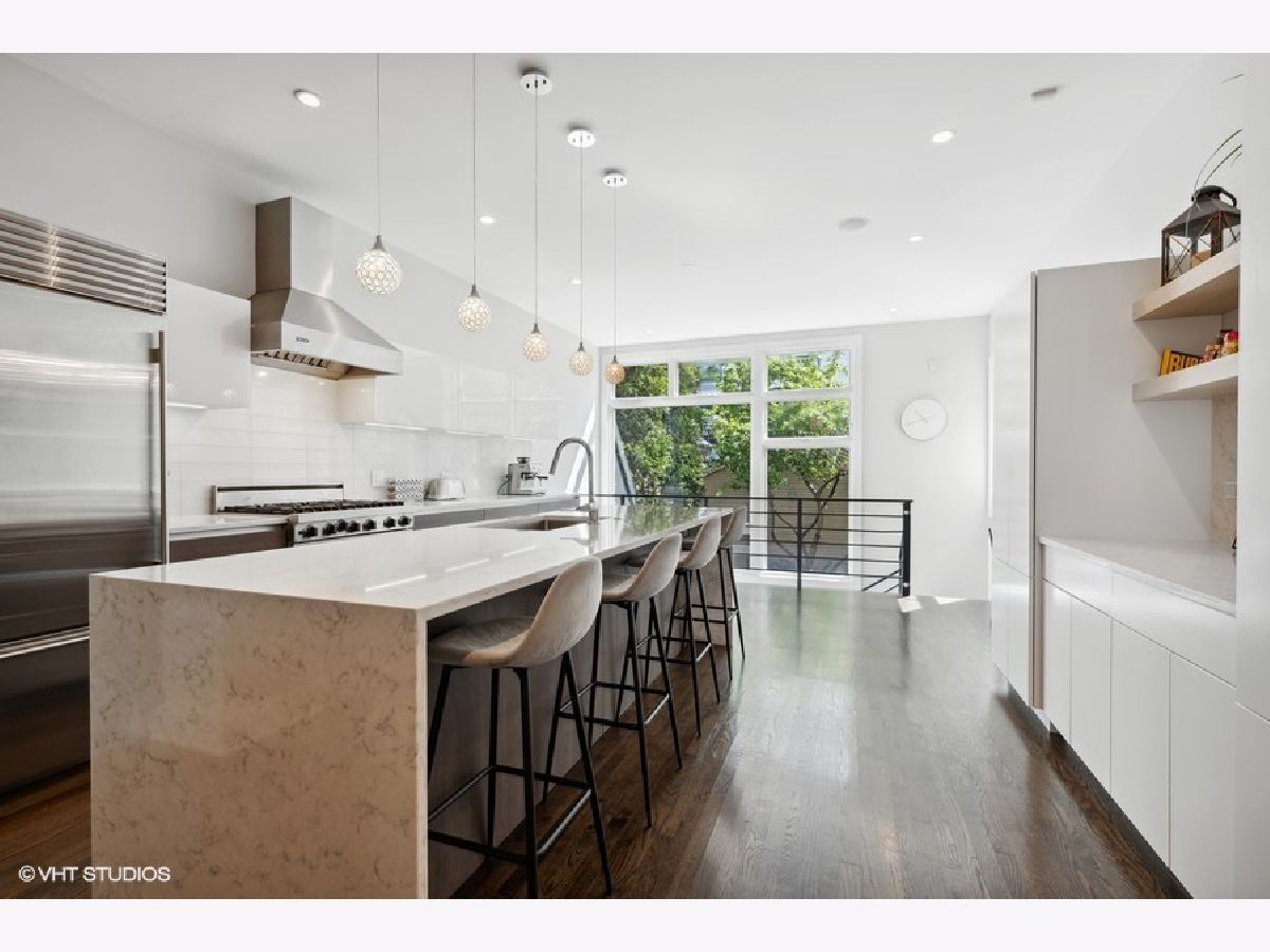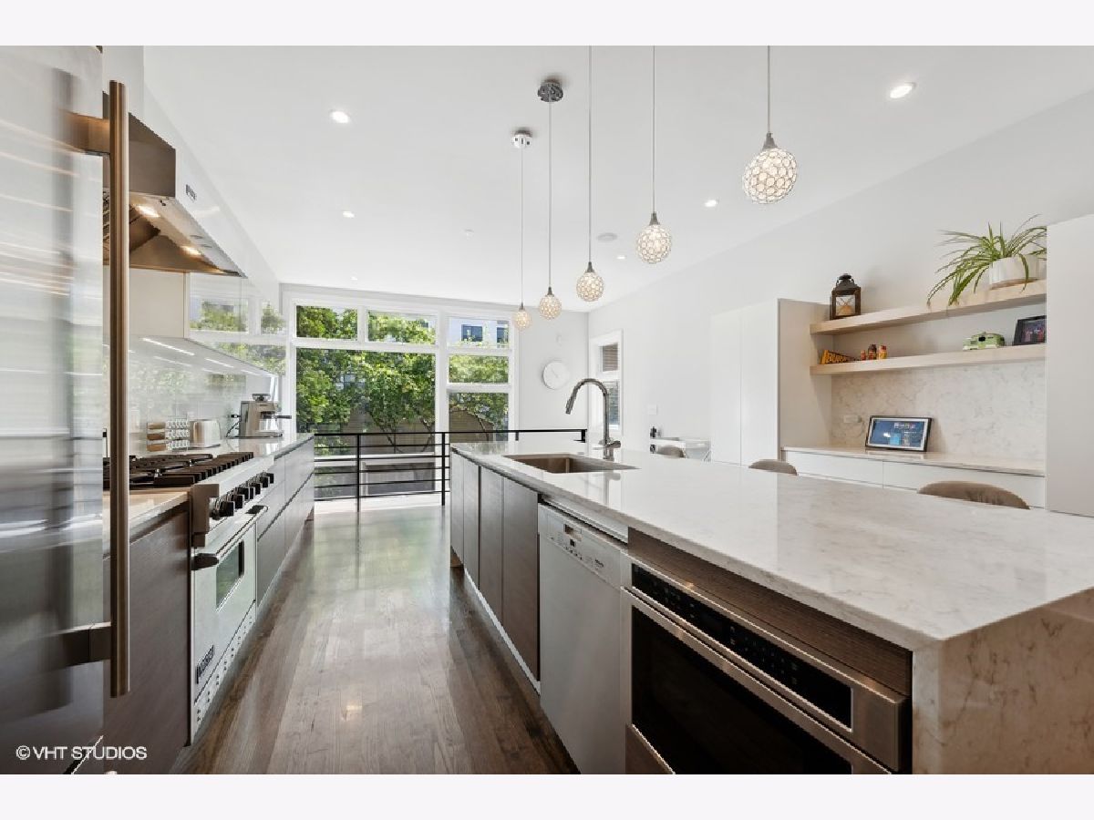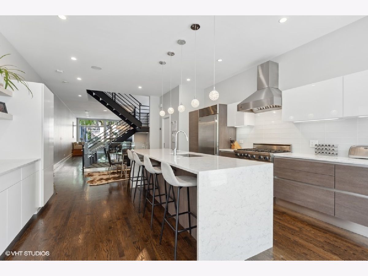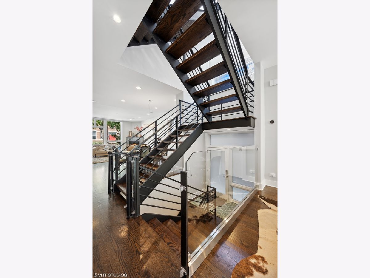 Beautiful, contemporary and well-maintained single family home in one of the best locations in Bucktown. This architecturally stunning 4 bed/3.5 bath with thoughtful updates, amazing staircase, high ceilings, gorgeous central skylight, roofdeck with skyline views and landscaped patio. The open floor plan flows easily from the warm living room to dining room and the beautifully updated chef's kitchen. The recently updated kitchen features custom European cabinets, high-end appliances including a Sub-Zero fridge, Viking gas stove, Miele dishwasher and Bosch drawer microwave with a 10-feet quartz countertop island and glass backsplash, perfect for entertaining. There is plenty of cabinet storage with additional pantry cabinets and countertop space. The upper level has 3 bedrooms, with a main bedroom that has a spacious walk-in custom closet as well as an additional closet. The main bath was recently updated with a walk-in steam shower, freestanding tub and radiant flooring. The other two bedrooms are spacious with custom closets, while the second bathroom is updated with Italian tiles. The lower level features radiant heat, and has a family room with a wet bar and large wine fridge, an additional bedroom, bathroom and large laundry room. Many storage closets and rooms in the lower level. Integrated speakers in the living room, dining room, kitchen, family room, rooftop and back patio. The newly refinished rooftop deck has a gorgeous skyline view with a complete irrigation system and there is an option to add another rooftop deck. The back patio also features an irrigation system and matured landscaping, perfect for grilling and entertaining. Close to the 606, parks, school and highway. Broker owned.