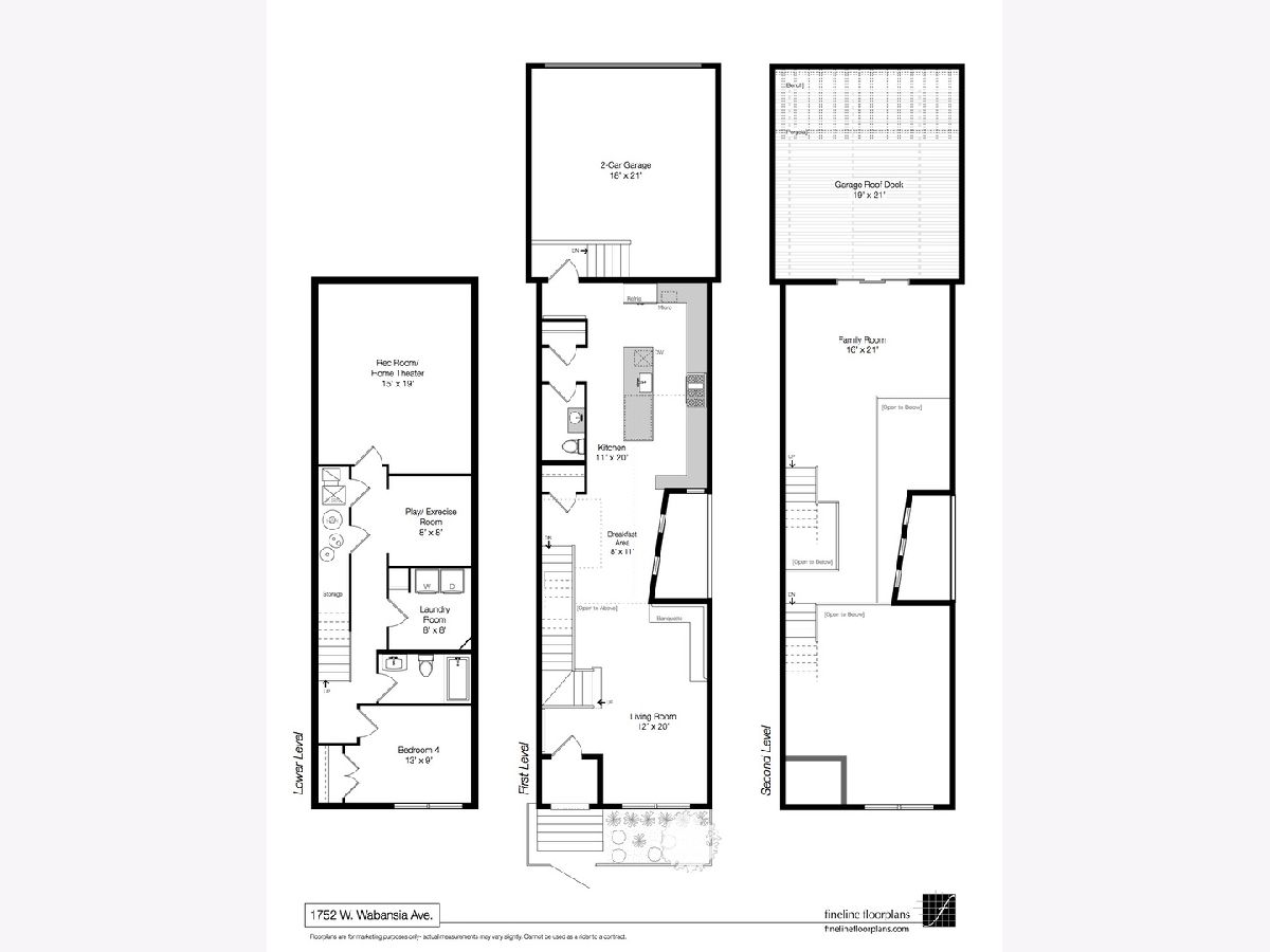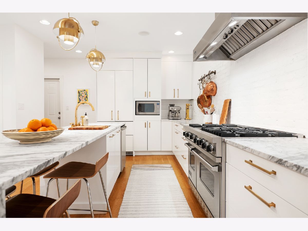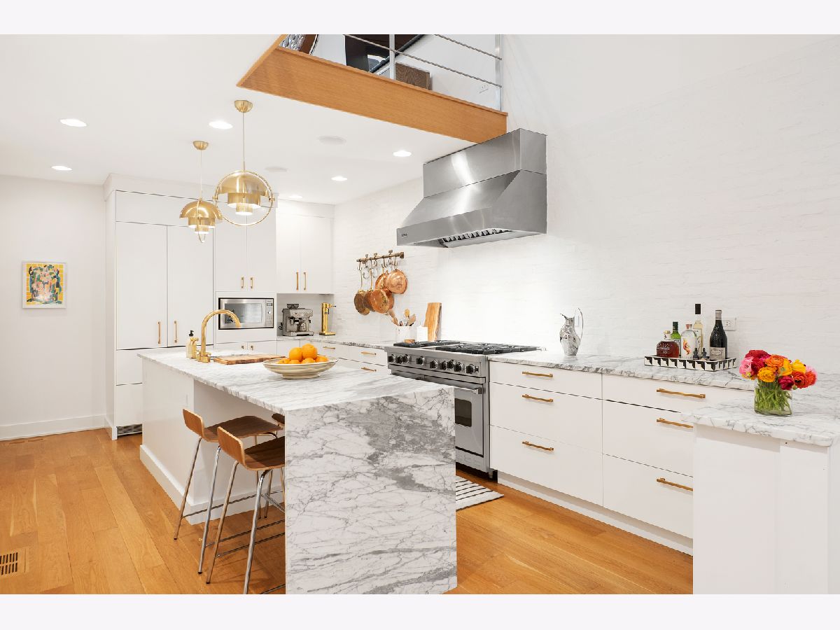 Professionally designed renovation of this stunning all-brick and limestone home in prime A+ Bucktown location. Impressive main level features dramatic 2-story living/dining room with 20' custom draperies, stylish built-in banquet, architecturally unique floating staircase and swoon-worthy kitchen which boasts gorgeous marble countertops and waterfall island, commercial grade appliances, designer brass fixtures and pantry closet. Modern, open-concept landings create a sense of connection from the main level to family room on 2nd level which opens directly onto fabulous outdoor space with pergola. Master suite features custom organized closets and luxurious master bath with Jacuzzi tub and separate shower with body sprays. Lower level features terrific ceiling heights, recreation/media room, exercise room currently used as playroom, laundry room, and guest bedroom/bathroom. Full skyline views from roofdeck and coveted attached 2 car garage complete this amazing home. Conveniently situated with easy access to 90/94, blue line, Metra, 606 Trail, parks and all of the best restaurants and boutiques in the heart of Bucktown.