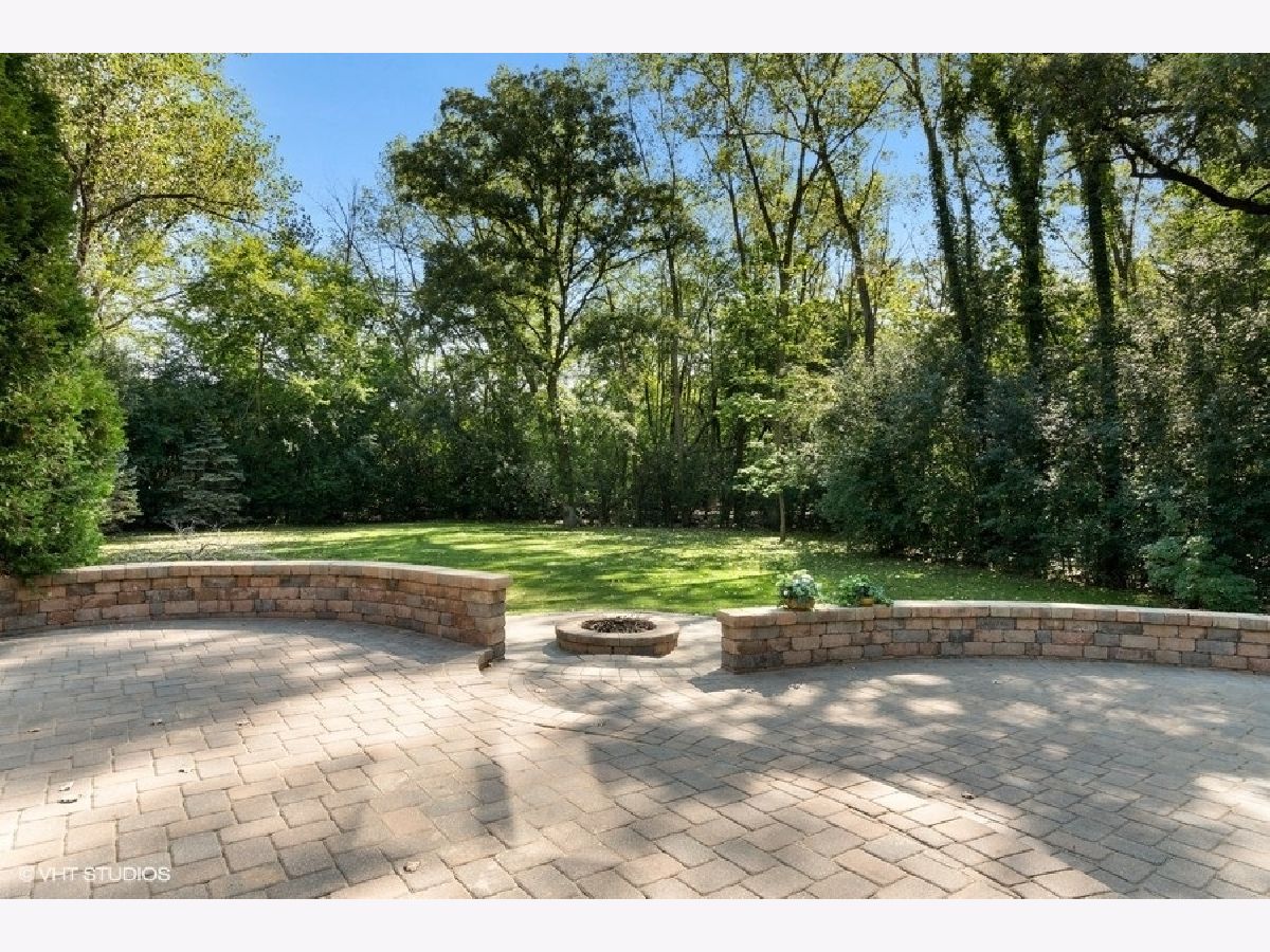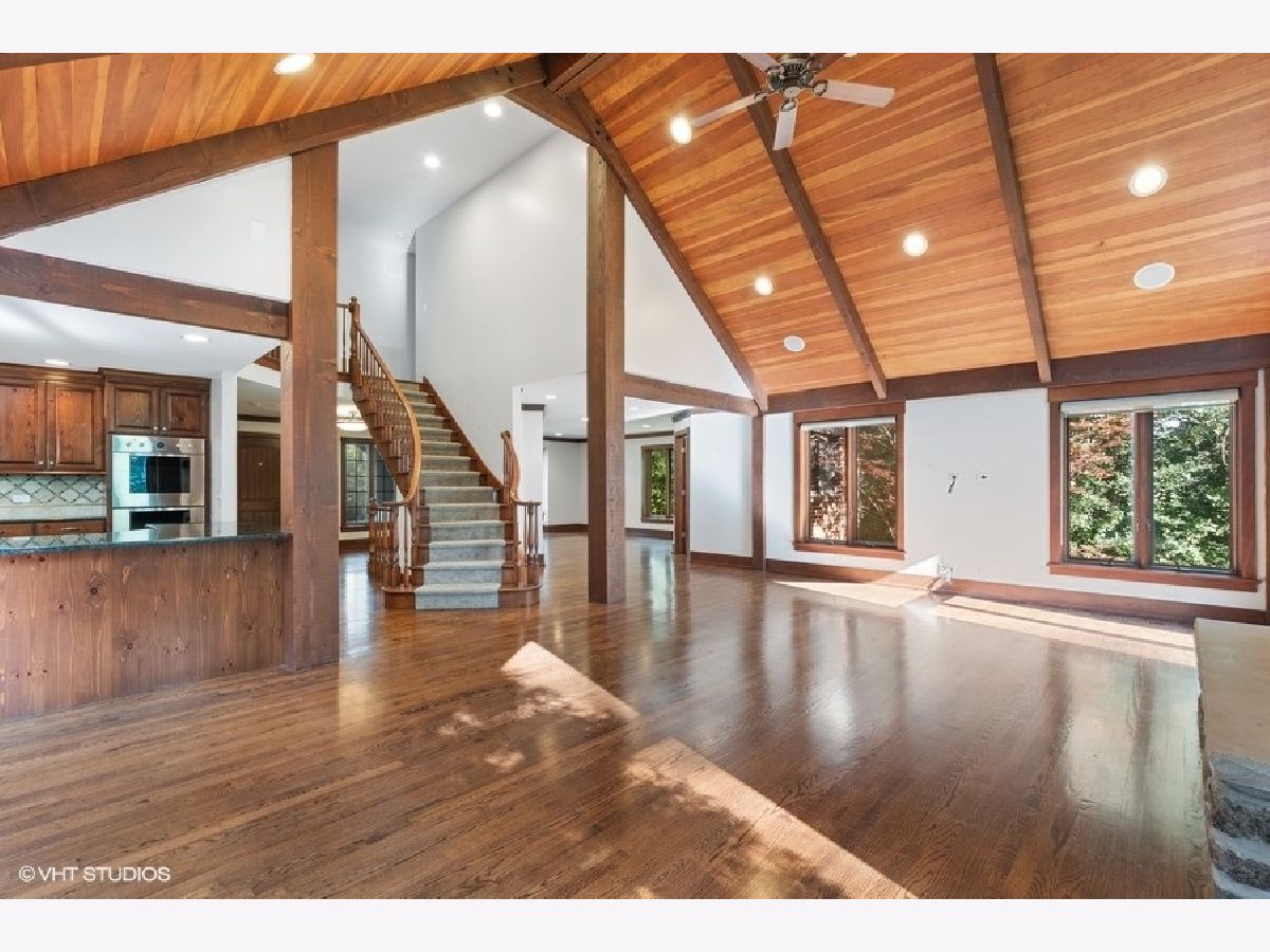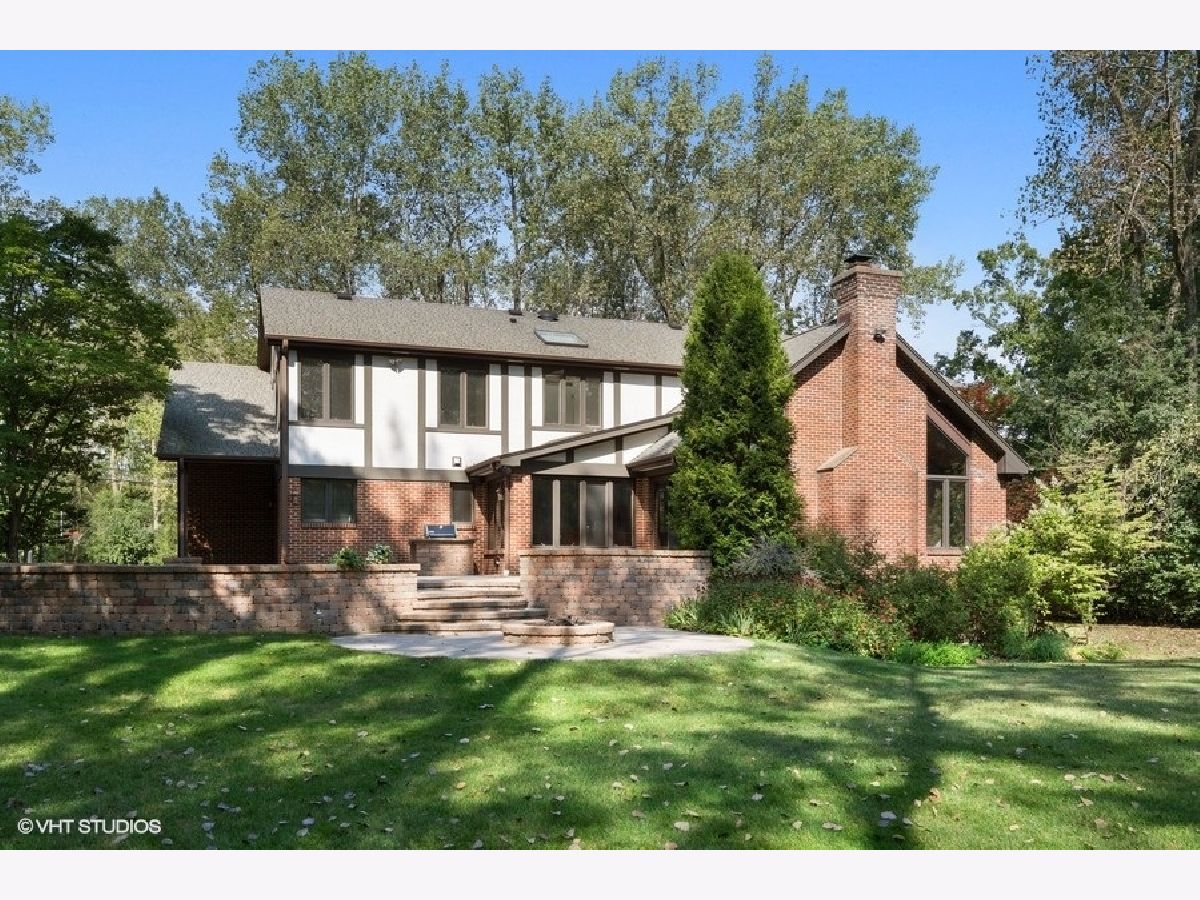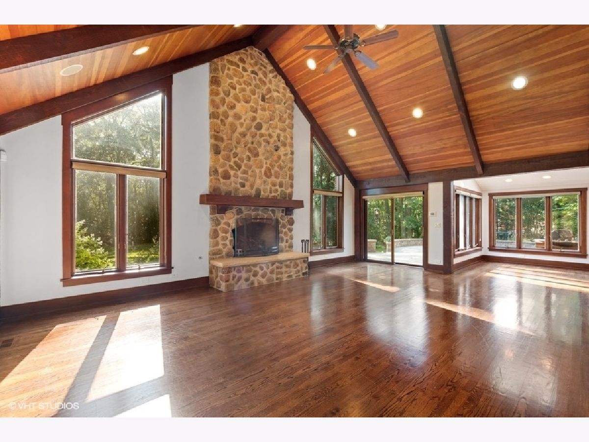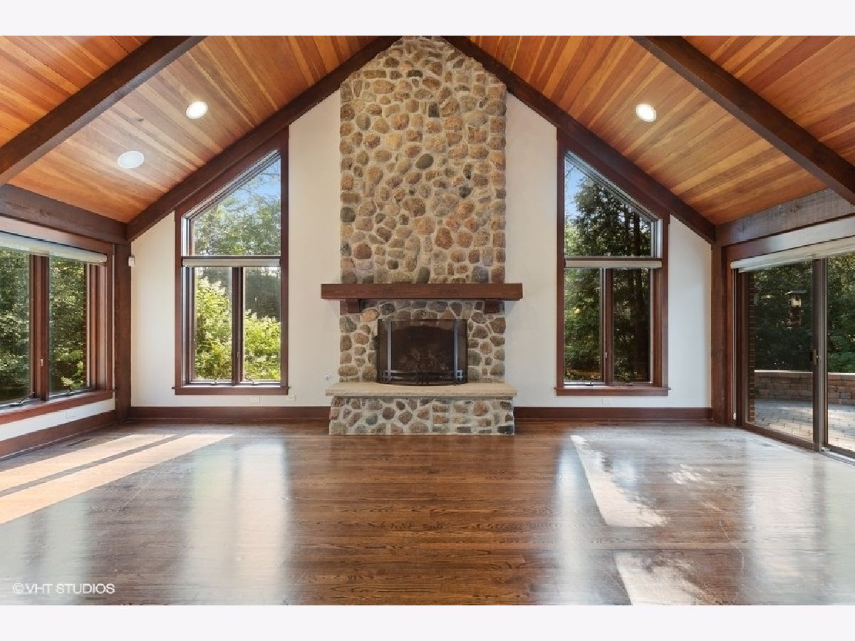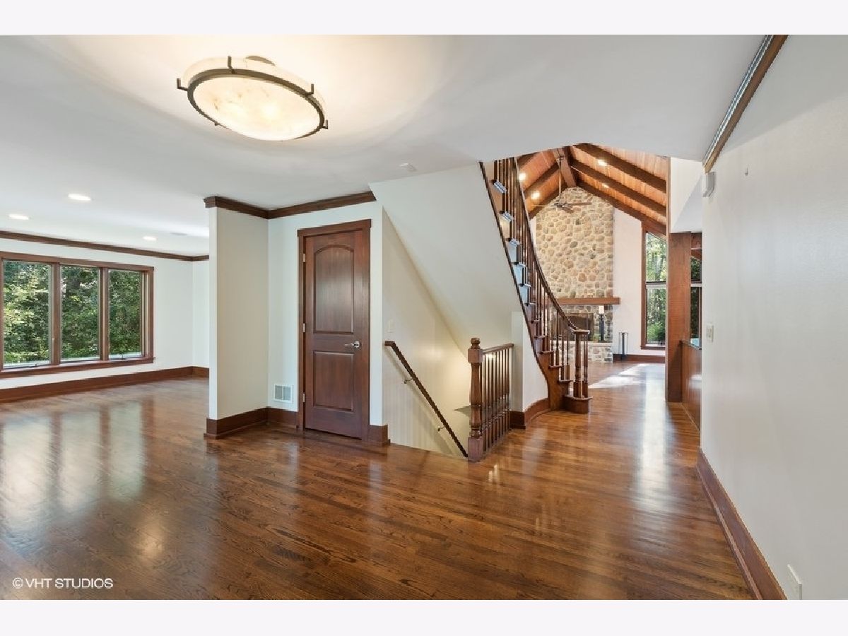 Enjoy the serenity of this custom-built home on over an acre of gorgeous wooded property. Soaring vaulted ceilings and rustic wood beams create the feel of an Aspen-like Chalet in the heart of Riverwoods. Fabulous open floor plan has flexible rooms that can be used differently depending on a buyers's needs. First floor private office with french doors. Gourmet kitchen with custom cabinets, top of the line stainless steel appliances, farmhouse sink, granite countertops and large eating area opens to the family room with floor to ceiling stone fireplace, amazing vaulted beamed ceiling and overlooks the magnificent yard. Hardwood floors throughout the first floor. 2 powder rooms on the first floor. Enter into the laundry/mud room from the 3 car garage. Primary bedroom suite with sitting area, huge walk in closet with custom built closet organizers, luxurious master bath has double vanities, radiant heated floor and generous sized shower with rain shower and bench seating. 3 additional bedrooms and 2 full bathrooms on the second floor. Full finished basement with media room, exercise room, wine cellar with temperature gauge, 2 additional bedrooms and a full bathroom. Move right in as this home was just freshly painted and has new carpeting throughout. This is an amazing value for space and land. Enjoy the peaceful setting and privacy during these days of quarantine. Wonderful pavers patio with built-in fire pit completes this special home!