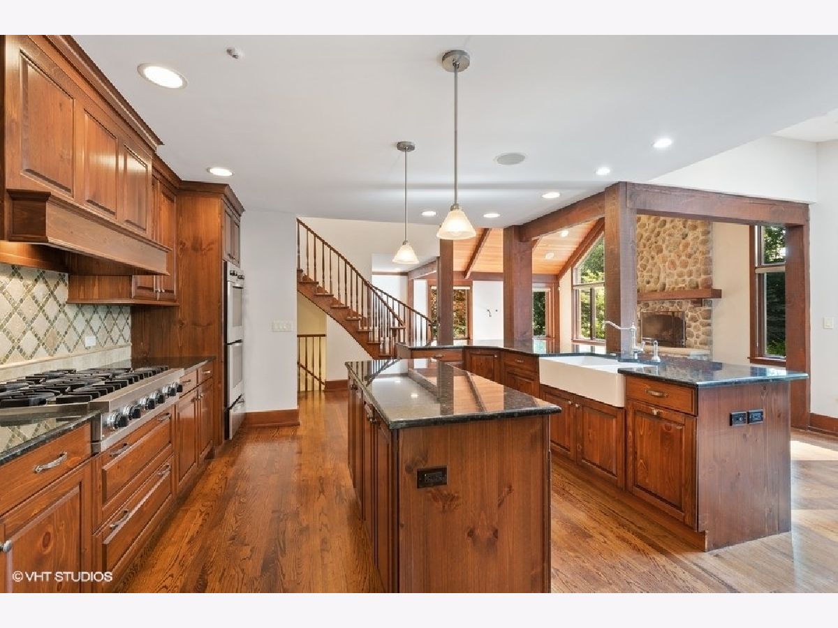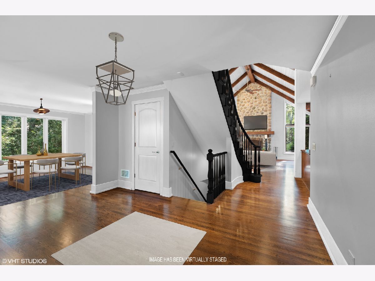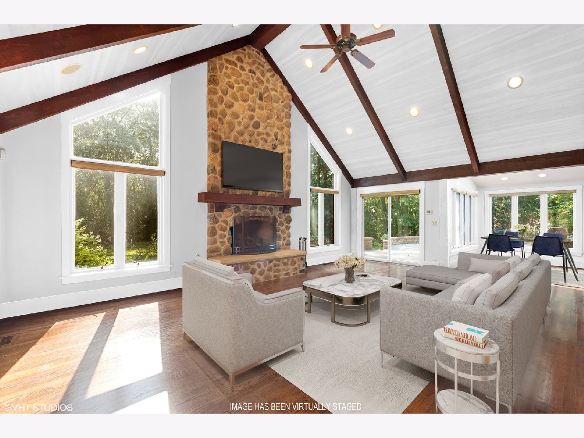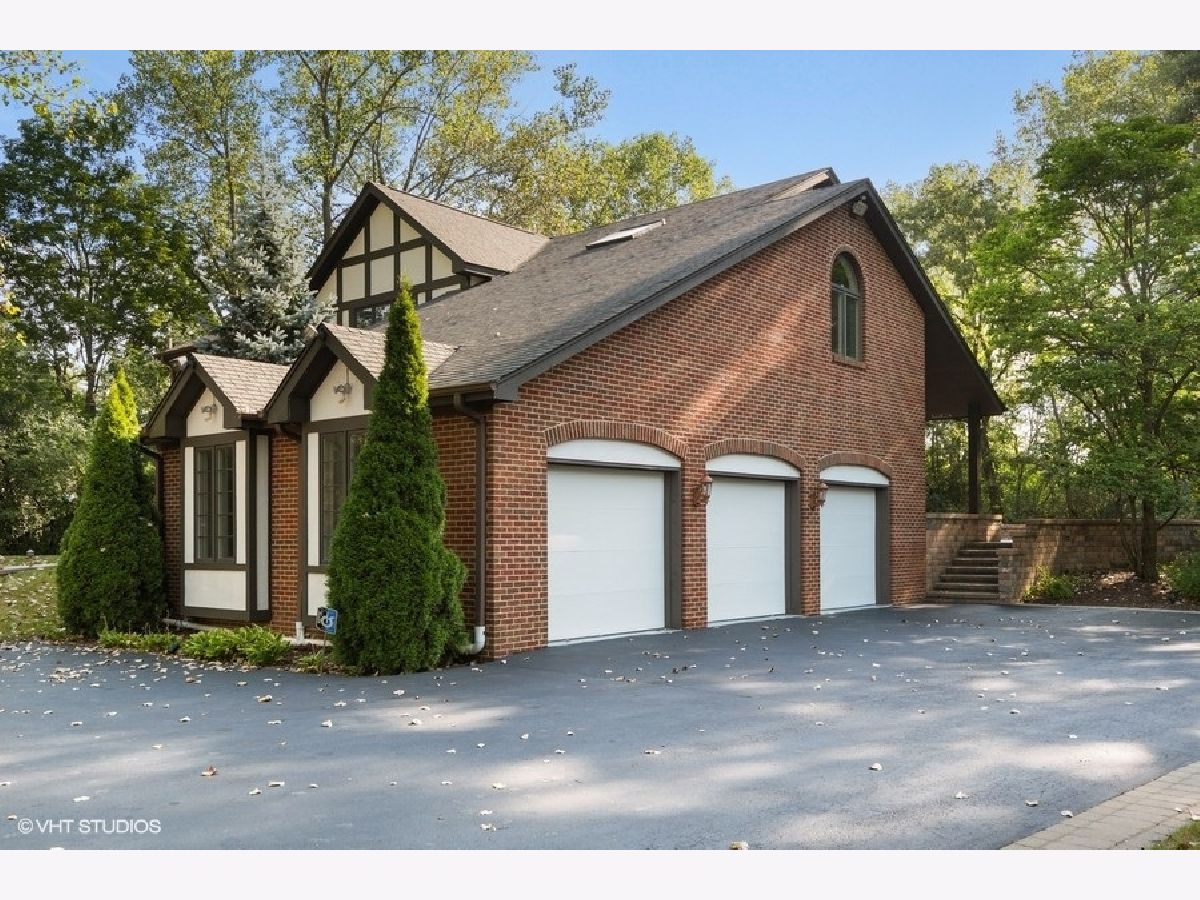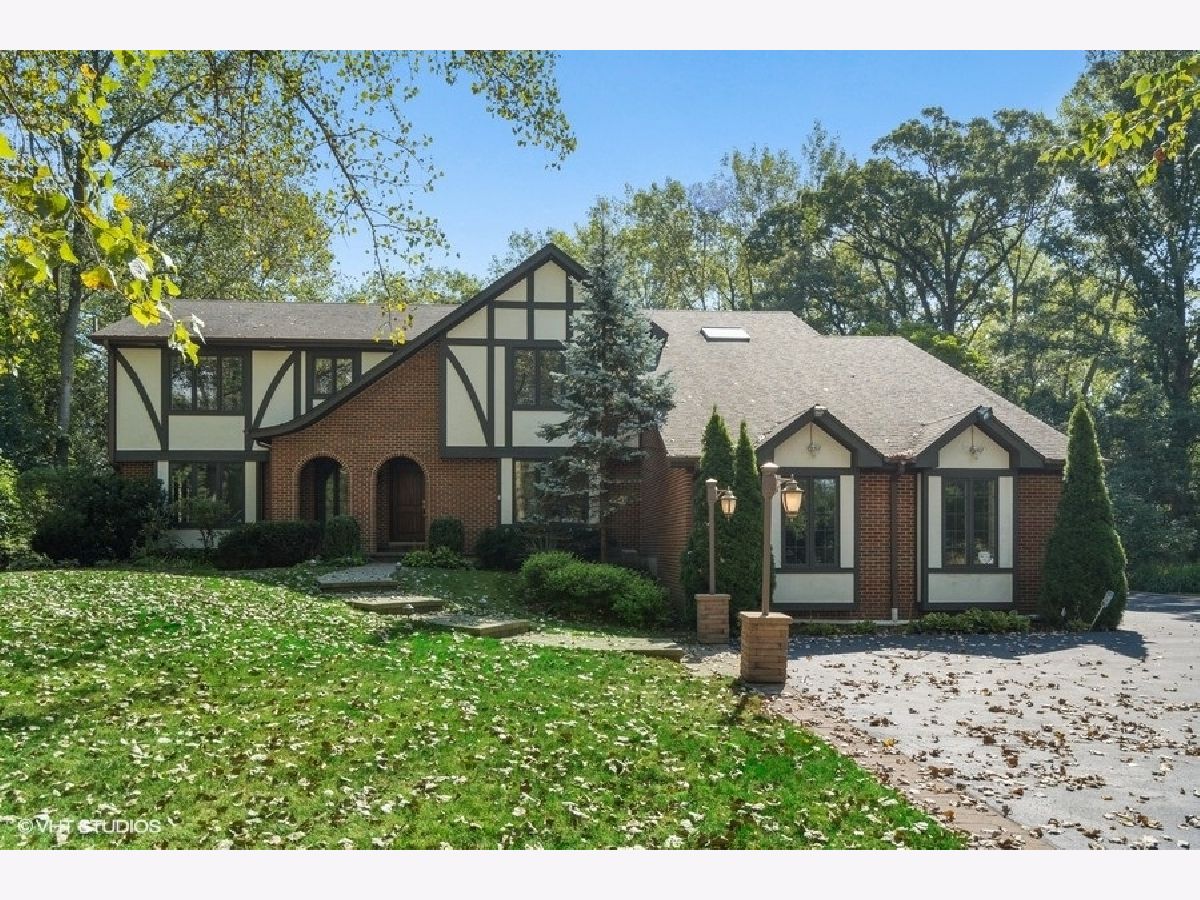 Enjoy the serenity of this custom-built home on over an acre of gorgeous wooded property. Soaring vaulted ceilings and rustic wood beams create the feel of an Aspen-like Chalet in the heart of Riverwoods. Fabulous open floor plan has flexible rooms that can be used differently depending on a buyers's needs. First floor private office with french doors. Gourmet kitchen with custom cabinets, top of the line stainless steel appliances, farmhouse sink, granite countertops and large eating area opens to the family room with floor to ceiling stone fireplace, amazing vaulted beamed ceiling and overlooks the magnificent yard. Hardwood floors throughout the first floor. 2 powder rooms on the first floor. Enter into the laundry/mud room from the 3 car garage. Primary bedroom suite with sitting area, huge walk in closet with custom built closet organizers, luxurious master bath has double vanities, radiant heated floor and generous sized shower with rain shower and bench seating. 3 additional bedrooms and 2 full bathrooms on the second floor. Full finished basement with media room, exercise room, wine cellar with temperature gauge, 2 additional bedrooms and a full bathroom. Move right in as this home was just freshly painted and has new carpeting throughout. This is an amazing value for space and land. Enjoy the peaceful setting and privacy during these days of quarantine. Wonderful pavers patio with built-in fire pit completes this special home!