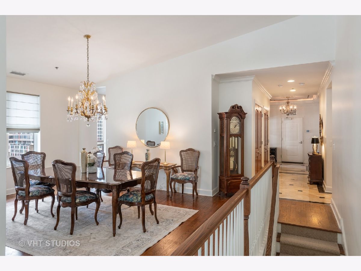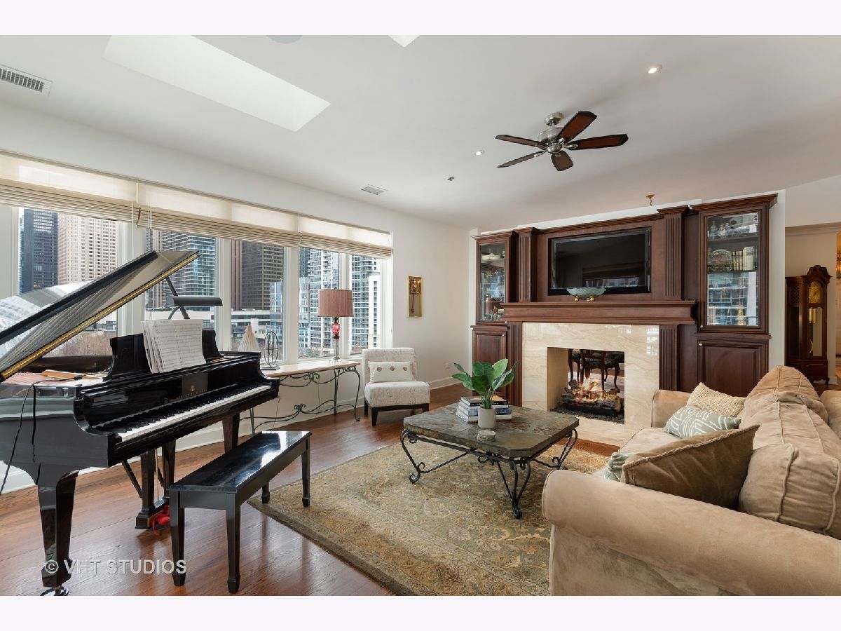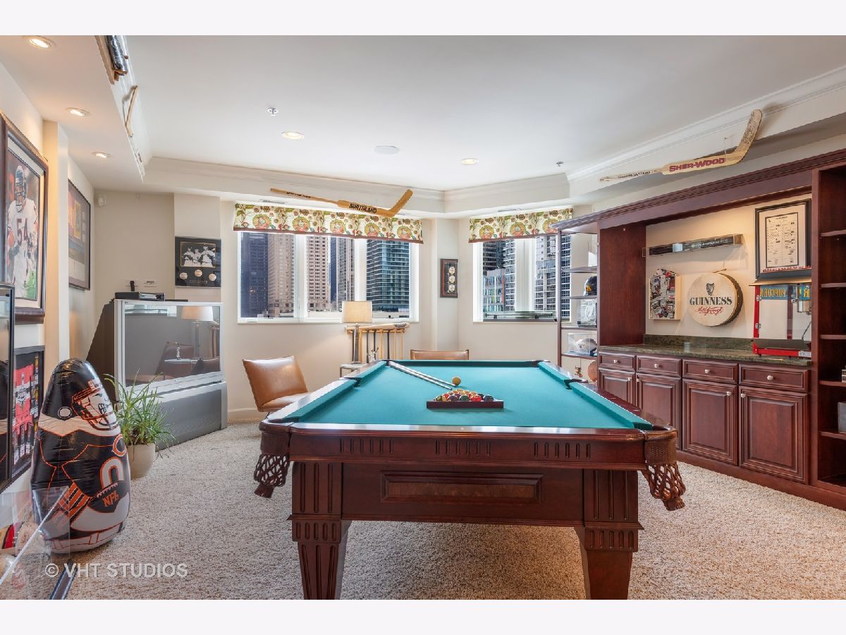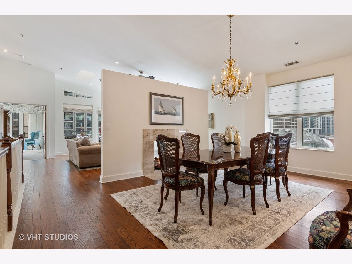 Beautiful two-story penthouse home in the New East Side. This spacious home with approximately 3,890 sqft features 4 bedrooms and 3 and a half bathrooms with views of the city and Lake Shore East Park. The large kitchen boasts high-end appliances of Sub-Zero, Wolf and Miele and an expansive eat-in island with a balcony that looks out west to the park. The main floor living area and formal dining area is separated by a wall with built-in cabinetry and a cozy dual-sided gas fireplace. With vaulted ceilings, the gorgeous master bedroom features a wall of windows, a south-facing balcony with lake views and a stunning custom walk-in closet. The master bathroom has dual custom vanities, a luxurious soaking tub and separate shower, and features marble throughout. Two additional bedrooms, bathroom and powder room are on the main level. The lower level features a rec room with a wet bar surrounded by custom cabinetry, an exercise room, a bedroom and a full bathroom. With this home, you will have access to Aqua's facilities including the gym, indoor and outside swimming pools and locker rooms. One car garage spot included. 2nd parking space not included and is available for rent at 165 N Field starting at $175/mo. Parking is also available for rent at 175 N Harbor Dr for $265/mo.