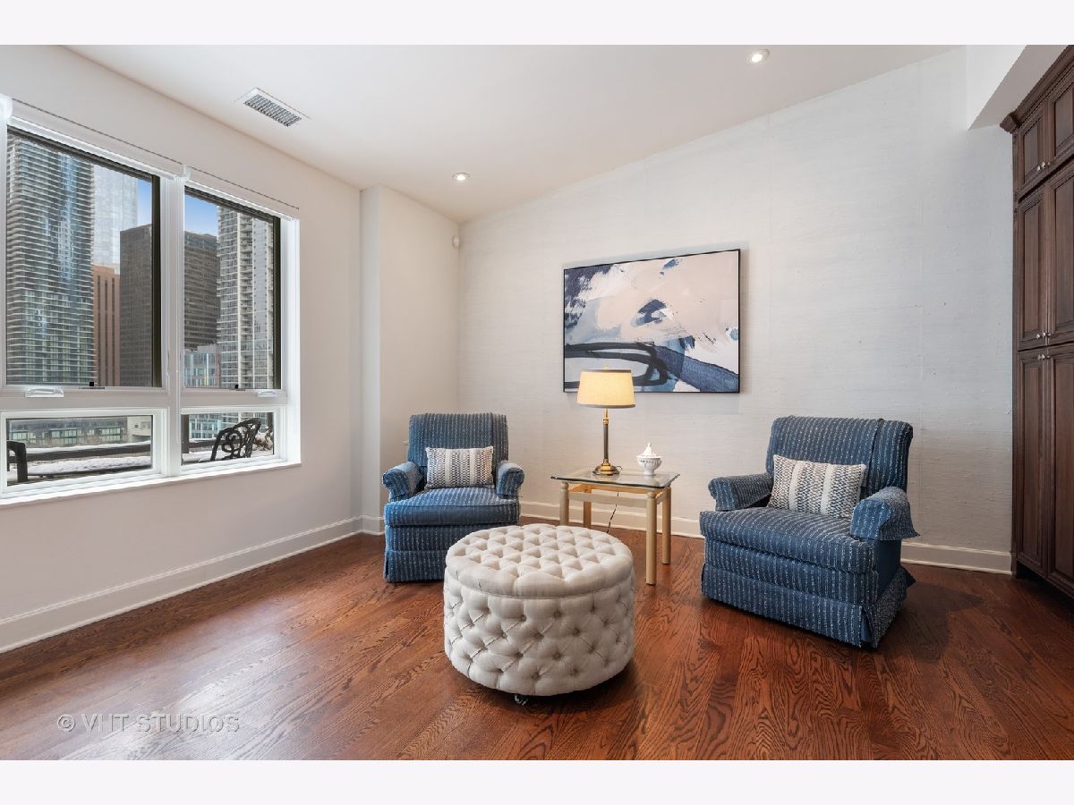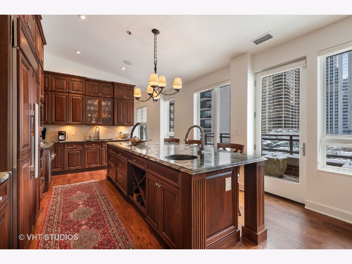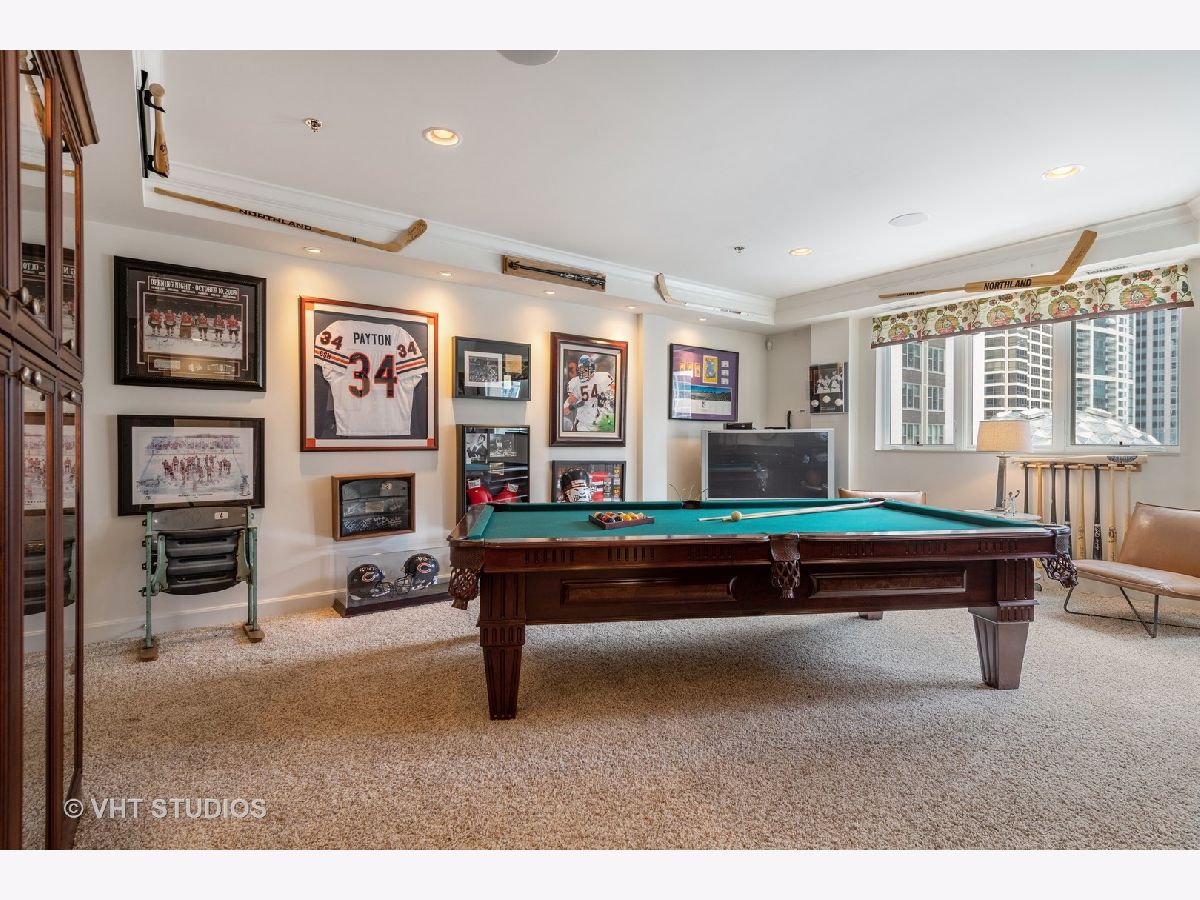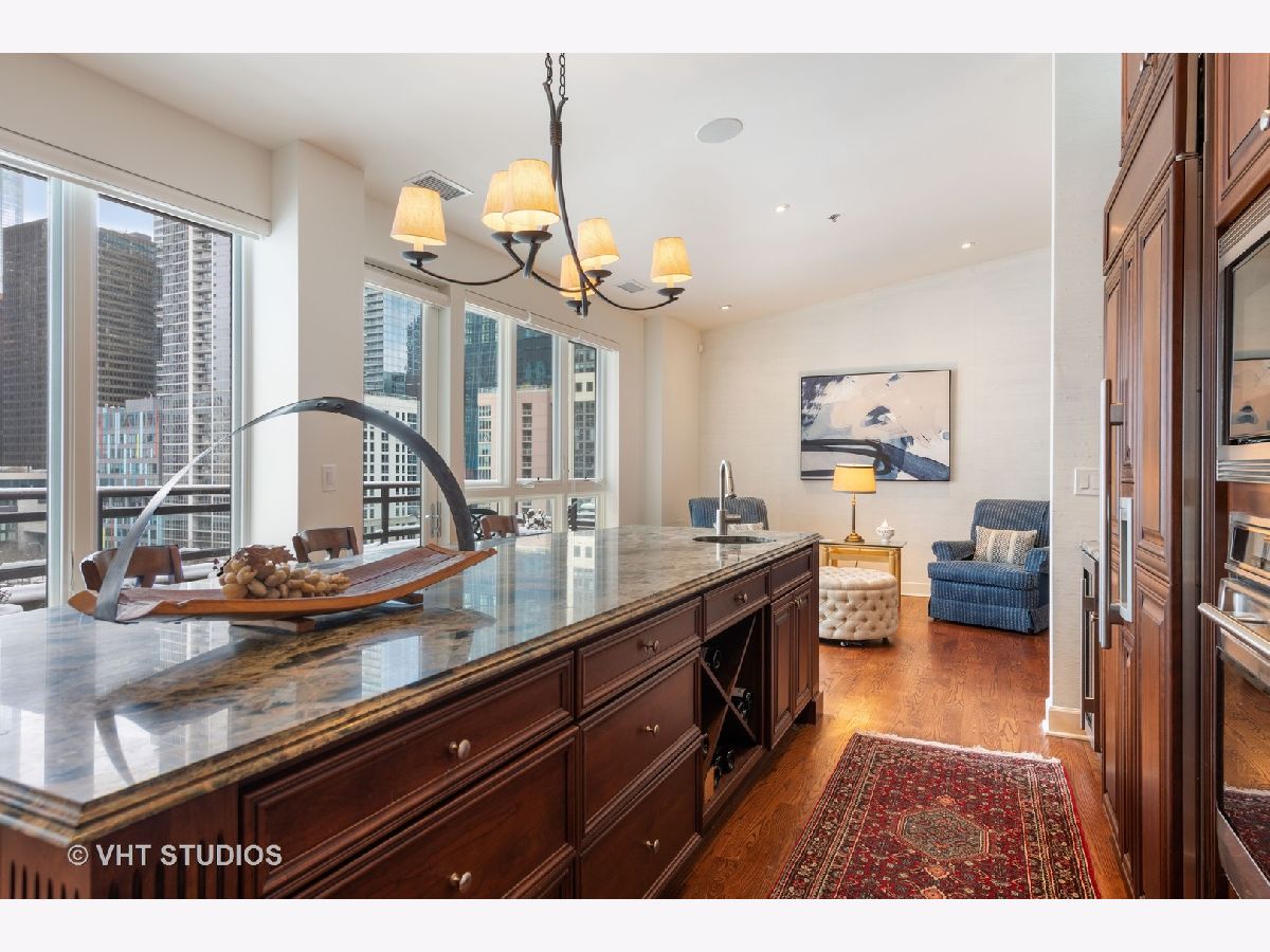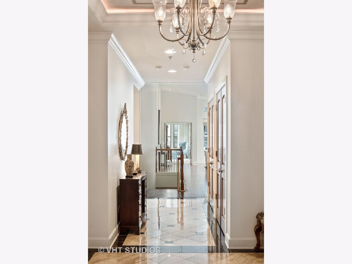Beautiful two-story penthouse home in the New East Side. This spacious home with approximately 3,890 sqft features 4 bedrooms and 3 and a half bathrooms with views of the city and Lake Shore East Park. The large kitchen boasts high-end appliances of Sub-Zero, Wolf and Miele and an expansive eat-in island with a balcony that looks out west to the park. The main floor living area and formal dining area is separated by a wall with built-in cabinetry and a cozy dual-sided gas fireplace. With vaulted ceilings, the gorgeous master bedroom features a wall of windows, a south-facing balcony with lake views and a stunning custom walk-in closet. The master bathroom has dual custom vanities, a luxurious soaking tub and separate shower, and features marble throughout. Two additional bedrooms, bathroom and powder room are on the main level. The lower level features a rec room with a wet bar surrounded by custom cabinetry, an exercise room, a bedroom and a full bathroom. With this home, you will have access to Aqua's facilities including the gym, indoor and outside swimming pools and locker rooms. One car garage spot included. 2nd parking space not included and is available for rent at 165 N Field starting at $175/mo. Parking is also available for rent at 175 N Harbor Dr for $265/mo.