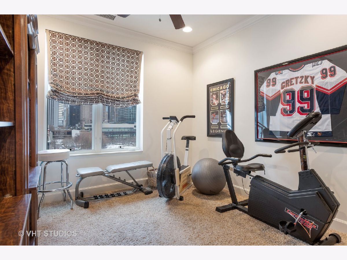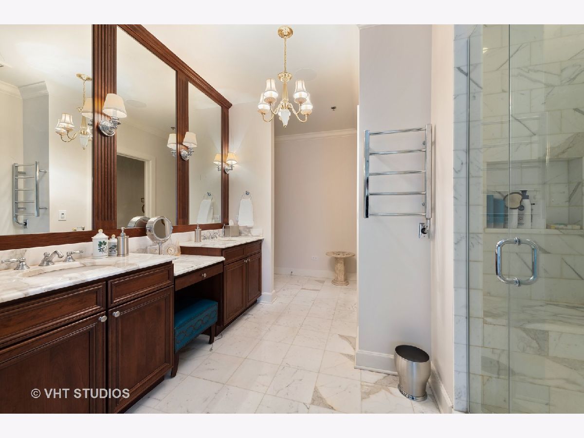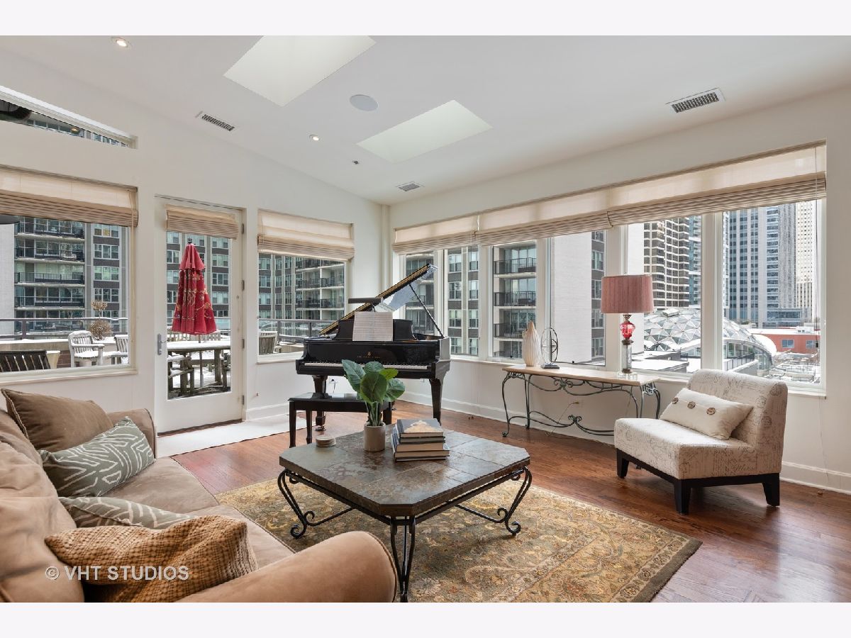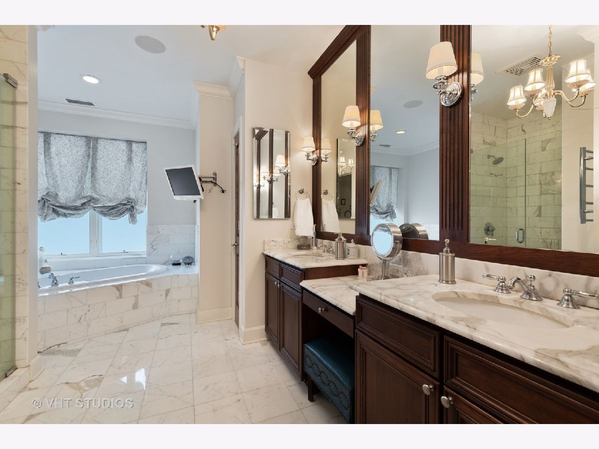 Beautiful two-story penthouse home in the New East Side. This spacious home with approximately 3,890 sqft features 4 bedrooms and 3 and a half bathrooms with views of the city and Lake Shore East Park. The large kitchen boasts high-end appliances of Sub-Zero, Wolf and Miele and an expansive eat-in island with a balcony that looks out west to the park. The main floor living area and formal dining area is separated by a wall with built-in cabinetry and a cozy dual-sided gas fireplace. With vaulted ceilings, the gorgeous master bedroom features a wall of windows, a south-facing balcony with lake views and a stunning custom walk-in closet. The master bathroom has dual custom vanities, a luxurious soaking tub and separate shower, and features marble throughout. Two additional bedrooms, bathroom and powder room are on the main level. The lower level features a rec room with a wet bar surrounded by custom cabinetry, an exercise room, a bedroom and a full bathroom. With this home, you will have access to Aqua's facilities including the gym, indoor and outside swimming pools and locker rooms. One car garage spot included. 2nd parking space not included and is available for rent at 165 N Field starting at $175/mo. Parking is also available for rent at 175 N Harbor Dr for $265/mo.