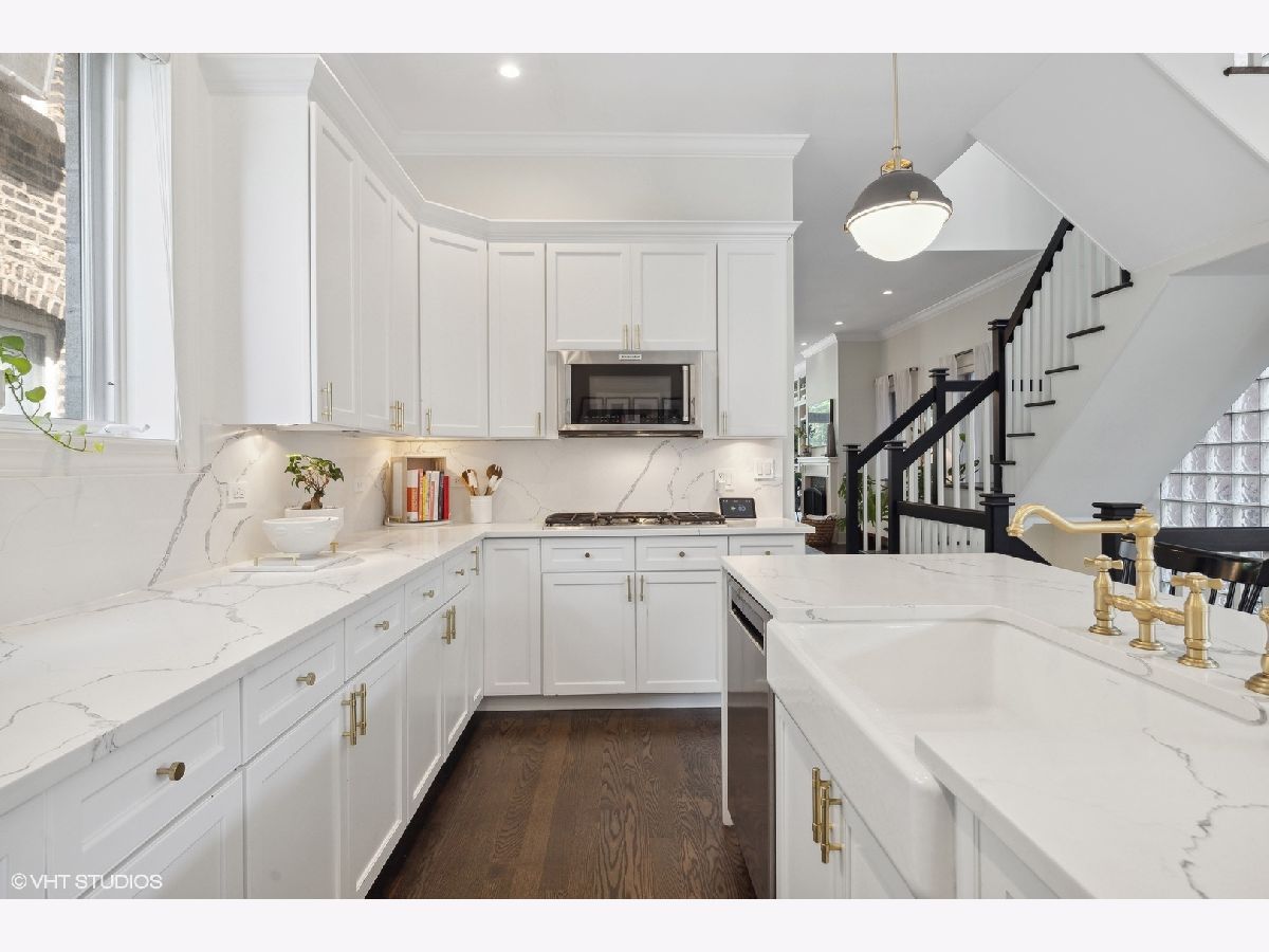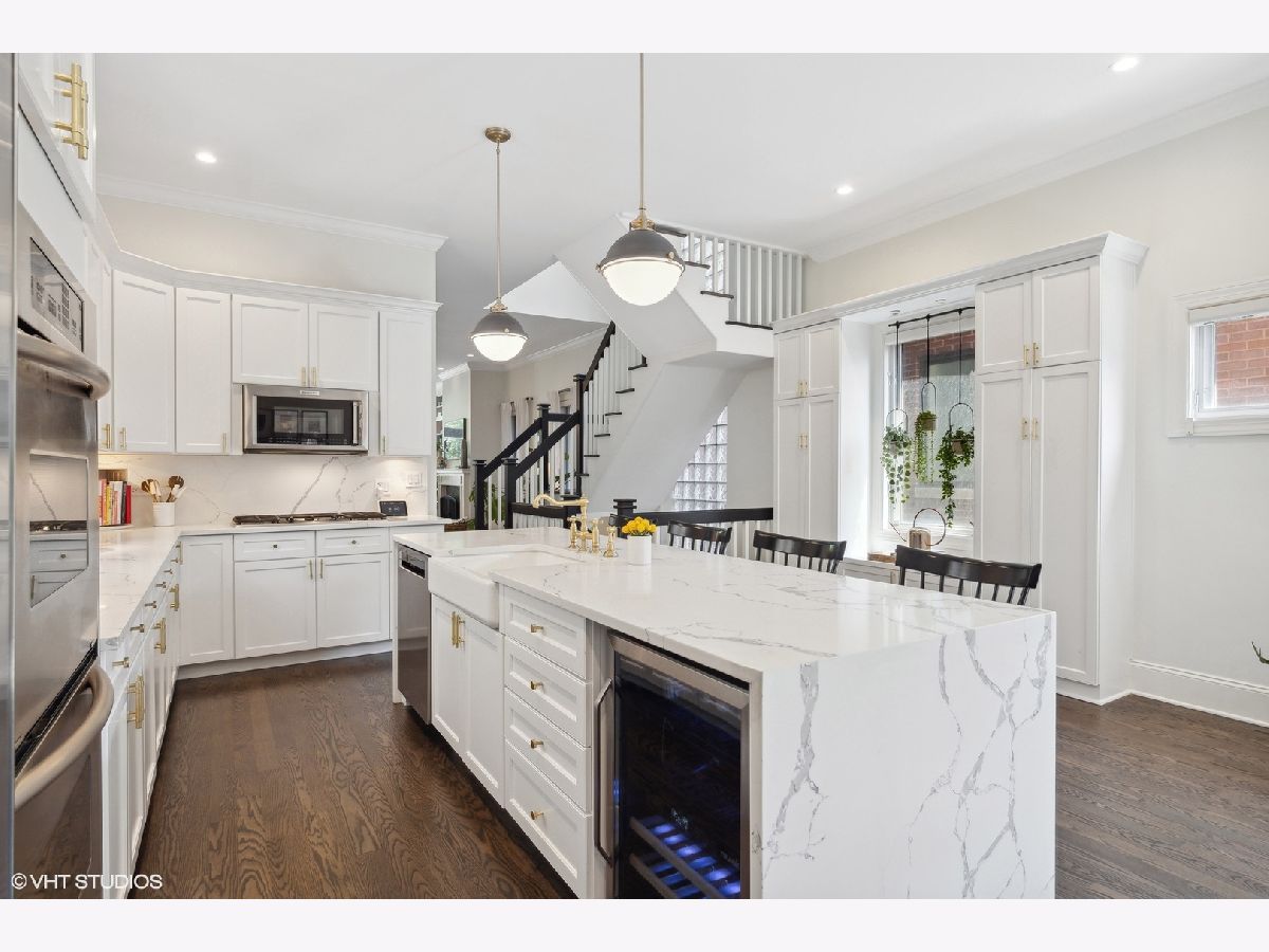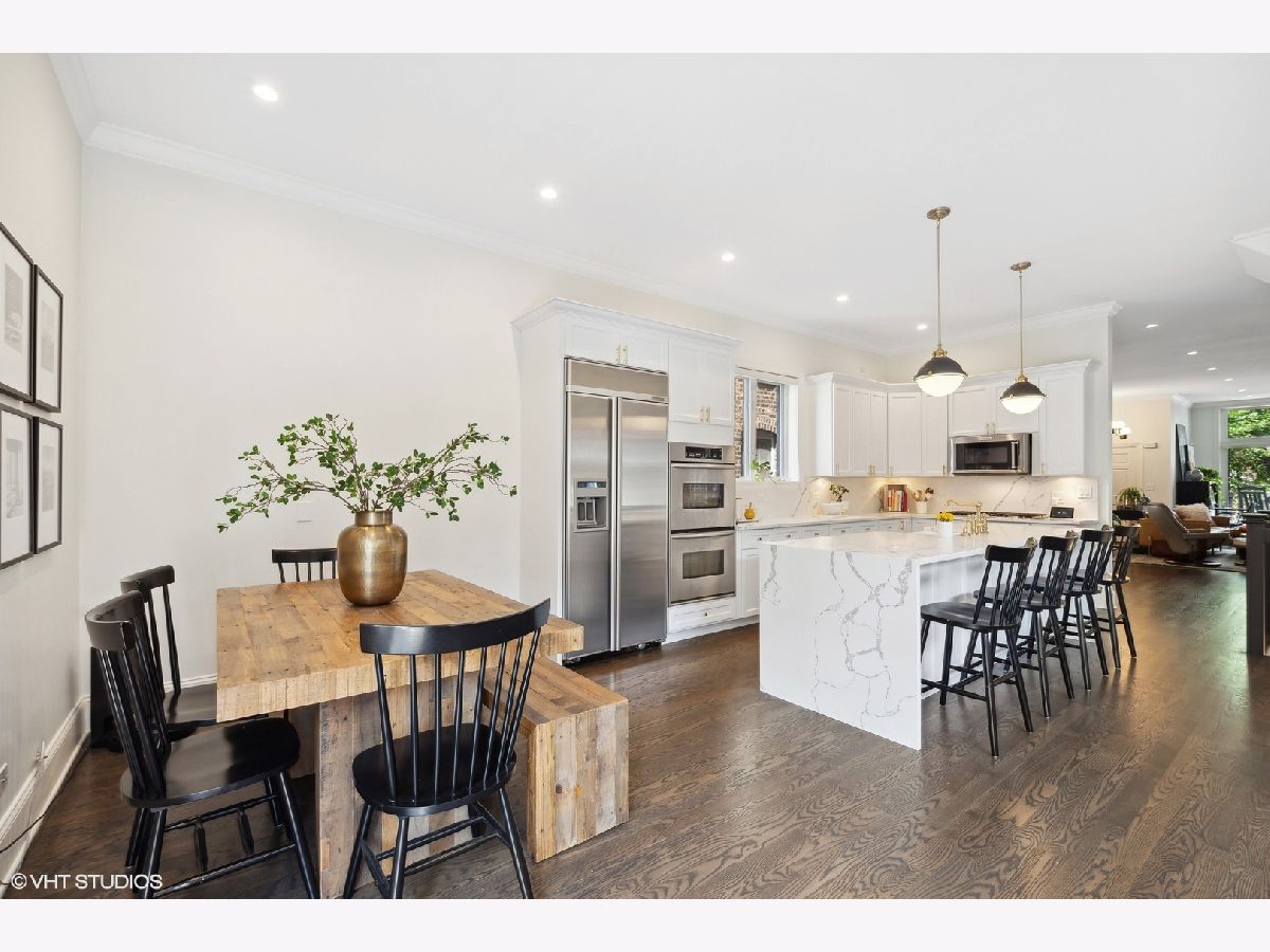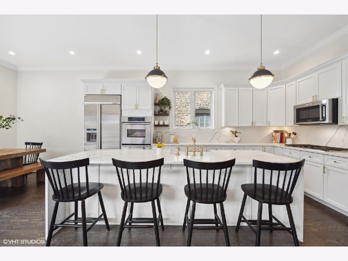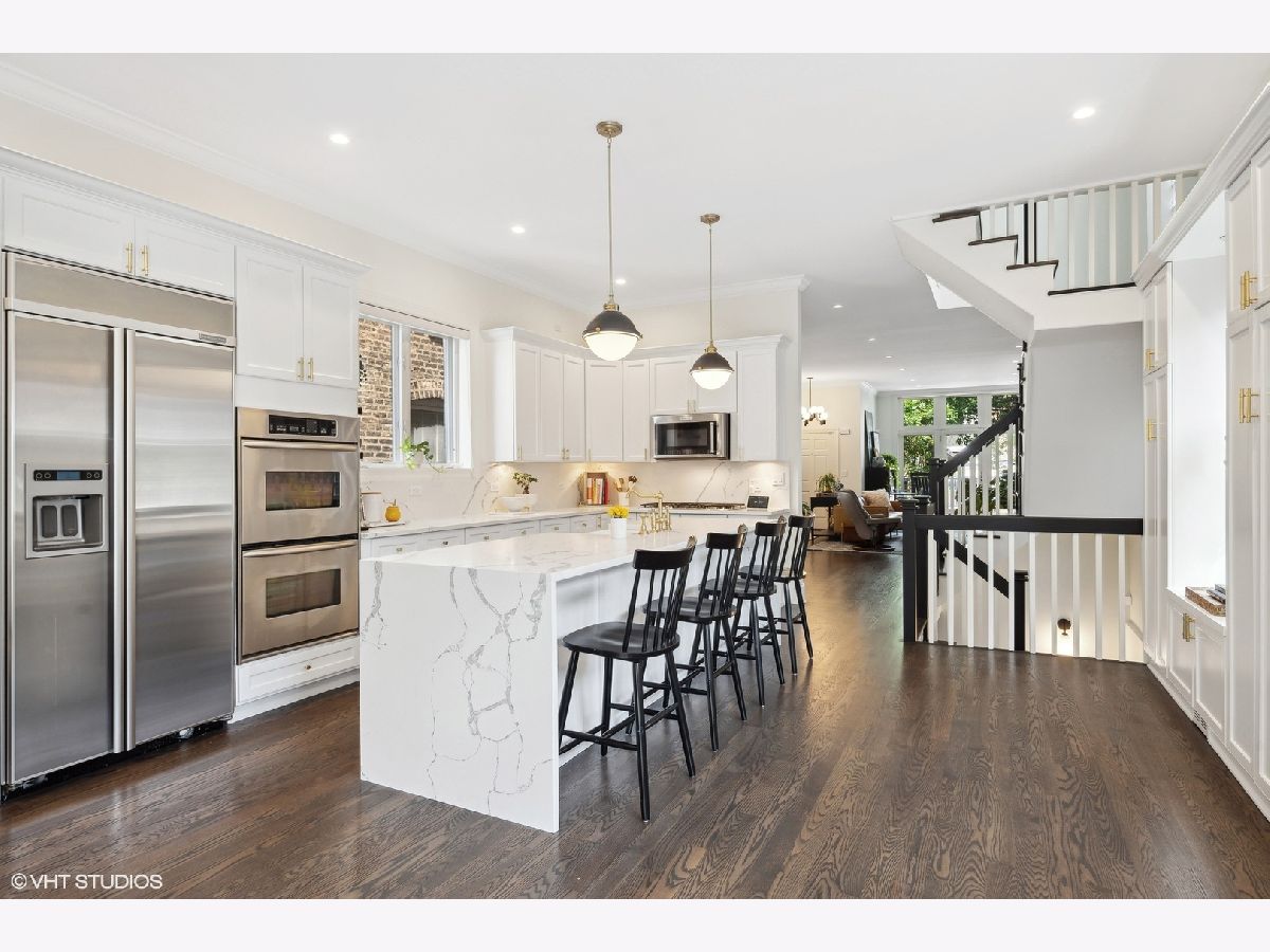 Discover this stunning single-family home situated on one of Bucktown's most desirable blocks, boasting an A+ location just a few steps away from the on-ramp to the renowned 606 trail. From the moment you enter, you'll be captivated by the warm and inviting ambiance, accentuated by soaring ceiling heights, exquisite millwork, an abundance of natural light, and numerous upscale enhancements. The main level presents a spacious living/dining room featuring a cozy gas fireplace, a convenient desk area adorned with built-in bookcases, and a front terrace. The updated powder room adds a touch of modernity, while the bright kitchen offers stainless steel appliances, natural stone countertops, and ample cabinetry. Adjacent to the kitchen, is set up as a dining space OR can be a family room. The French doors lead to a newly completed garage roof deck, complete with pergola - this space is perfect for relaxation and enjoyment. Retreat to the expansive primary suite, boasting a private terrace, a wood burning fireplace, a custom organized walk-in closet, and a professionally designed luxurious bathroom. Indulge in the high-end fixtures, heated marble floors, double vanity with quartz countertops, a frameless sliding shower door. Additionally, the upper level accommodates two more generously sized bedrooms and a second full bath. The bright lower level presents a spacious family room adorned with a wood burning fireplace and French doors that lead to a sophisticated office. There's also a large fourth bedroom, a natural stone bathroom, and a full-size laundry room for added convenience. Meticulously maintained and refreshed throughout. Enjoy ample storage space, zoned HVAC, and a extra wide garage. With a prime walk-to-everything location, you'll have quick access to the 606 trail, Churchill and Walsh Park, the blue line, Metra, and Bucktown's finest boutiques and restaurants. Indulge in the epitome of luxurious living in this exceptional property that offers both elegance and convenience in one of Chicago's most sought-after neighborhoods.