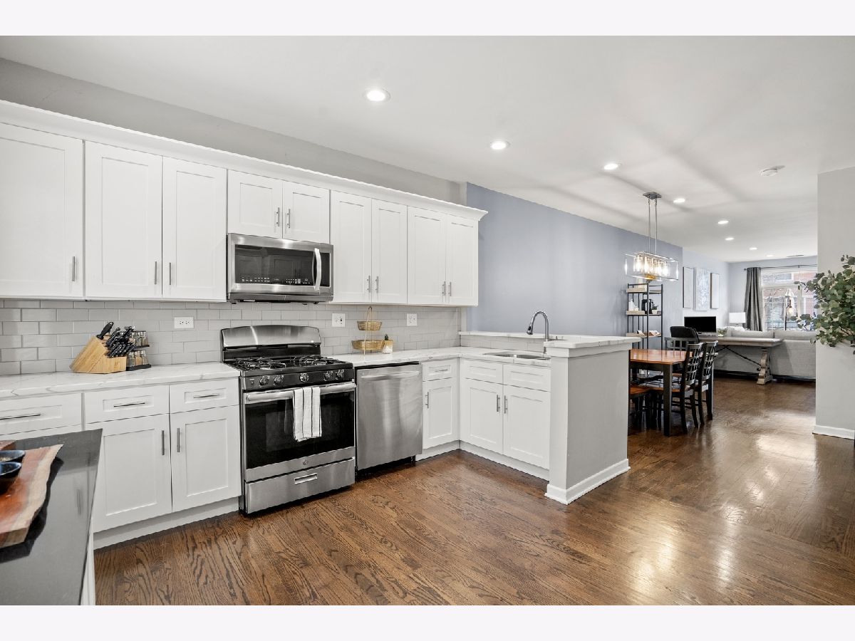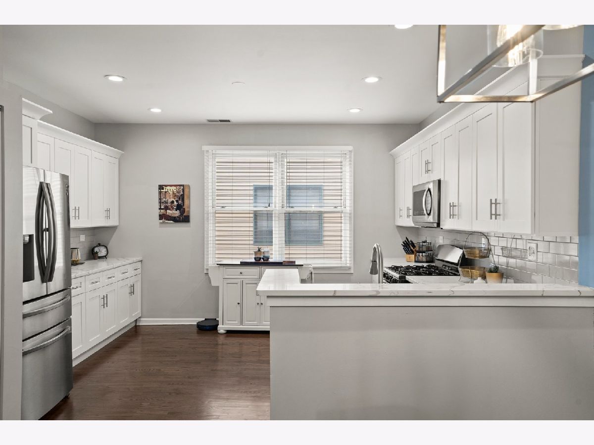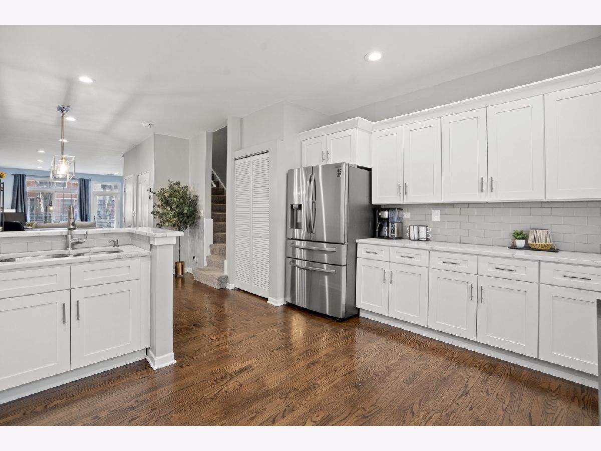 Stunning & completely updated 3Bed/2Bath townhome in the beautiful gated courtyard of Dearborn Village! This sophisticated townhome features hardwood floors, white kitchen cabinetry w/ matching quartz countertops, a beautiful subway tile backsplash & stainless steel appliances. Full-size washer & dryer on the mail level, matching white quartz vanities with new hardware, gas fireplace in the living room, new chandelier in the dining room, and fresh paint round out this perfectly appointed property. Front balcony off of the living room and a large rooftop deck with city and skyline views are perfect for relaxing and entertaining! Attached garage parking and an exterior parking spot are both included in price. Located in quiet, lovely gated courtyard community just steps from Mariano's, Lakefront trails and Lake Michigan, CTA & Metra, and all of the great local coffee shops and restaurants the South Loop has to offer!