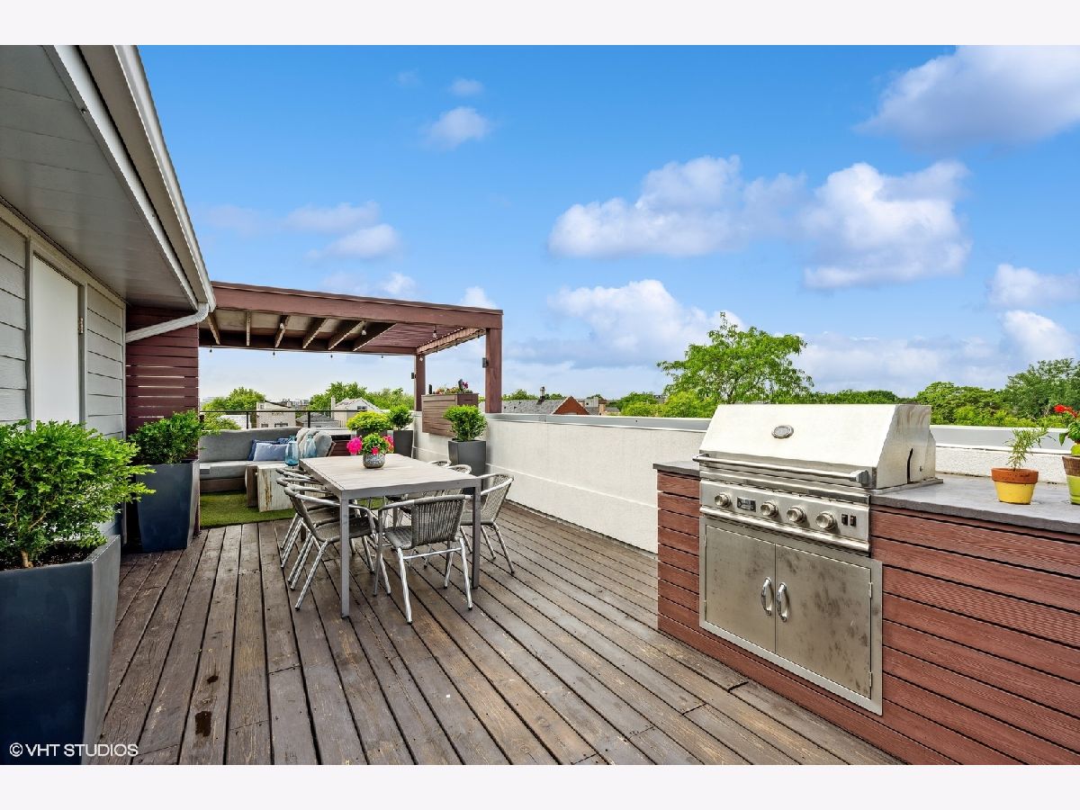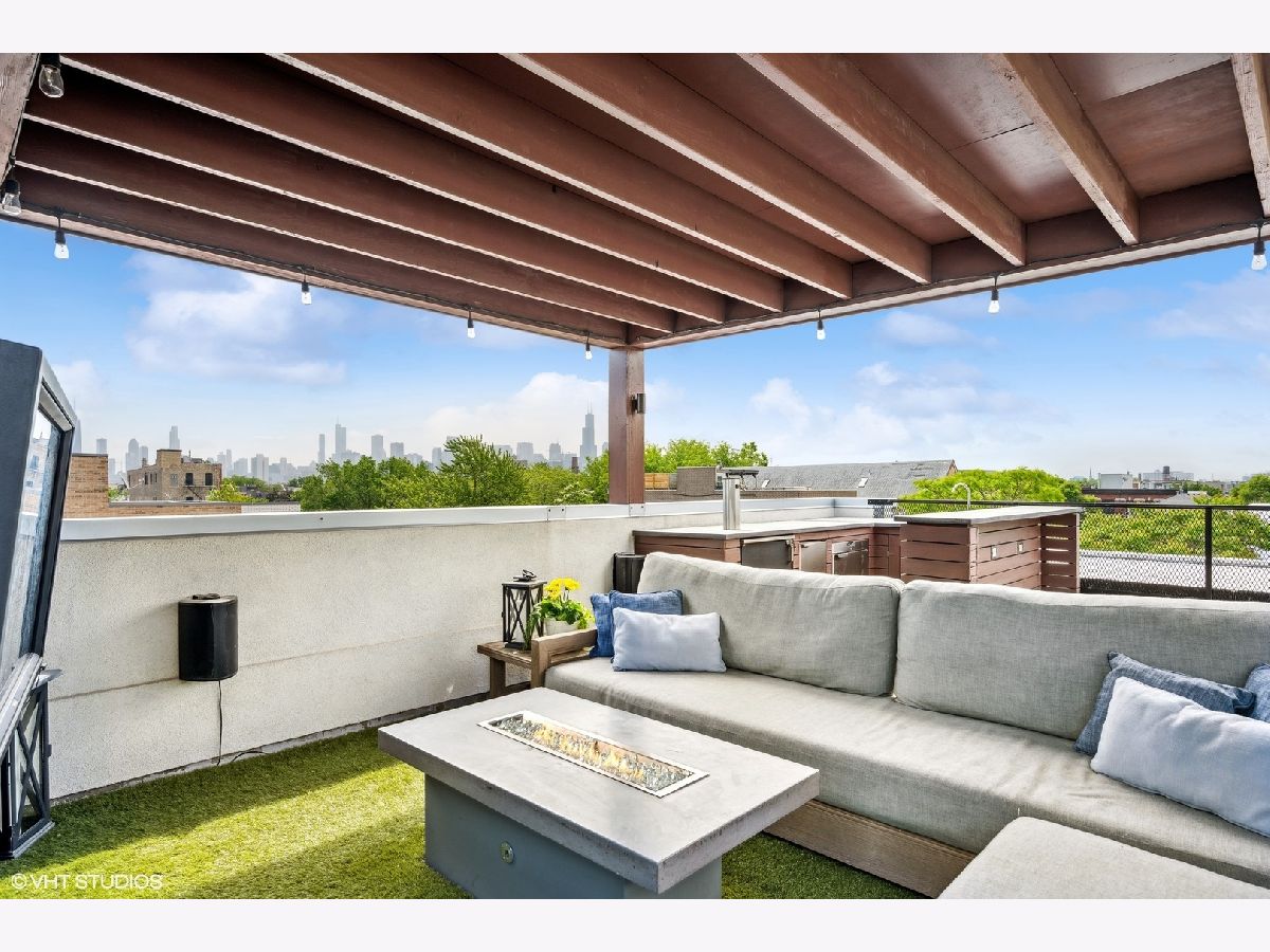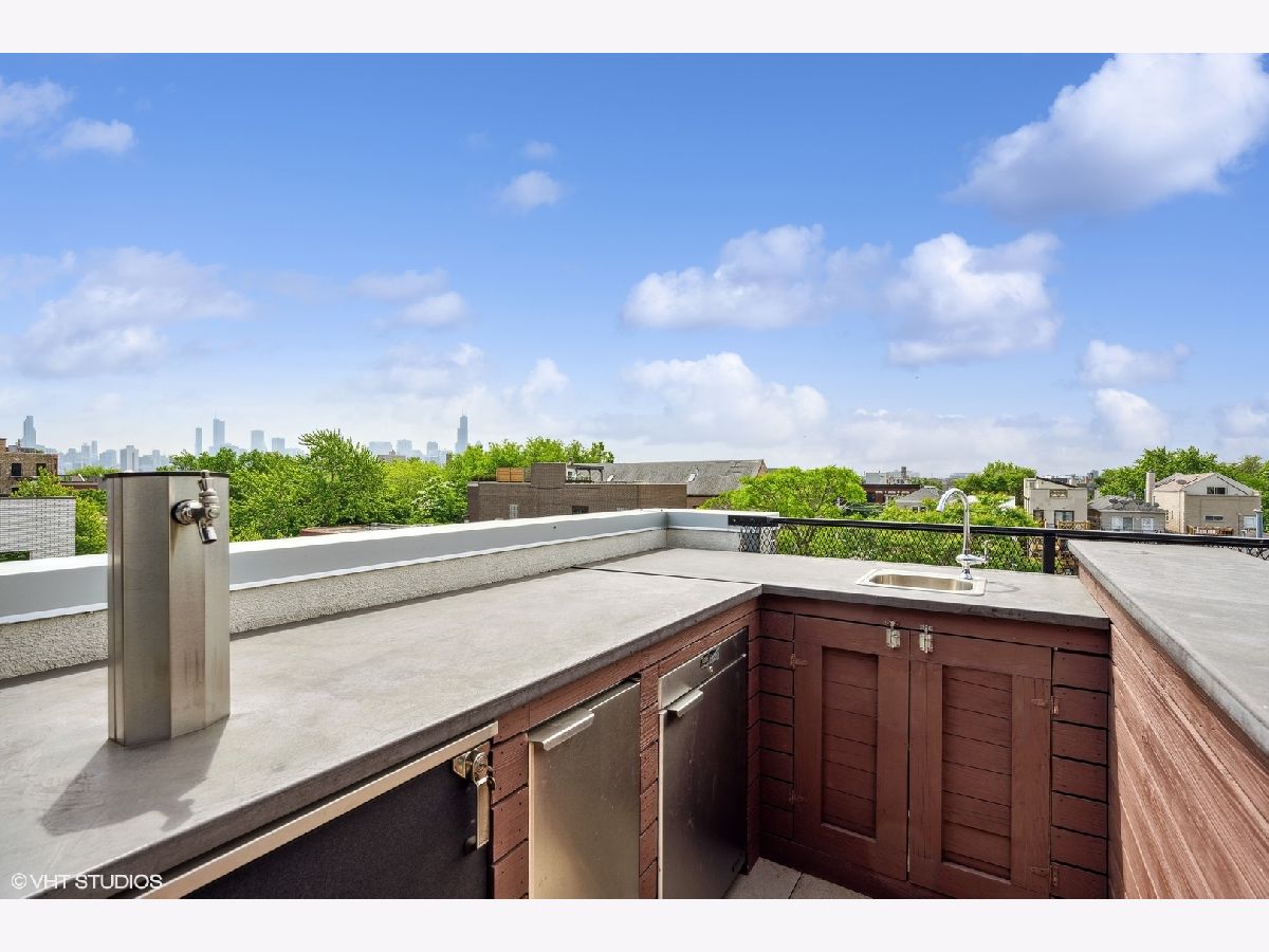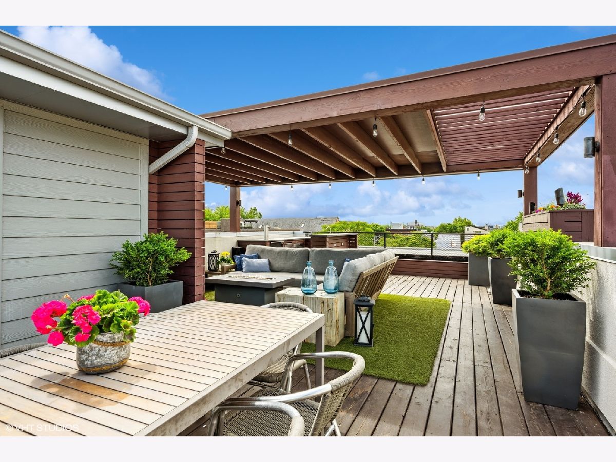 Welcome to Wicker Park's finest PENTHOUSE retreat in a meticulously-maintained modern two-unit building! This duplex-up is fresh on the market with countless high-end upgrades since it was last available. Best of both worlds - on a peaceful, tree-lined street yet only a block from Division & all the amazing action of this vibrant neighborhood! With all three bedrooms on the same level and 2.5 bath, there are professionally designed elements at every turn. It's a highly coveted reverse build - with the top floor featuring a completely open-concept kitchen, living and dining with ultimate SOUTH FACING light in the areas you spend most of your time! Super smart designed and absolutely turn-key starting with hardwood floors running the course of the property paralleled by sprawling 10 foot ceilings. The living room is anchored by massive floor-to-ceiling windows with beautiful mature trees and a Chicago skyline view as your daily backdrop. This room is equipped with in-ceiling speakers, custom curtains, automated shades and a special textured Phillips Jeffries covered TV wall. The kitchen is classy yet cool with an 8 foot waterfall quartz island as the focal! The back counter is dark and leathered providing an appealing contrast while surrounding a big SS sink and new black matte faucet. Plenty of storage in your WHITE cabinets, all SS appliances including vented hood, plus a distinctive stone backsplash that runs the full-height of the wall on both sides. Dining area that can accommodate any-sized table and completes the entertainer's vision. Perfectly positioned powder room on this main level across from the kitchen. Three bedrooms on the lower level of the home for convenience. The owner's suite easily houses your KING bed plus plenty of other furniture. More oversized windows with automated shades, in-ceiling speakers and views of luscious trees. The attached en-suite bath has dual vanities, lots of storage, large steam shower w/ rain shower and handheld plus stone-clad soaking tub for ultimate relaxation. Laundry on the bedroom level with brand new machines! Striking designer lighting fixtures in every room. Control 4 system with auto locks and lighting, including sensors in the bathrooms. Brand new furnace! BEST FOR LAST: travel to your PRIVATE ROOF DECK through interior access to spend three seasons on top of the world! This functional space has been professionally built out and features custom pergola, Cedar Slate screening, built in wall speakers, TV, built in high-end grill, lighting, built in bar, fire pit, top-of-the-line fridge, ice maker, kegerator, sink and more! The views will make you fall in love with the city all over again! The expansive skyline shines bright and is even better in person. Large enough to entertain your crew but wildly cozy to work-from-home solo or enjoy your favorite beverage. Building has been cared for with plenty of exterior maintenance in the front and back recently done, including fence painting, fully sealed, window washing, freshly painted stairs and newly stained decks. Garage parking included with storage shelves that will stay! Low assessments make this a no brainer. Investor and pet friendly! One block from the BEST restaurants, shopping, culture, coffee shops, pubs, bakeries, Target, sushi, parks, transit and more!