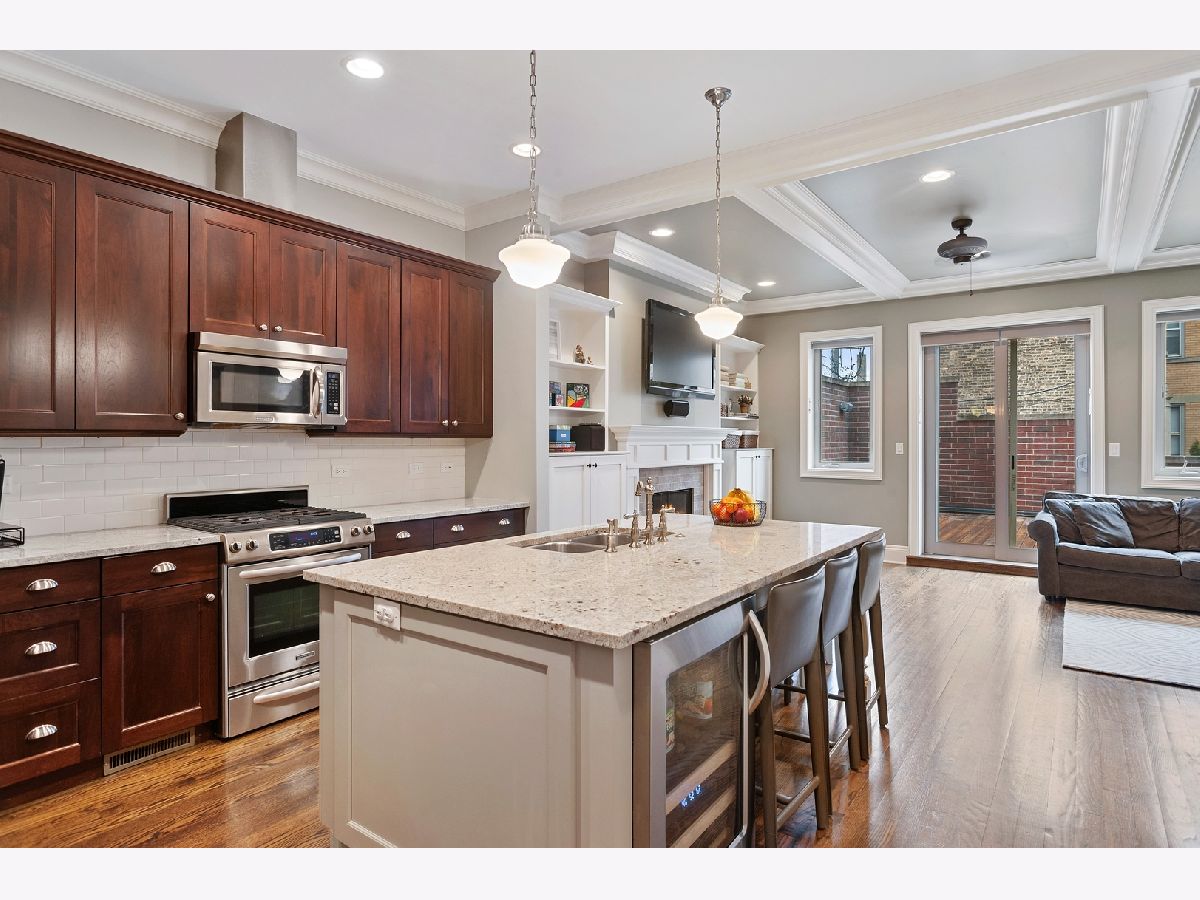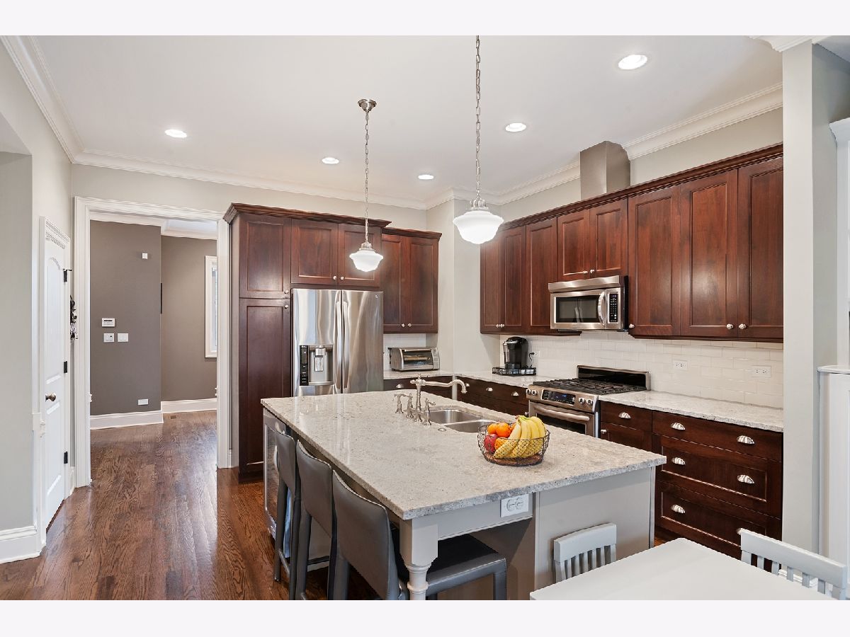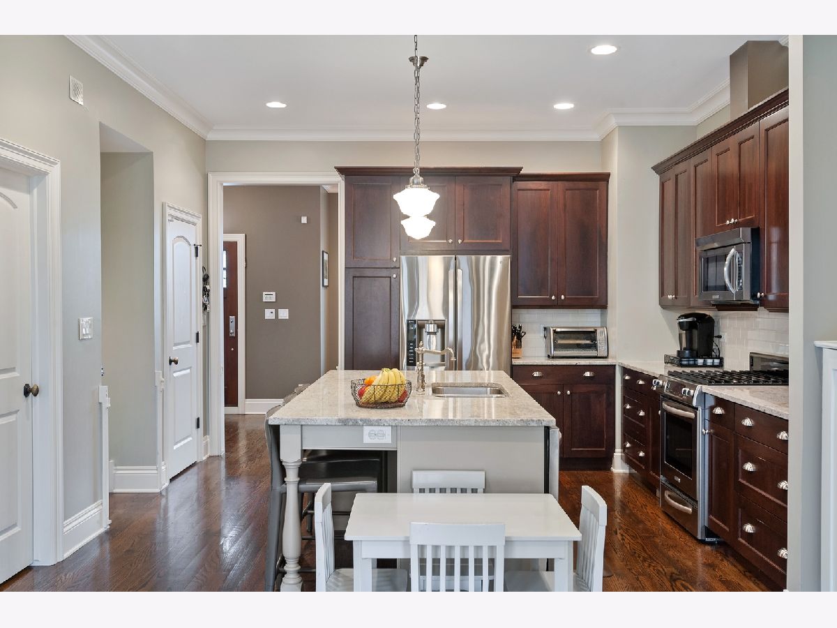 This Lincoln Square beautifully appointed extra wide solid brick & stone row home will not disappoint! One of the largest units in the complex, this fee simple home, built by well respected Mangan Builders, lives & feels like a single family home. Features include beautiful millwork, hardwood flooring, soundproof Milgard windows throughout, 2 car attached heated garage, plus a huge private deck w gas line for grill off the first floor kitchen/family room. (See floorplans under add'l info tab). First floor includes a spacious foyer, separate dining room, powder room & large designer kitchen with granite, high end stainless steel appliances & tile backsplash. Nice sized family room off the kitchen w/ fireplace & custom shelving. 2nd floor incl 3 bedrooms, 2 baths plus laundry room. Custom closets throughout. Master bathroom w separate steam shower, jetted tub, double vanity & heated flooring. Luxurious bathrooms with natural stone, granite, etc. Amazing lower level w large 4th bedroom, full bath & spacious living area. Mudroom closet off garage. Guest parking avail. Fabulous location - walk to el, Metra Wells, Chase, Winnemac & Horner Parks, library, LSAC, Lycee Francais, North Park Elem, McPherson Elem, Lill Street, fabulous restaurants & many of the new micro breweries! Easy to show.