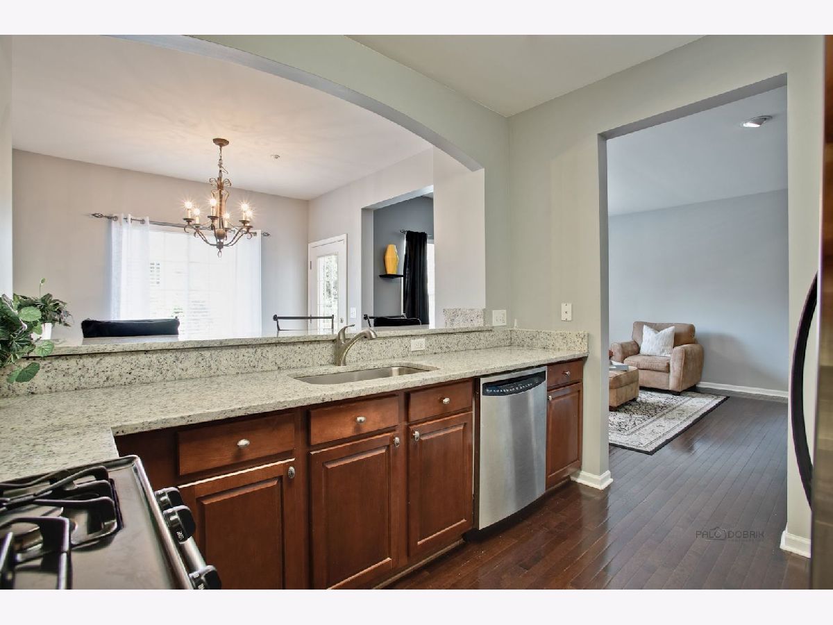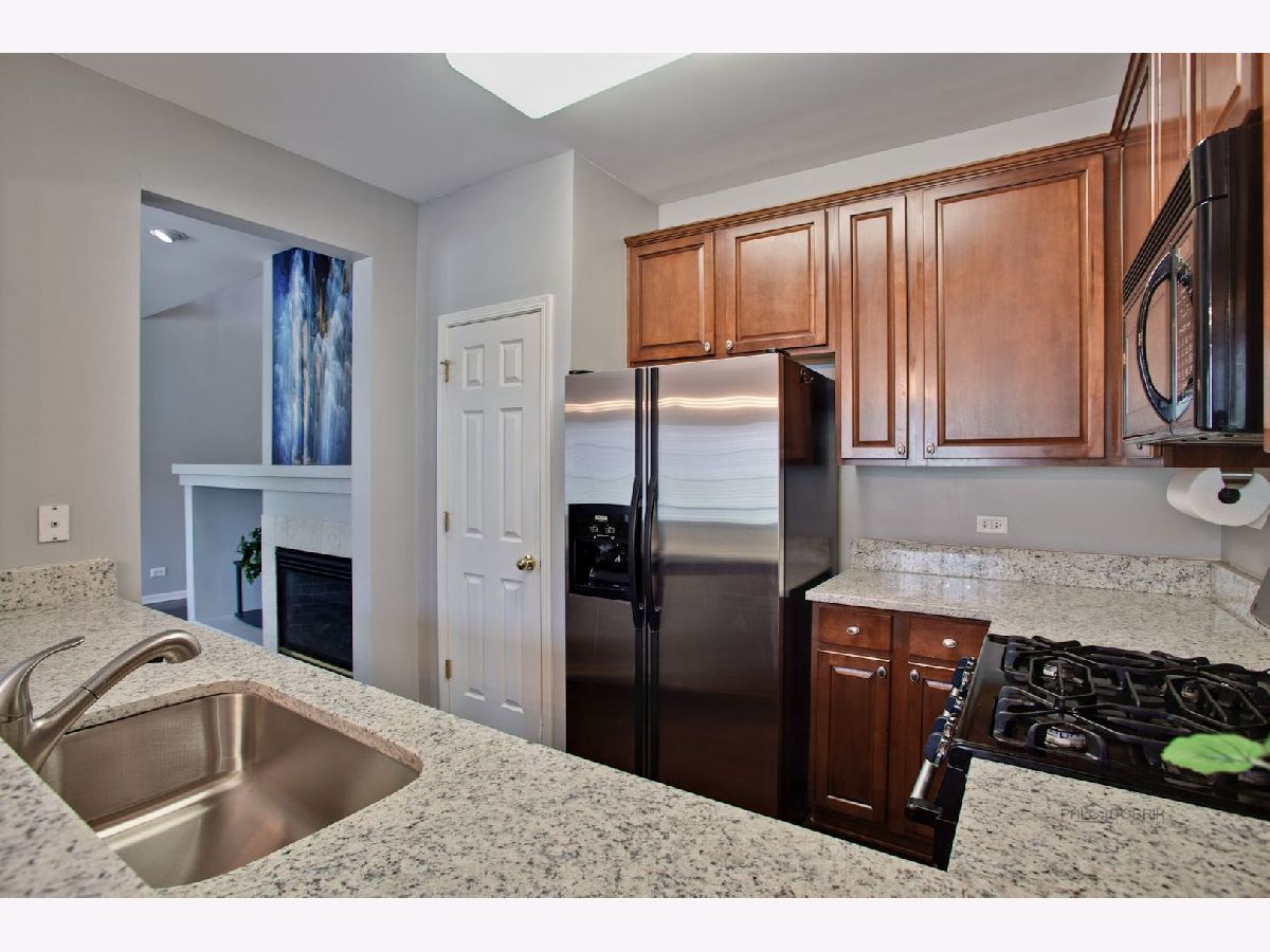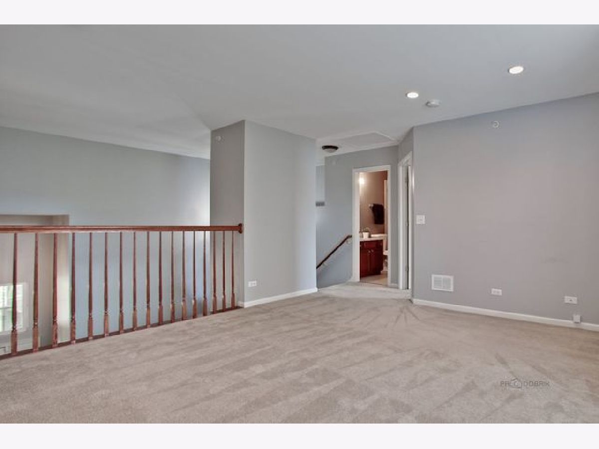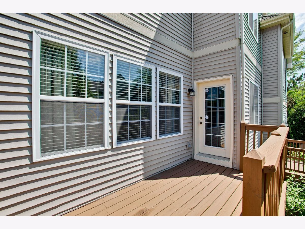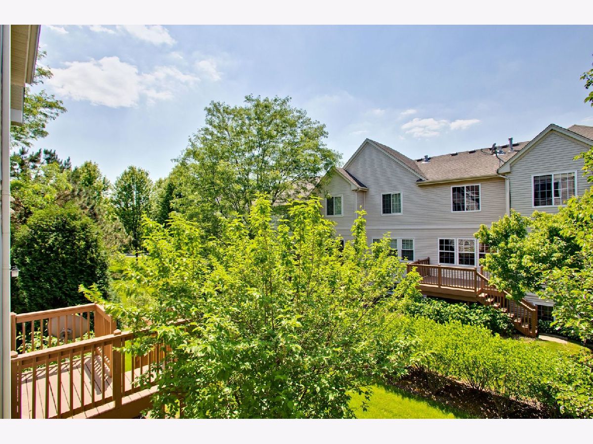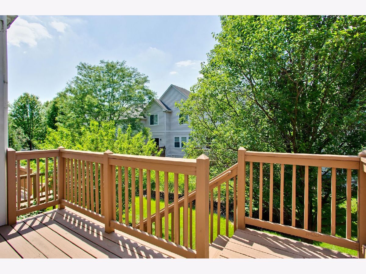 Move in condition unit with finished walk-out basement. Freshly painted interior 2020. Open floor plan with hardwood floors and fireplace. Kitchen with cherry style cabinets, NEW granite countertops and stainless steel sink, breakfast bar. Dining area with French door to extra large deck. Master bedroom with vaulted ceiling and generous walk-in closet, bath with double sink vanity, shower and soaker tub. 2nd bedroom with wall closet and large loft can be converted to 3rd bedroom. Easy access to I-90, shopping, and Metra. Playground and ball field in subdivision. Humidifier as is.