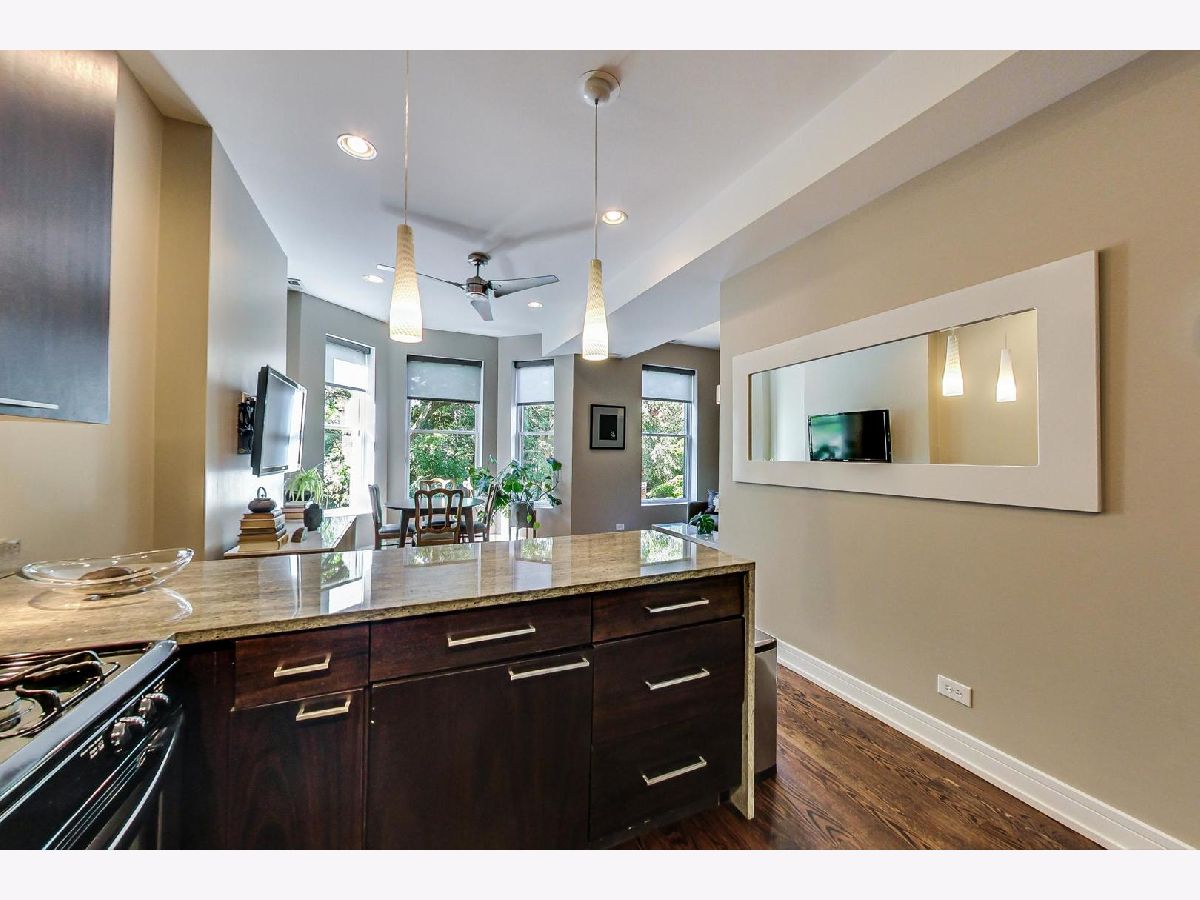 Stunning 2 bed/2bath in historic 3 flat. Inspired by clean, modern design. No expense was spared in this complete rehab in 2009. Chef's kitchen features beautiful waterfall granite counters, stainless steel appliances, 42" walnut flat panel cabinets, custom lighting and a breakfast bar that opens into the living space. The primary bedroom features custom organized closets and dresser. The attached bathroom has a tub/shower and a modern vanity. The second bedroom features all custom built in cabinets, closets and a murphy bed. Extra space in hall foyer is perfect for a desk. Oak hardwood floors thru-out. The 2 marble baths have travertine & stone plank flooring. Large back deck has lots of light and city views. There is shared landscaped back yard; perfect for dog owners. Private storage in basement and parking spot included!