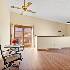 Inviting 2nd floor end unit penthouse that has been beautifully updated with new: vinyl plank flooring; carpet; paint; and kitchen sink, countertops, and backsplash. Tall ceilings accentuate the open floorplan. Spacious living room flows seamlessly into dining room and kitchen. Kitchen has plenty of cabinets and good workspace and newer appliances. Convenient laundry room off kitchen with full sized washer and dryer. Nice sized deck with privacy for grilling or just relaxing. Large primary suite with walk-in closet and shared bath with private vanity and sink in primary suite. Generously sized 2nd bedroom or great work from home space. 1 car garage with storage closet and exterior space for 2nd car. Woodgate community offers pool, clubhouse, tennis and more. Lawn care, snow removal and exterior maintenance is also included. Home is move-in ready, affordably priced and is being offered "as is".